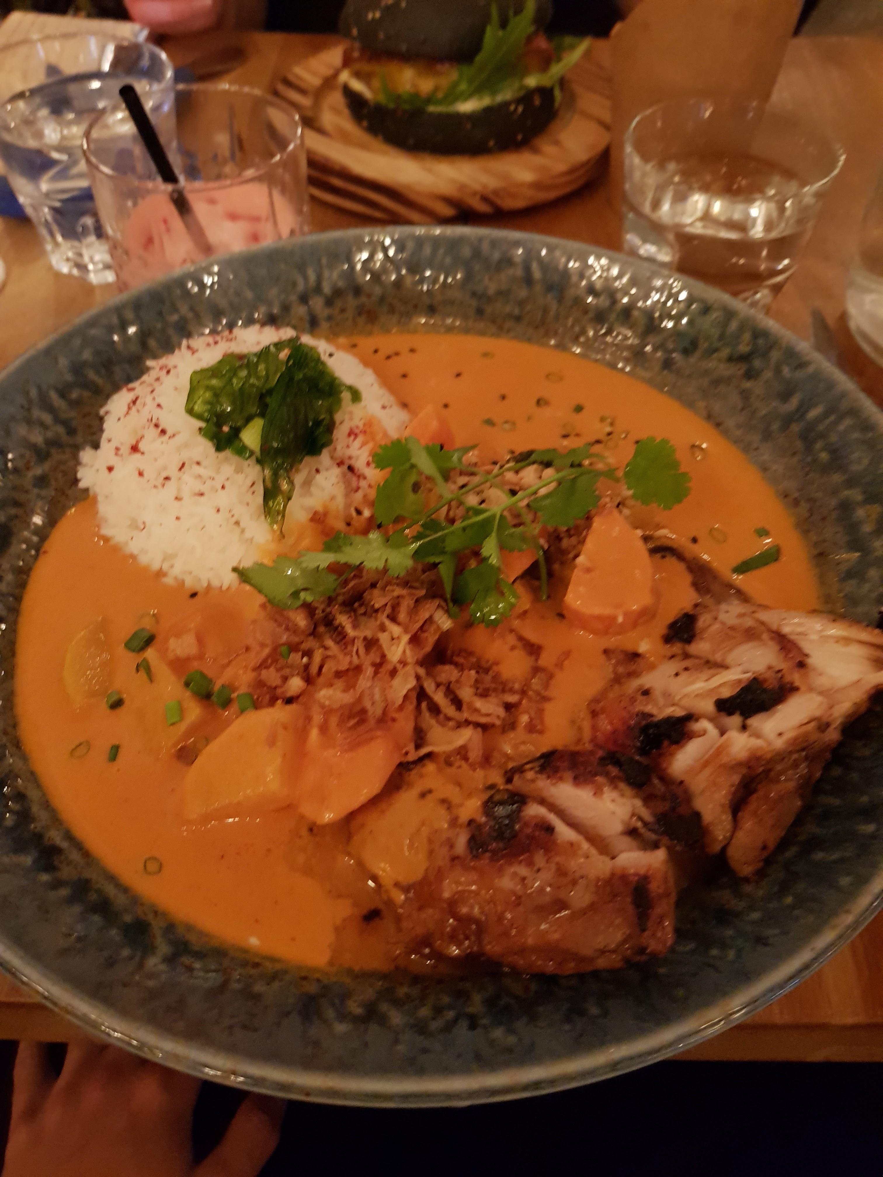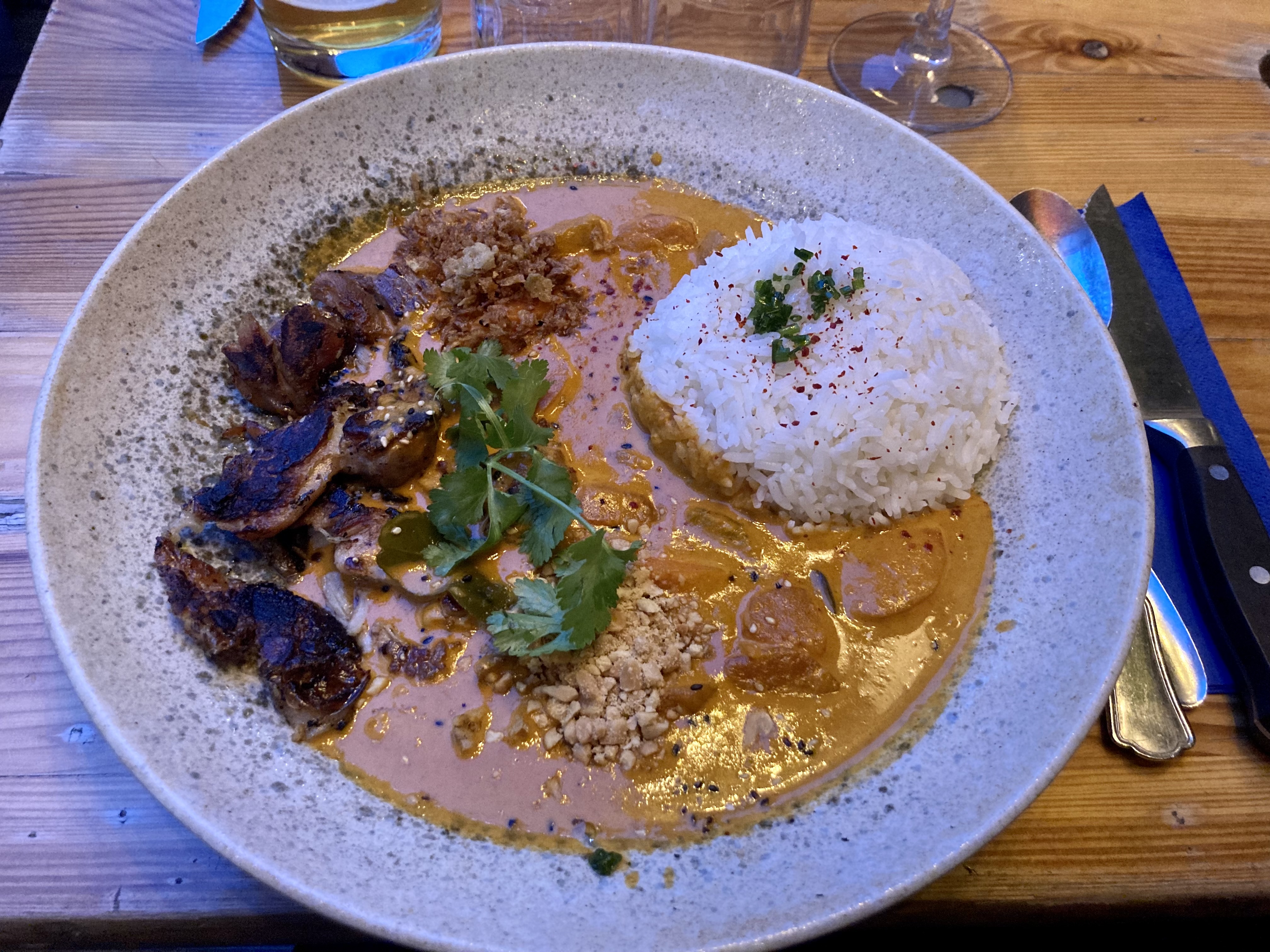Nous avions prévu de manger coréen mais malheureusement ou heureusement il est fermé le lundi. Nous voilà devant cette chaleureuse petite cantine sans menu devant l'entrée. L'endroit faisait envie donc pourquoi pas. Le serveur nous a renseigné et conseillé sur notre plat découverte. Je donne un 18/10 au massaman (j'espère ne pas écorcher le nom) j'aurais donné 20 mais il y en avait beaucoup trop. C'était délicieux. Je vous invite tous à vous y rendre... C'est trop bon 🤤 Bon appétiiiiiiiiiiit.