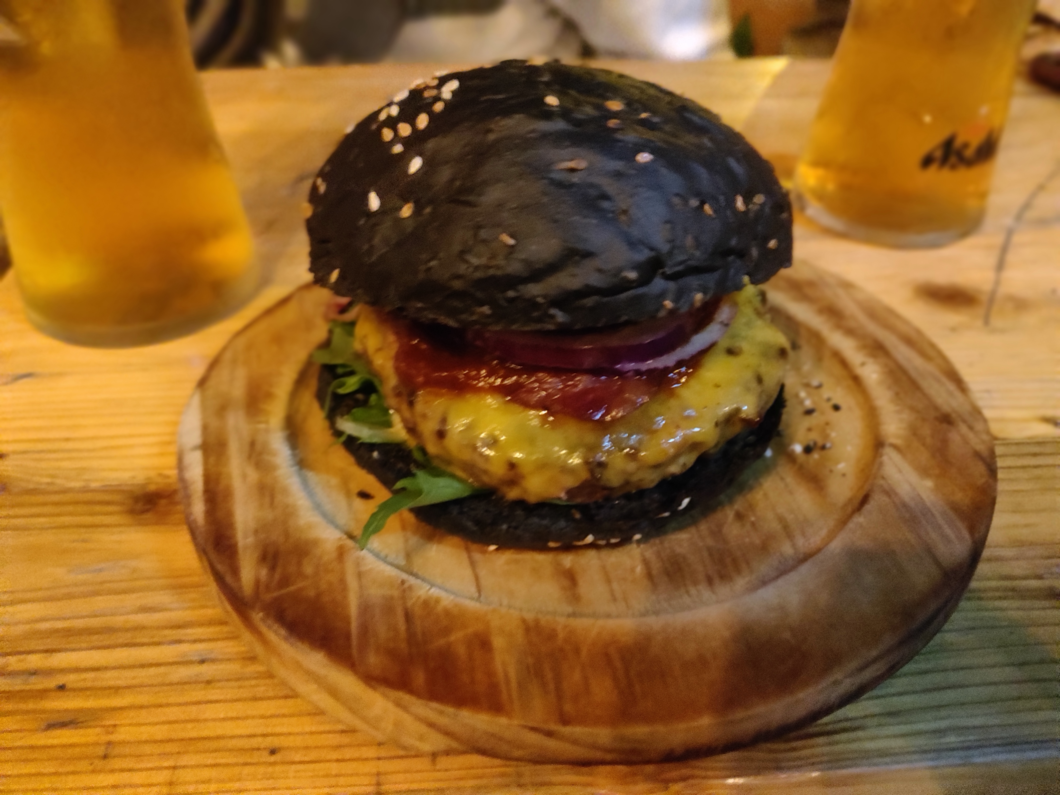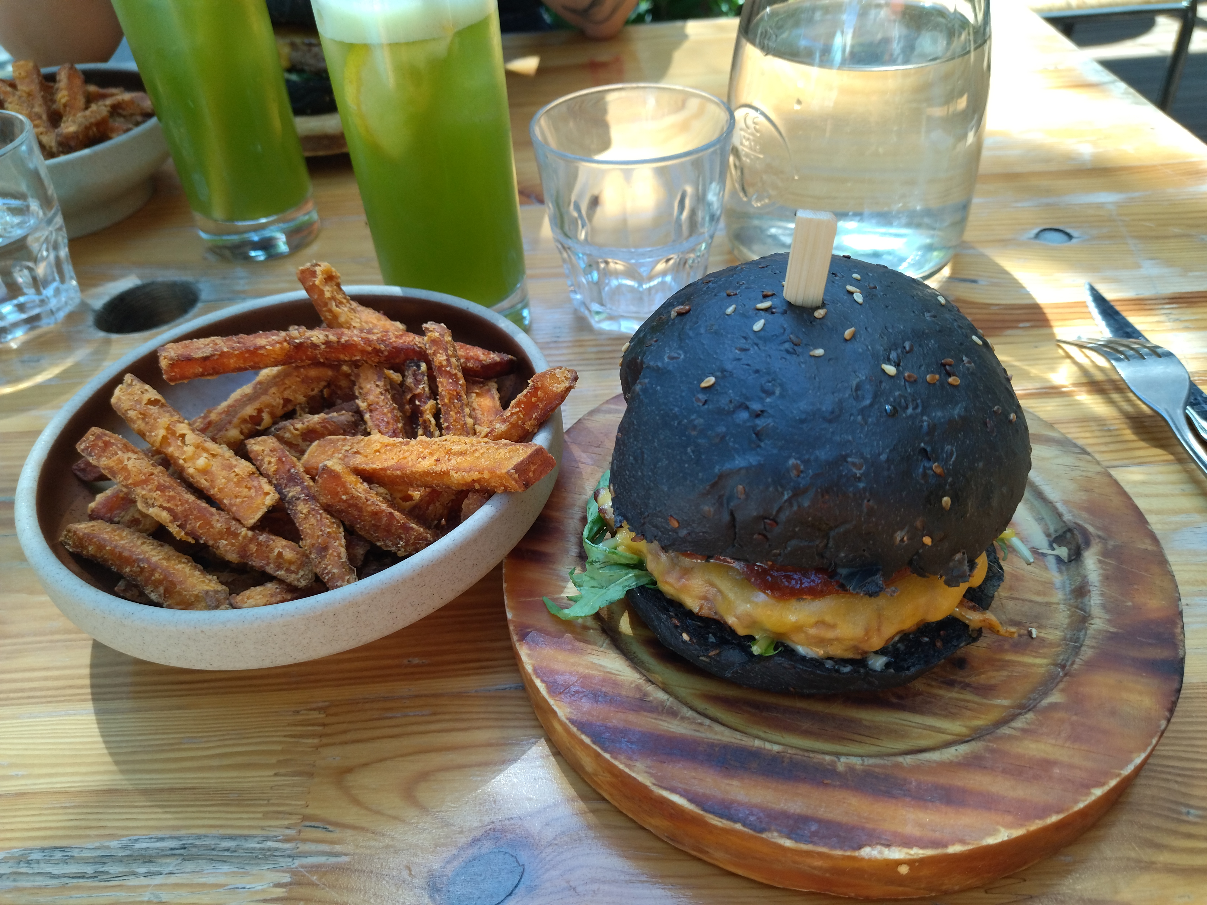 Un délicieux bobun, copieux et varié ! Et vous pourrez tester le burger avec le pain au charbon végétal qui donne donc une couleur noire au pain.
