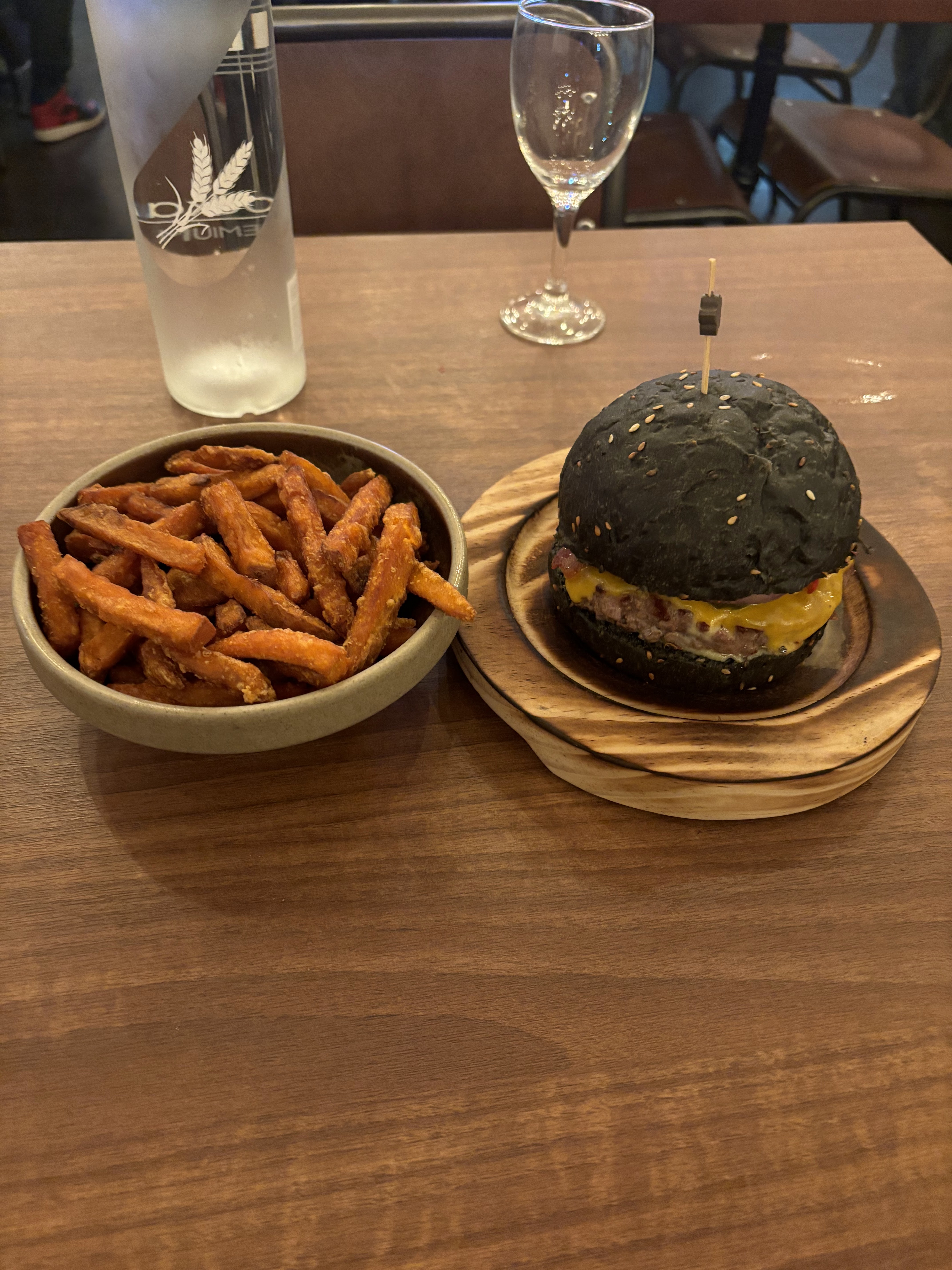 Très bon burger 'black' avec feuille d'or pour les 3 ans du restaurant, pas fan des patates douces perso après. Mais bonne expérience.