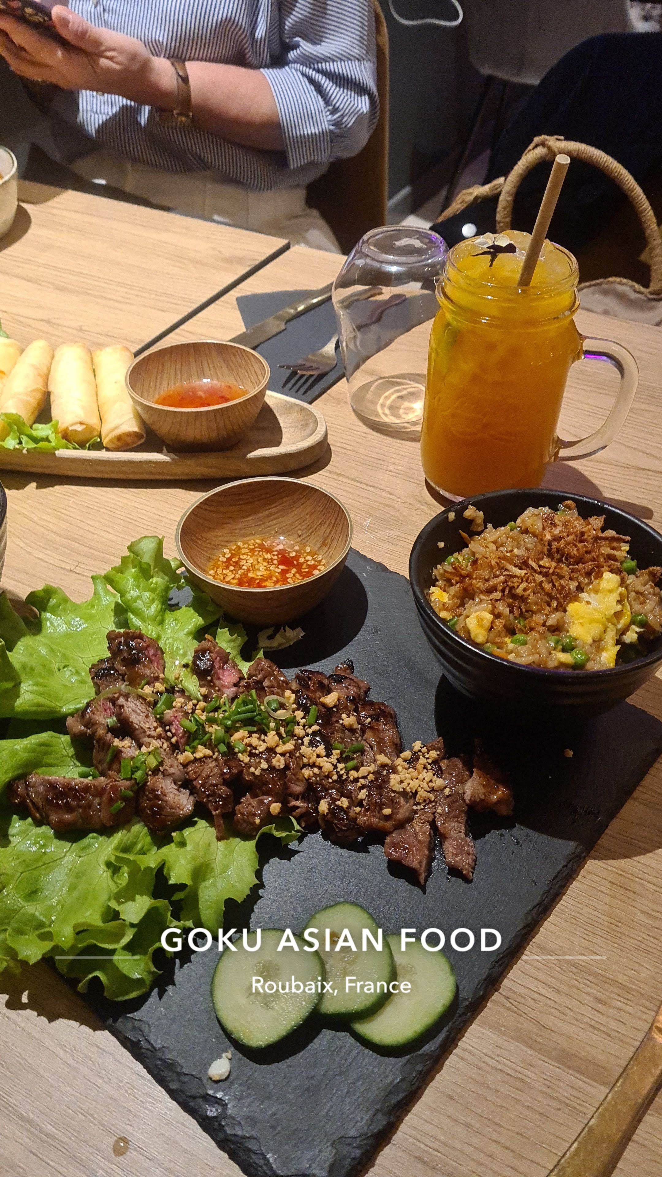 Bonjour je suis venue manger avec des amis et famille, nous avons trouver le cadre accueillant et Instagramable , quand on y rentre on se sent bien cet aspect du restaurant asian fusion unique dans son genre dans le Nord. les entrées incroyablement bon et les plats un délice surtout les tigres qui pleurent ? il a donné de l'émotion à mon estomac qui m'a laissé un agréable souvenir gustatif je reviendrais chez goku à coup sûr ? chez vous compter sur moi ! à bientôt goku asian food. signer antoine