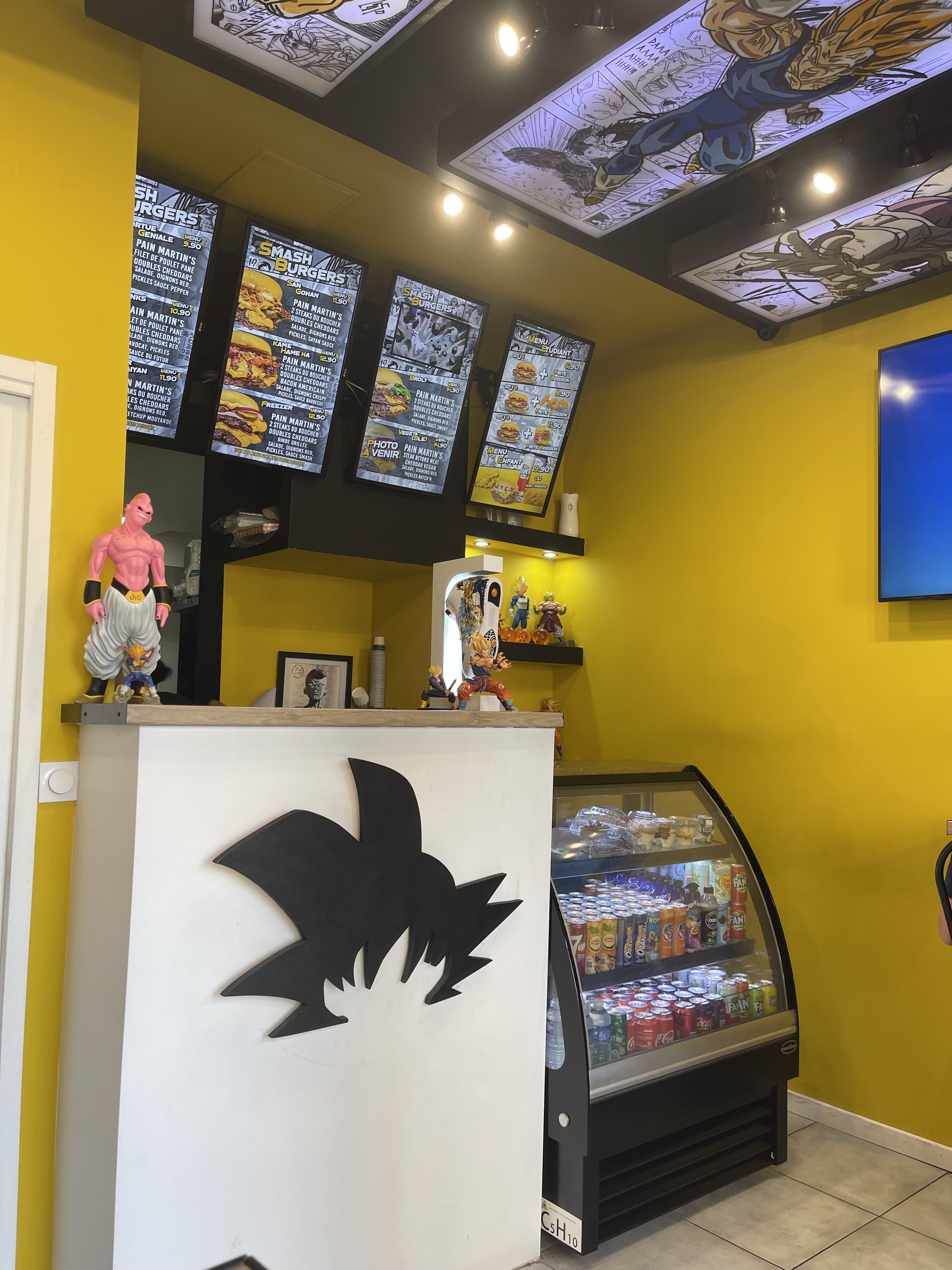 Accueil tres sympa, pour les fans de Dragon Ball pour la déco bien évidemment,burger excellent, frite excellente bonne proportion, salle trop petite pour manger sur place si vous êtes nombreux, mais vous pouvez y aller les yeux fermés j'y retournerai pour tester les autres burger.