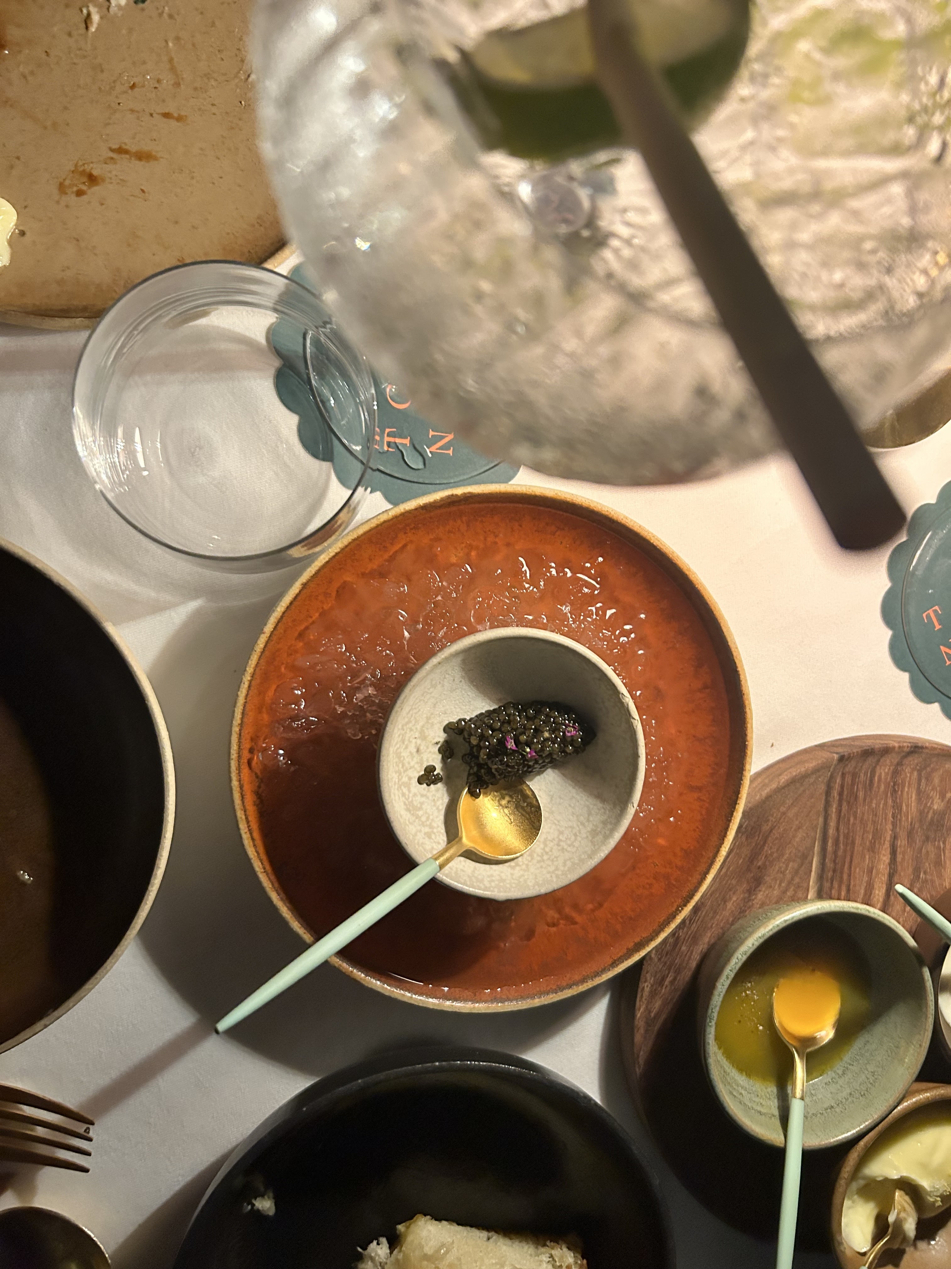 Flan de poutargue, ceviche de bar au lait de pois, galettes de banane & caviar… quelques combos merveilleux. Cadre absolument époustouflant de Martin Brudnizki.