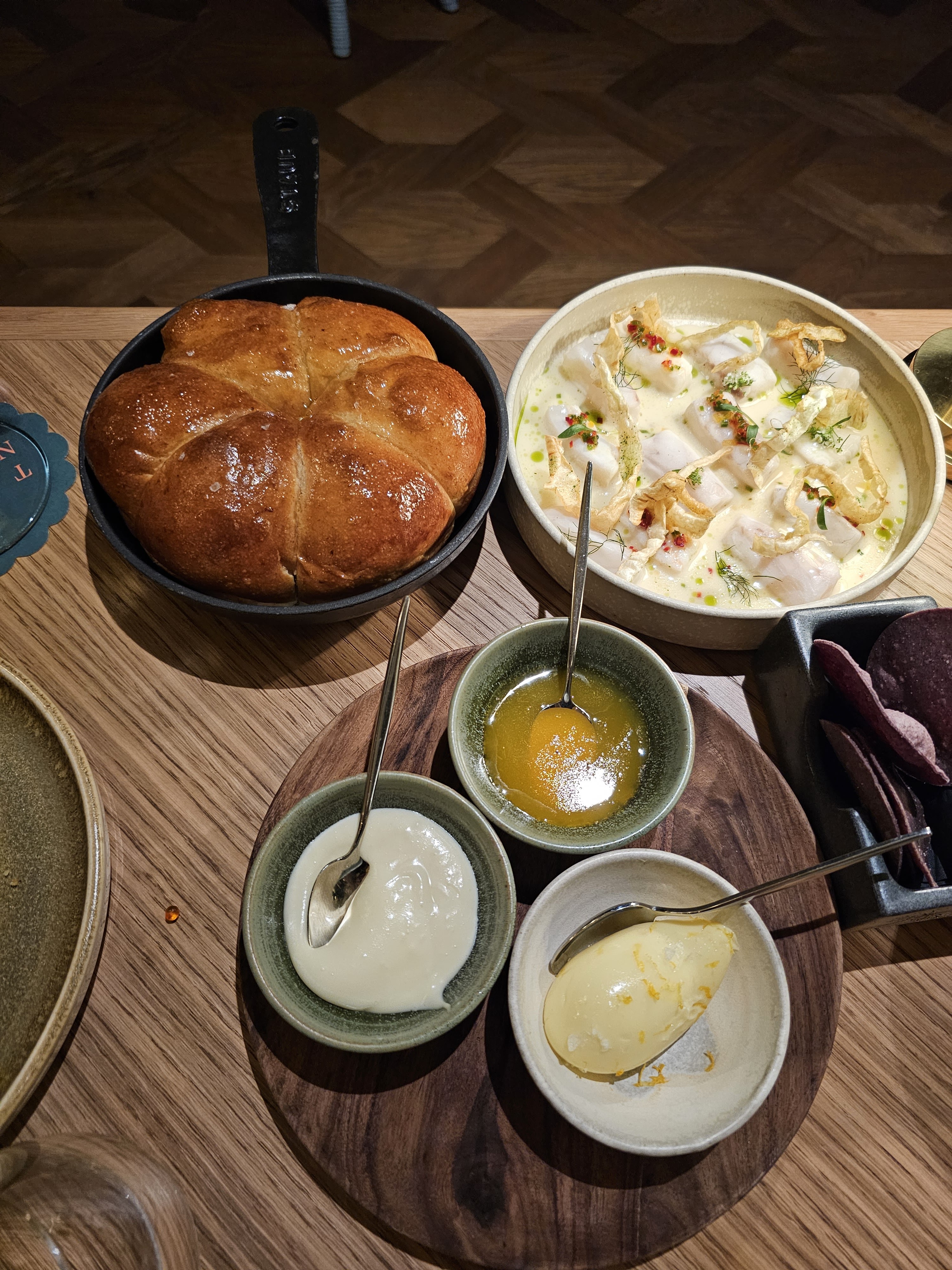 Bref, une cuisine excellente avec un service irrégulier. Nous avions une réservation à 20 heures, il nous a fallu 35 minutes à partir du moment où nous nous sommes assis pour prendre l'apéritif au pain de maïs et 45 minutes avant que la bouteille que nous avions commandée n'arrive sur la table. Les gens à notre gauche sont arrivés, ont commandé leur vin et l'ont eu pendant que nous attendions, ce qui était dommage. Nous avons demandé au personnel à ce moment-là et ils m'ont dit que cela venait avec la nourriture que nous avions commandée, ce qui semblait étrange. Le restaurant semblait avoir une capacité d'environ 50%. À partir de là, la nourriture est arrivée en deux vagues et était délicieuse. La tarte au riz croustillant et aux champignons était le point culminant. Le dashi avec le riz était génial. L'huile de piment pourrait être beaucoup plus épicée et fade. Tout est très abordable, mais je ne pense pas y retourner en raison du mauvais timing de l'expérience. Détail très mineur, mais les tables semblent trop grandes pour le coin canapé dont elles disposent, ce qui provoque un déplacement un peu gênant des tables si jamais vous souhaitez sortir pour aller aux toilettes.