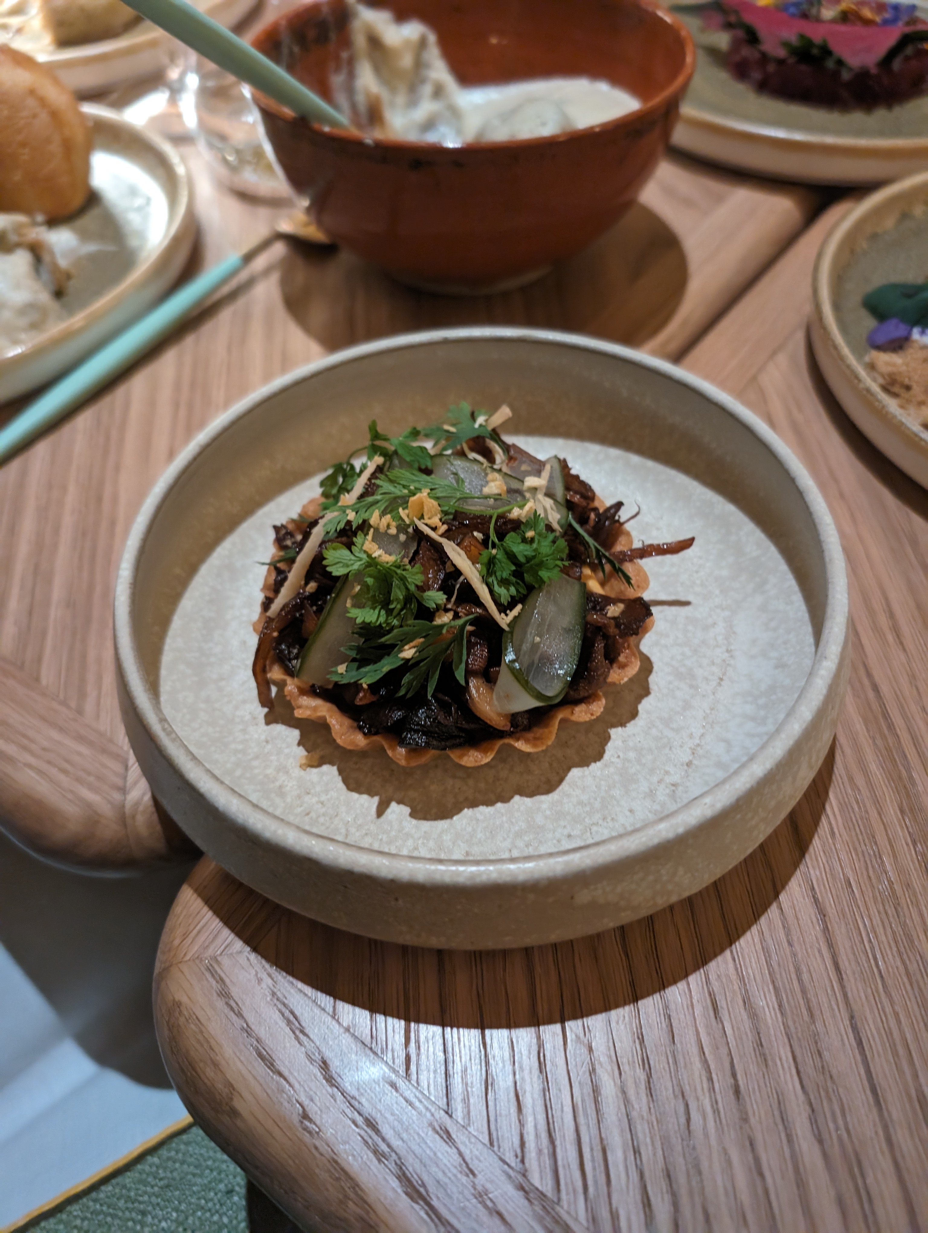 J'ai tout aimé de cet endroit. La déco décalée. Le service aimable et attentionné et la nourriture absolument époustouflante. Côte ouest, ambiance Los Angeles avec beaucoup d'influence asiatique mais une nouvelle approche moderne. Les petits pains à la fécule de pomme de terre avec condiments étaient délicieux. La tarte aux champignons était jugée presque aussi bonne que le sexe. C'était trop bien. Chanterelles, shiitake avec mayonnaise au chili et cornichons sur croûte de sable. Le tartare de thon aux betteraves, Kim chi et shiso étaient bien équilibrés et surprenants. Un plat de pommes de terre avec des oignons frits était le plat réconfortant parfait. Les crêpes à la banane avec du sirop de soja, une sauce Koji au lait sucré et du caviar étaient très bonnes, mais plutôt un article de style brunch. Je n'ai pas apprécié l'okonomiyaki, mais mon entreprise l'a adoré. Les desserts étaient également excellents. Grandes portions. J'ai eu le kakigori à l'orange qui était le préféré de la table avec une glace moelleuse et crémeuse à l'orange, de la glace aux abricots et une sauce aux fruits de la passion. Miam. Le dessert au chocolat a également été très apprécié. Dans l’ensemble, c’est l’un des meilleurs repas que j’ai eu depuis très longtemps. Fortement recommandé et bien qu'un peu cher - très bon rapport qualité-prix.
