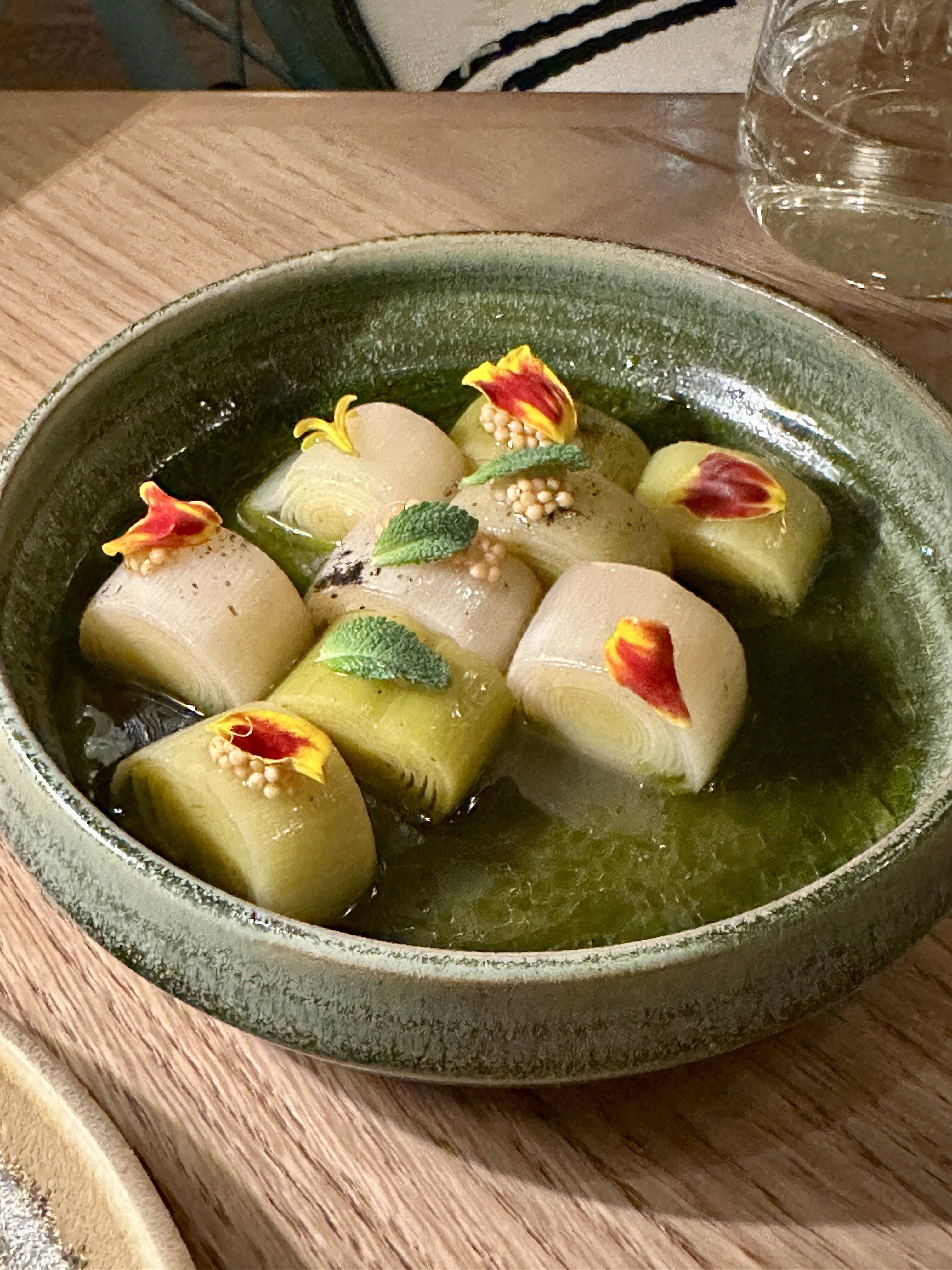 Très belles assiettes avec une cuisine créative et de bons produits notamment légumes . J ai adore les poireaux et le lieu façon fish and chips revisitee Les plats sont inventifs , poétiques et très joliment réalisés A recommander vivement pour les gourmets végétariens ou poissons . La serveuse , bien que vraiment adorable était très difficile à comprendre ( accent et français encore hésitant )et pas très professionnel sur les vins notamment . C est dommage car le menu et les plats ont besoin d accompagnement au service , je trouve . Je connaissais Dominique Crenn par San Francisco et ses livres donc cela ne m a pas dérangé mais j ai trouvé cela dommage . La déco a paru vieillotte à certains de nos invités . L ambiance était conviviale malgré une musique de fond un peu trop forte pour nos standards français … On se croyait à New York ..toujours trop fort pour nous surtout lorsqu on est nombreux autour d une table . Le vin était trop cher . Je recommande et je reviendrai !!!