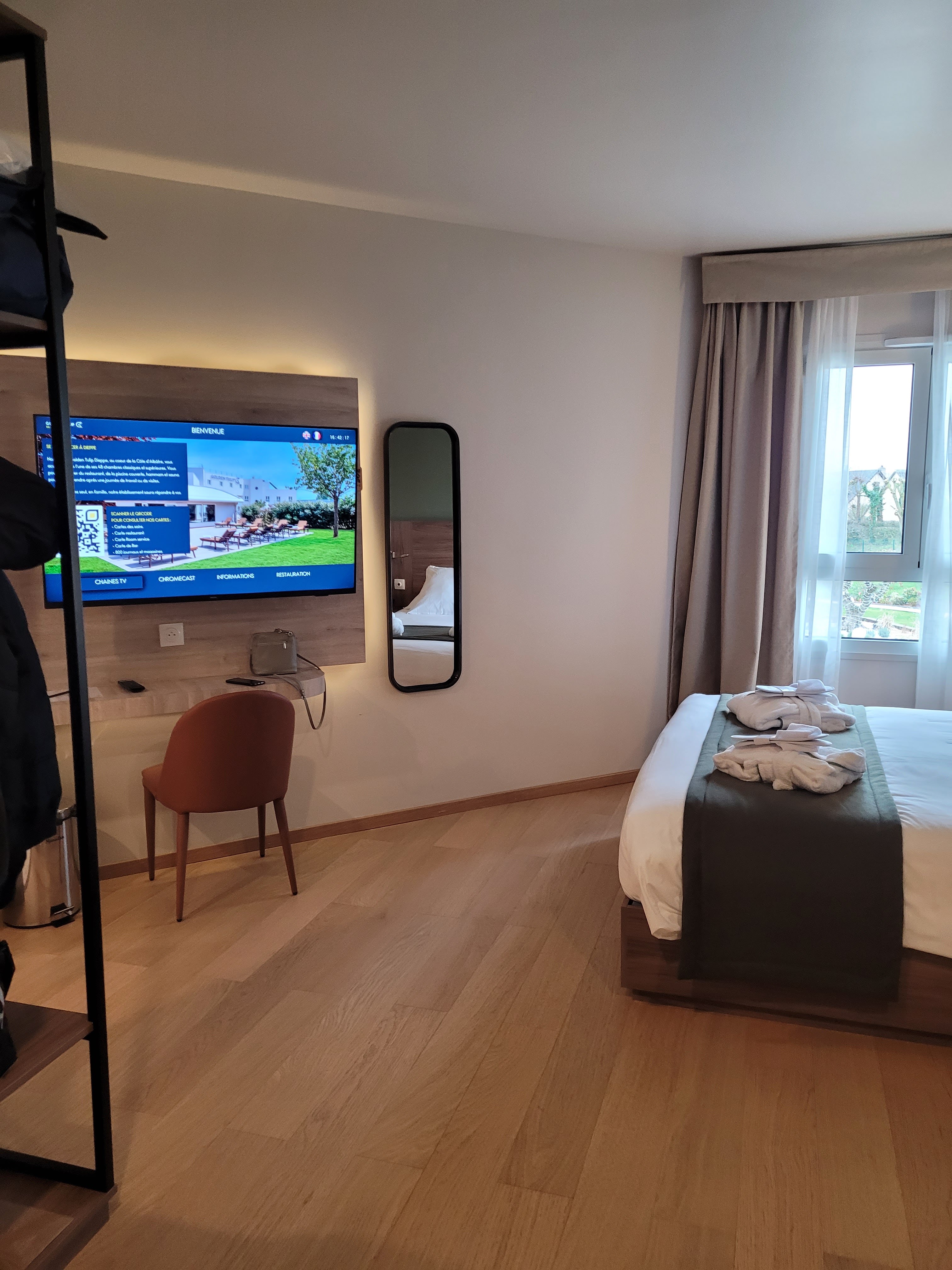 Très bel hôtel avec un bon accueil, les chambres sont très propres et très modernes avec une Télé connecté et on peut régler l'intensité de la luminosité led derrière la télé et celui du cadre miroir de la salle de bain avec un tactile directement intégré au miroir, cela est agréable. De plus est offert un kit hygiène bien complet au cas où vous auriez oublié les vôtres (brosse à dent dentifrice, peigne, coton tige, savon, crème), la piscine est agréable et à bonne température, le sauna ne fonctionnait pas au départ mais cela c'est remis en marche et le Jacuzzi était en maintenance mais je n'en leur tiendrai pas rigueur, le Hammam ainsi que la Piscine font du bien. Le Petit déjeuner n'est pas donné, mais c'est un buffet à volonté de qualité tels que du saumon ou des fruits diverses et variées de qualité, donc cela rééquilibre la balance entre le rapport qualité prix. Il est préférable de réserver directement sur le site de l'hôtel et s'y inscrire gratuitement, pour bénéficier de la réduction tarif membre de 10%. Si vous passez les vacances près de Dieppe c'est un endroit idéal pour se détendre, et je le recommande sans hésiter, et j'y retournerai quand j'en aurai l'occasion.