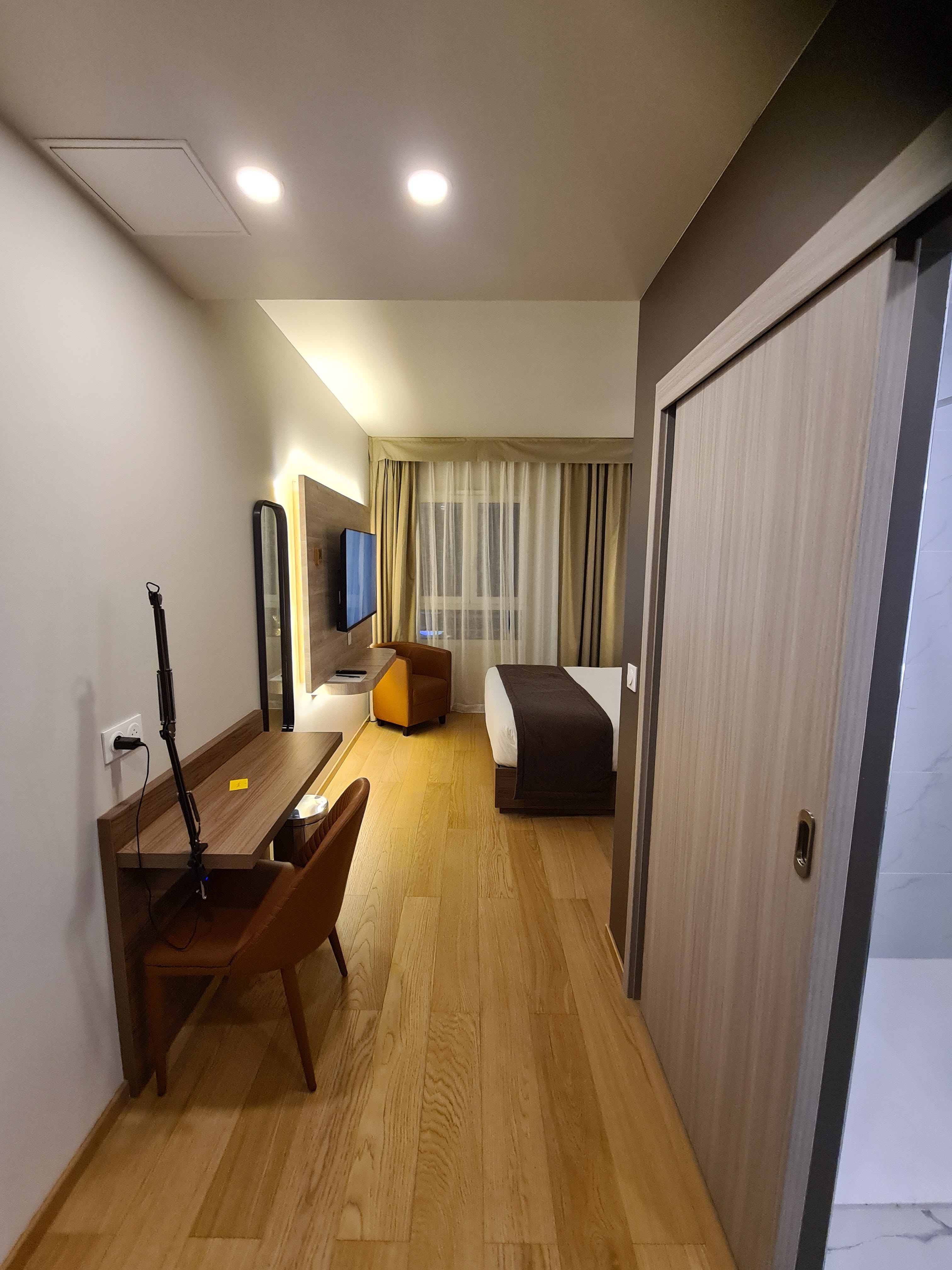 Court séjour ...et pas eu le temps de profiter de la piscine ...sauna ..etc... Rideaux occultants dans la chambre ...qui laissent cependant filtrer la lumière des néons extérieurs sur les côtés et le haut ...assez gênant quand on aime l obscurité complète pour s endormir !