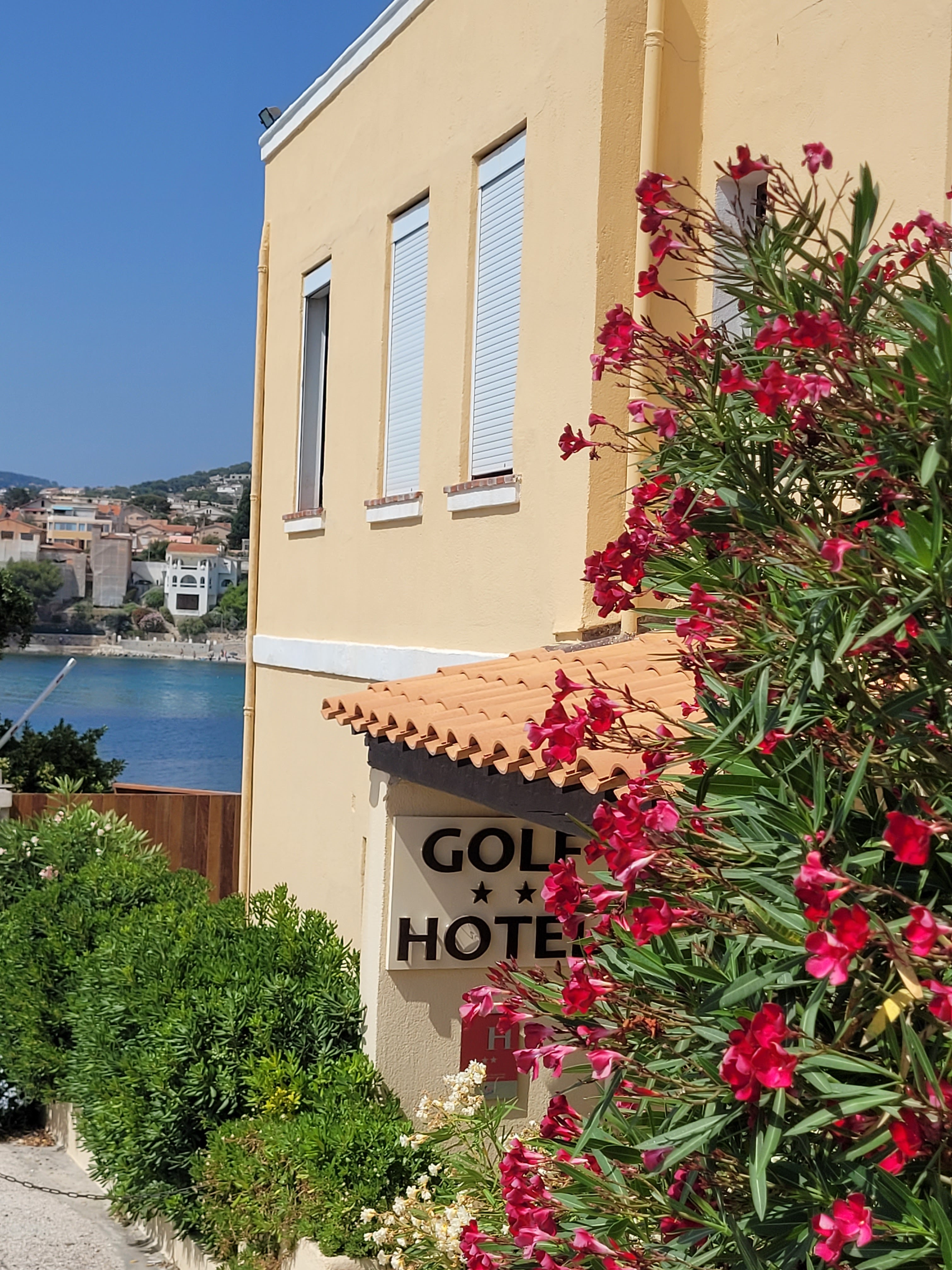 Super séjour (9 jours) au Golf Hôtel de Bandol : emplacement idéal (au pied de la baie de Renécros), chambre très propre (nettoyage chaque jour et jusqu'à 15h), personnel adorable (mention spéciale pour la jeune femme qui nous apportait le petit-déjeuner chaque matin !), service au top, bref, ma soeur jumelle et moi n'avons qu'une hâte, y retourner l'an prochain. Nous avons réservé la chambre quadruple (1 lit double + 2 lits individuels dans 2 pièces séparées) avec balcon et vue sur la mer. Plusieurs très bons restaurants juste à côté. Le port et la ville de Bandol sont accessibles à pieds (10 min de marche). Je recommande vivement ! Merci encore à toute l'équipe du Golf Hotel, vous avez mes 5 étoiles !! (Sandrine - une des 2 jumelles ;-))