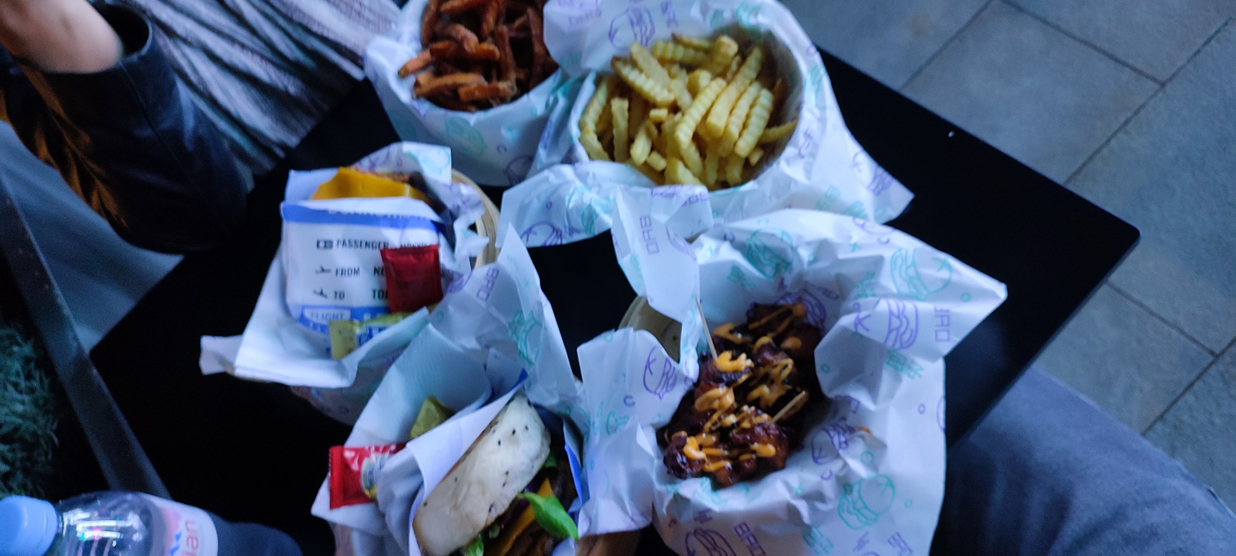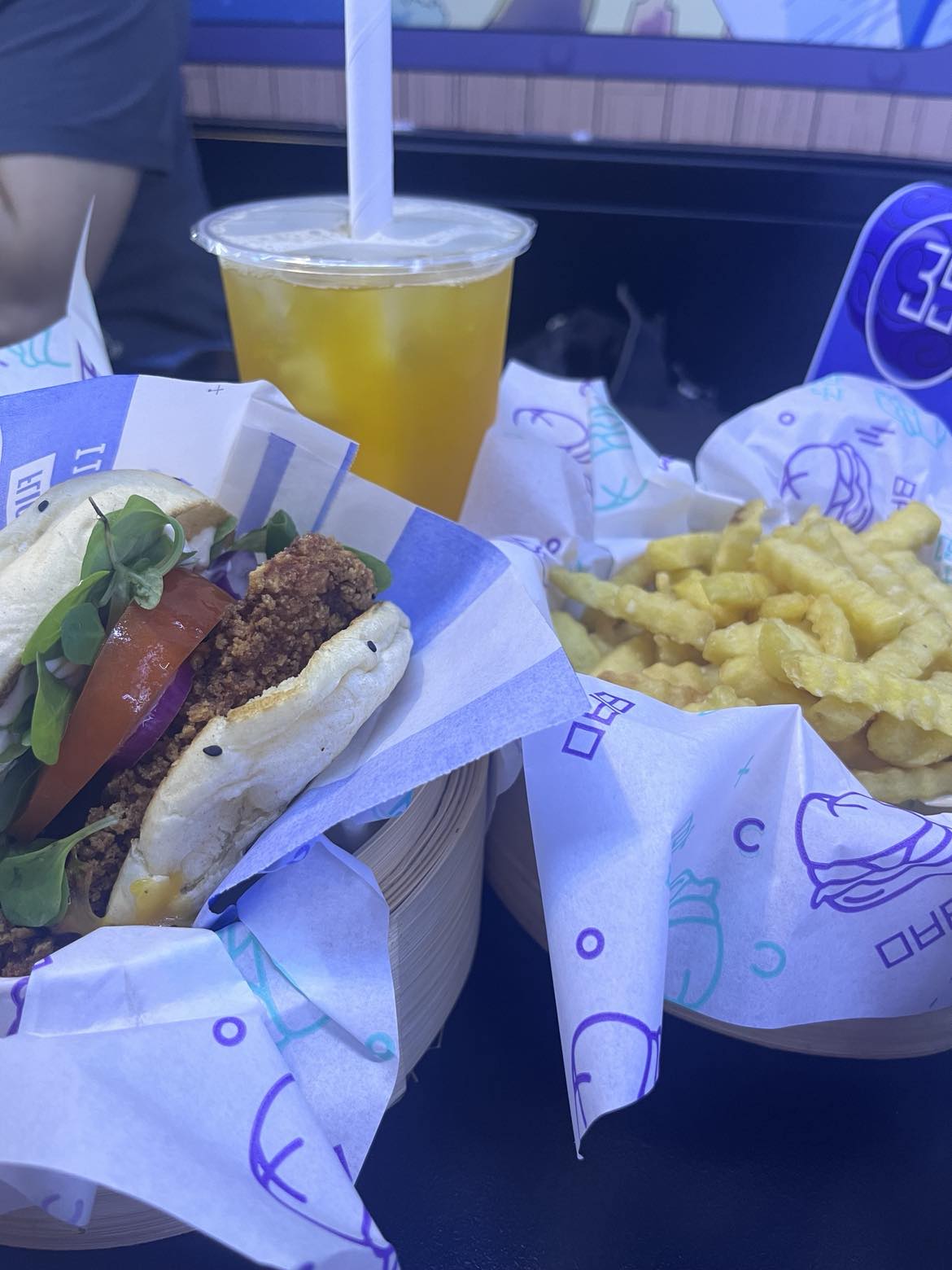 Nous avons terminé de passer notre commande à 14h20, 2 menus, 2 Bubble Tea et du poulet : 50 €. Si la qualité est là pourquoi pas. Le service et l’ambiance c’est vraiment pas ça, ça se moque des clients dès qu’ils ont le dos tourné. Traine des pieds. Réponds de manière très sèchement au peu de questions que les clients pose. Monte le son de la musique à fond, au point de ne plus s’entendre parler. 15:10 nous avons enfin notre commande… Le positif arrive enfin nous mangeons. Les burgers Bao sont délicieux, Sur deux barquettes de frites qui vont avec le menu, une seule a été mangé tellement les burgers sont consistants. Le poulet avec la sauce par-dessus est vraiment incroyable à prendre obligatoirement. Notre seul bémol sont les Bubble Tea, mal dosé, et du coup, beaucoup trop sucré que nous n’avons pas bu. En conclusion, si tout était à la hauteur de la qualité de la nourriture, ça ne m’aurait absolument pas dérangé de payer 50 € mais entre l’ambiance et le temps d’attente, cela devient compliqué.