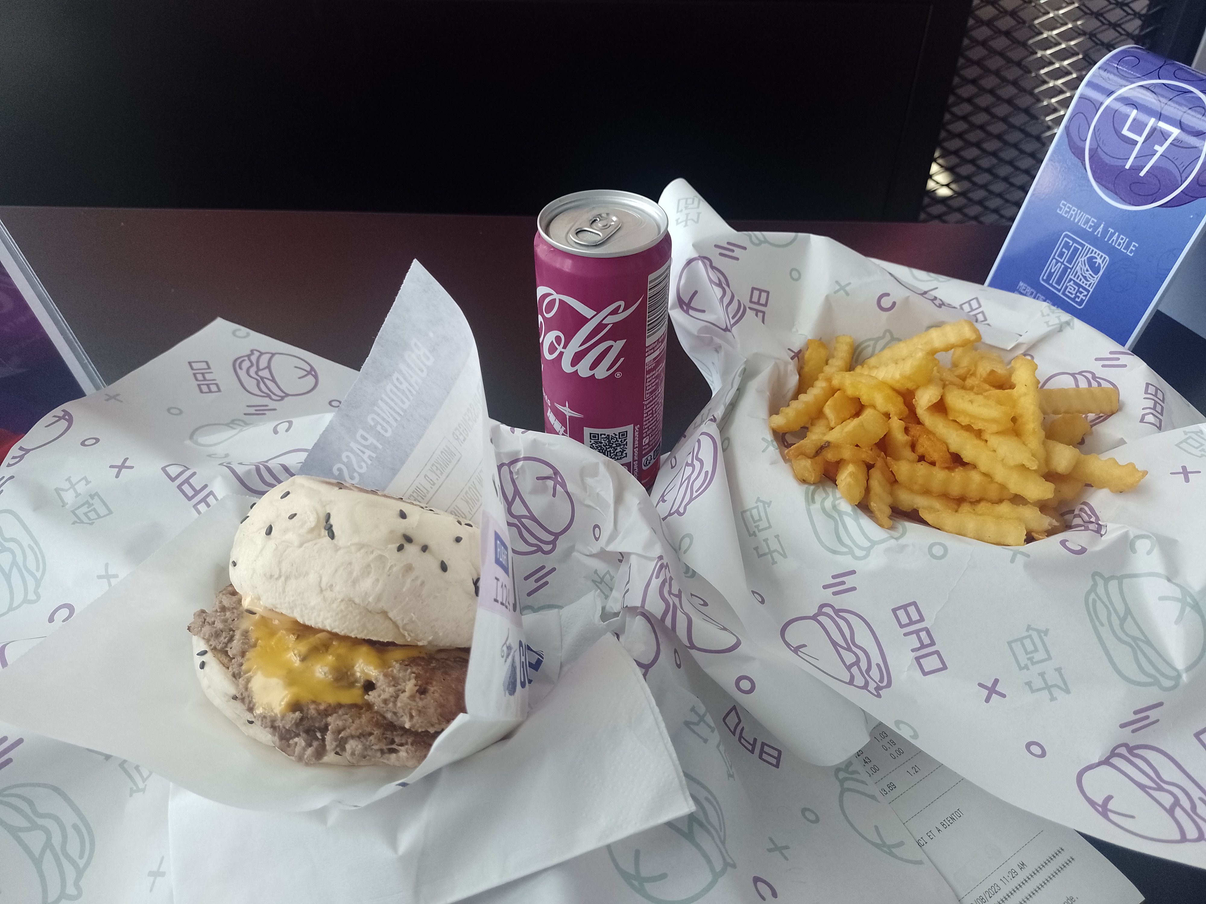 Les burgers sont très bon👍 Cependant environ 17-20€ environ pour un menu avec frites boisson burger pour la qualité fast-food je trouve ça un peu cher👎 L'étoile en moins est pour '' l'hygiène '' du lieu on a mangé a l'extérieur car a l'intérieur les tables sont crados et ne parlons pas des vitres et des bornes 👎❌ Le dessert Bao au Nutella ... J'ai cherché le Nutella c'était très sec 👎 Mon copain a pris un burger au poulet et il m'a dit qu'il était vraiment délicieux 👍🙃