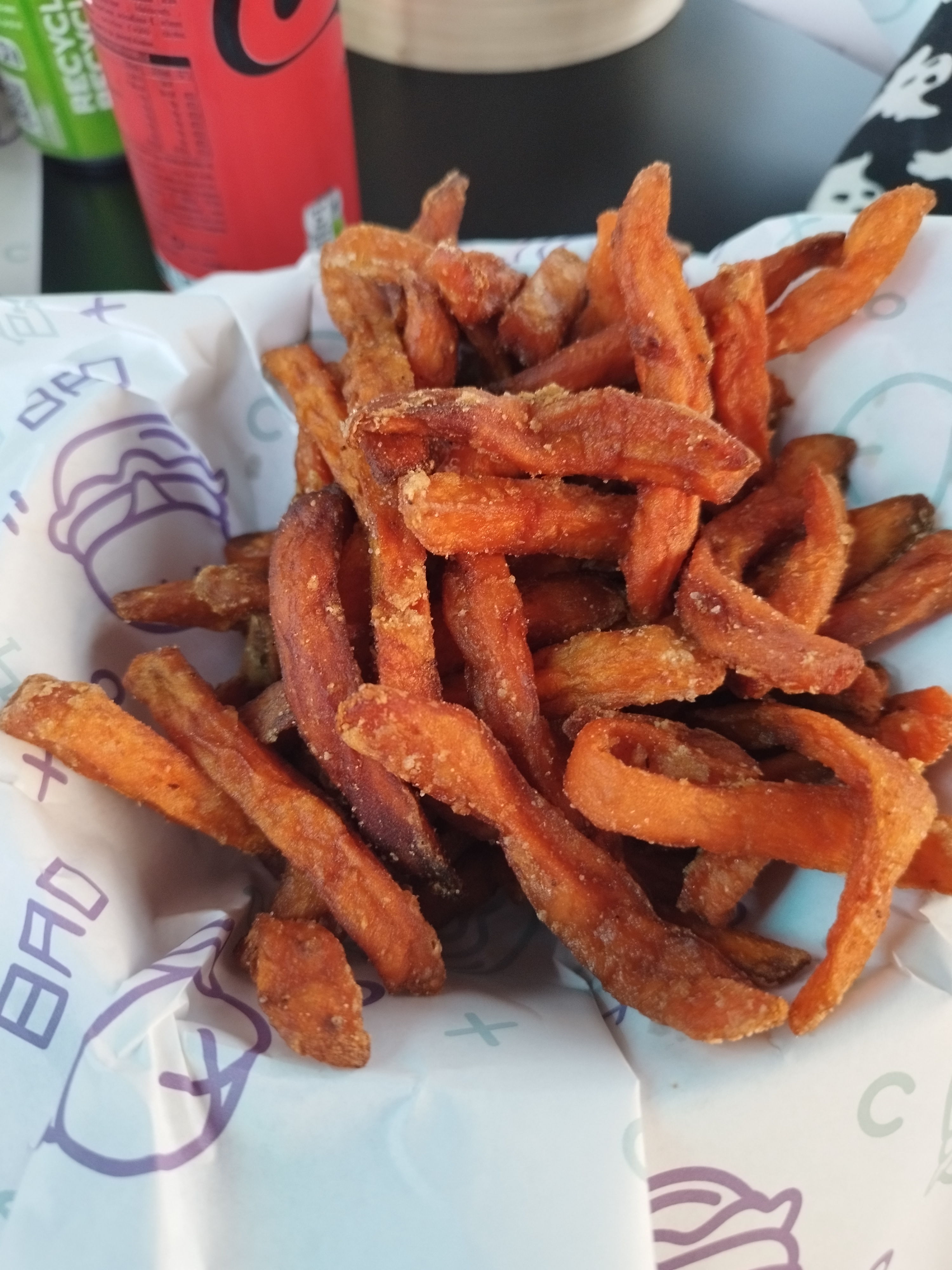 On a été servi dans des plat a emporté il y avait pas de musique et le peu de temps où on la eu elle était super forte. Les frite de patate douce été sur cuite