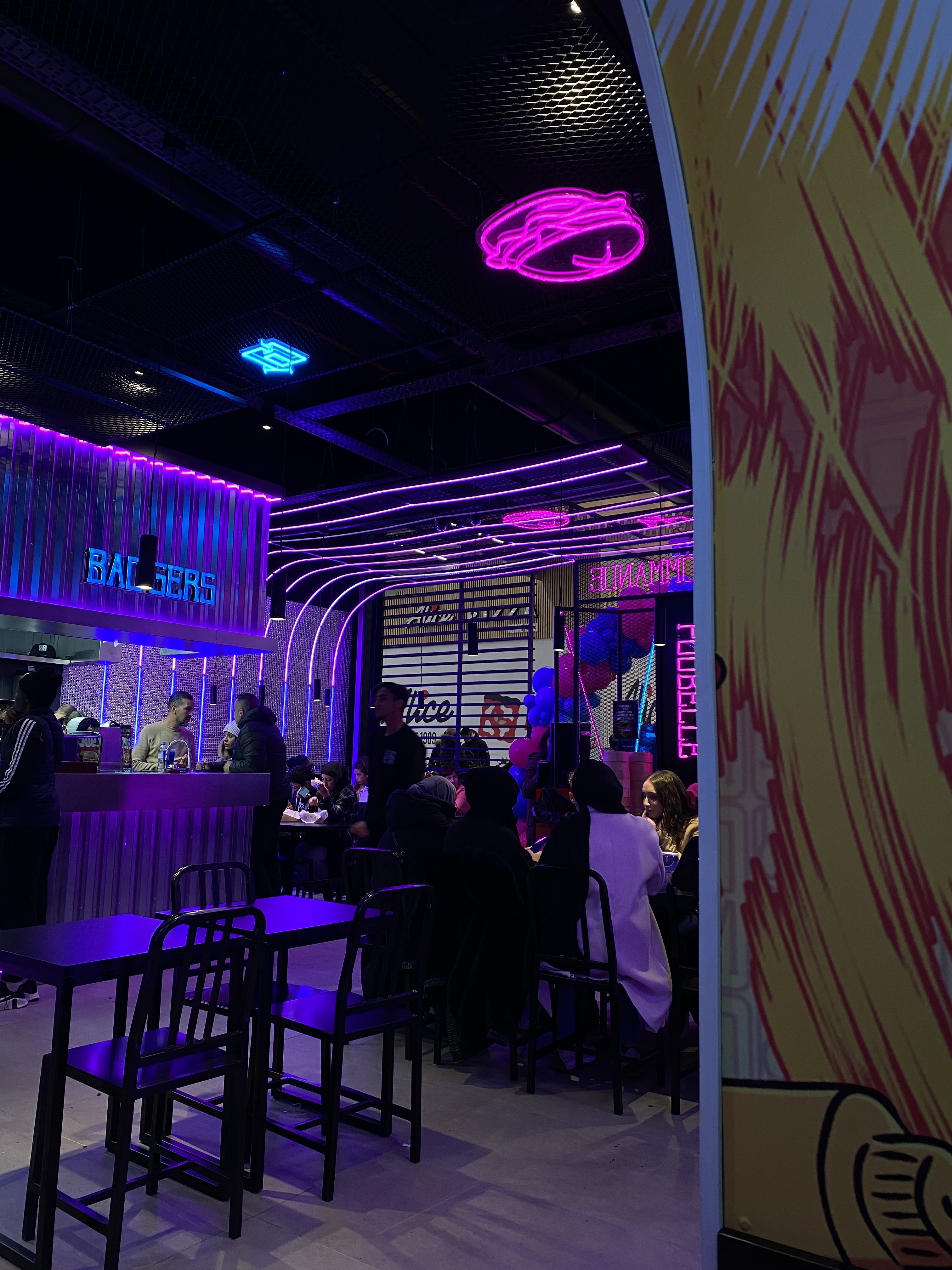 Super restaurant / fast food. La deco est tres moderne, les neons et les couleurs flash donnent une ambiance bien propre au lieu. On y mange tres bien, ça change des autres fast food ! Foncez !