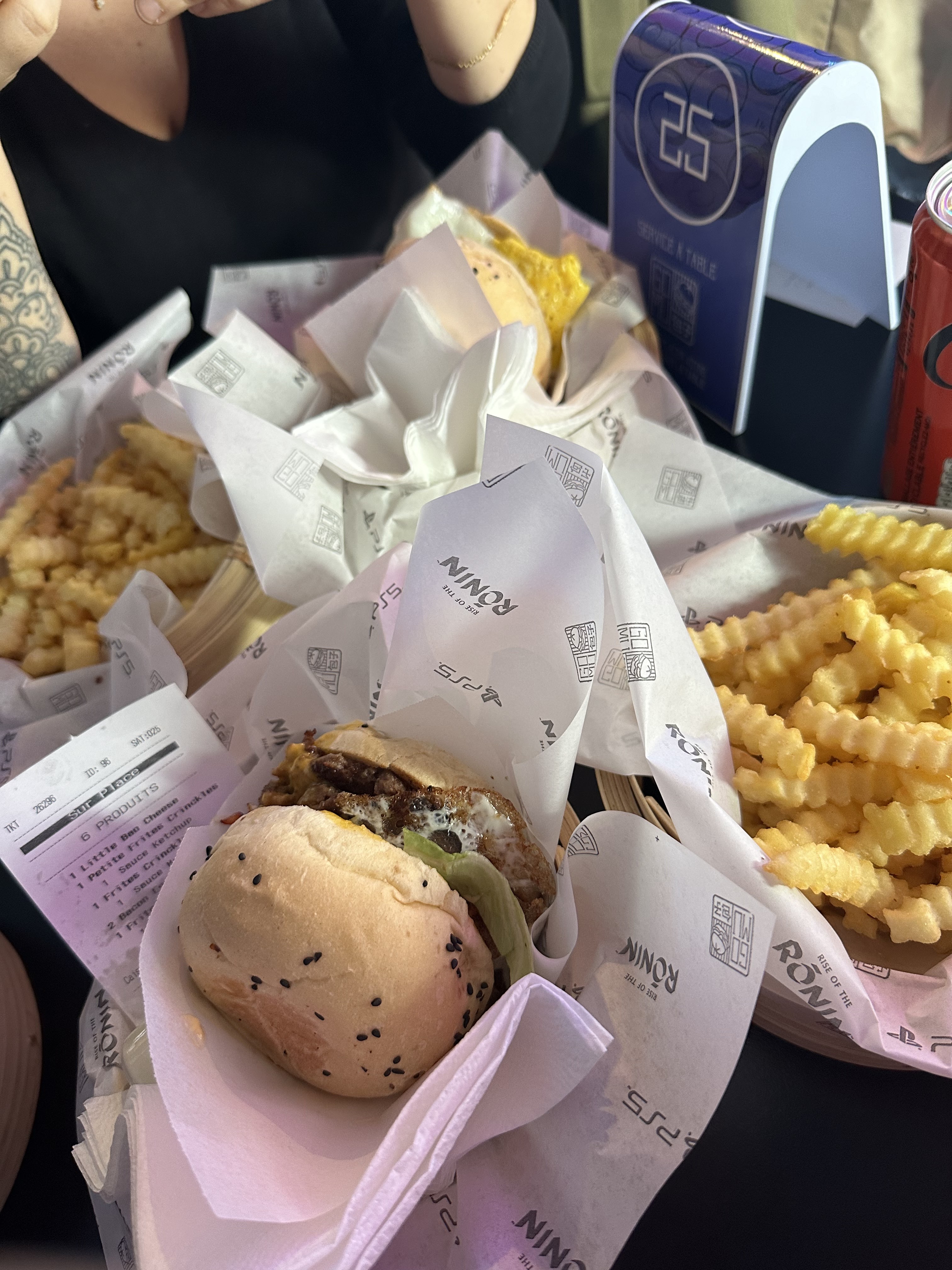 Très très déçu. 45€ pour 2, trop cher pour ce que c’est. Les burgers sont plutôt bons mais rien d’extraordinaire non plus, c’est juste un autre type de pain. Les frites de patate douce sont meilleures chez Lidl et les bubble tea n’en parlons pas, 3 litre de sirop pour 1litre d’eau et 2 bulles (et ils coûtent 4€ en plus). L’ambiance : musique à fond, pas du tout agréable on ne s’entend pas parler. Puis bonjour l’écologie, tout est servi dans des boites en « cartons » avec une tonne de papier cuisson (sûrement pour le style), alors que des assiettes auraient été très bien au moins si l’on choisit de manger sur place. On ne nous a même pas donné de serviettes à table, pas de carafe d’eau si on ne veut pas de boissons. Et les boxes pour manger sont trop petits on se cogne les jambes bref pas pratique. Franchement prenez à emporter à la rigueur mais pour le même prix allez au restau et pas en fast food