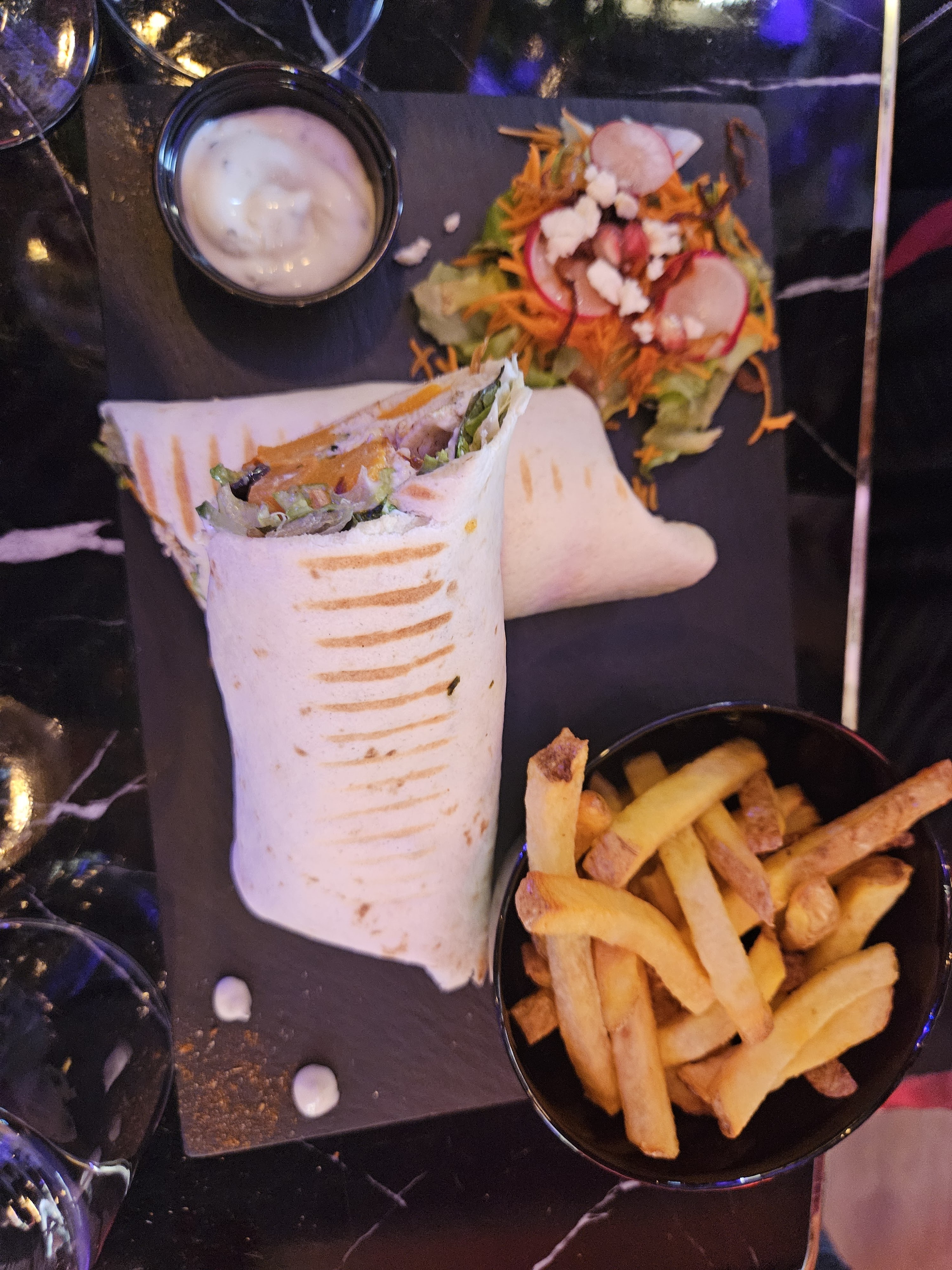 Avis plutôt mitigé. Nous étions de passage sur le retour de nos vacances. C’était un lundi soir donc peu de restaurants ouverts. Google est devenu incontournable pour trouver un restaurant qui sort du lot…vu la belle note de 4,9…je ne pouvais que m’arrêter sur ce restaurant ! Adresse GPS nous arrête sur une façade qui fait plutôt grec que restaurant j’ai dû retourner sur le site pour être sur qu’il n’y avait pas plusieurs Gonak…bon je me dis : “ne te fie pas à la devanture” nous entrons et on nous installe, personnel très aimable et avenant. Décoration sobre (mélange d’ambiance chicha lounge et restaurant). On nous laisse les cartes : bcp de choix (trop !?…) bon en laissant les cartes on a oublié de nous préciser que ce soir pas de viande bouchère et pas de poisson donc que des burger ou des wrap ou des tartines … euh donc ça reste pour moi de la restaurant rapide servie dans de belles assiettes ni plus ni moins… alors peut être que la clientèle locale convient mais ce n’était pas notre cas …Pas de vraies frites «maison» mais plutôt façon “maison” de chez « pixxxxXxXx ». Nous n’avons chacun pas fini notre plat qui faisait trop fast food plutôt que restaurant … ce n’est pas ce que l’on cherchait au départ. C’était un repas en famille enfant en bas âge. Alors je pense plutôt adapté à un endroit sympa entre amis, boire un verre et grignoter sur place…Enfin À vous d’essayer 🙂