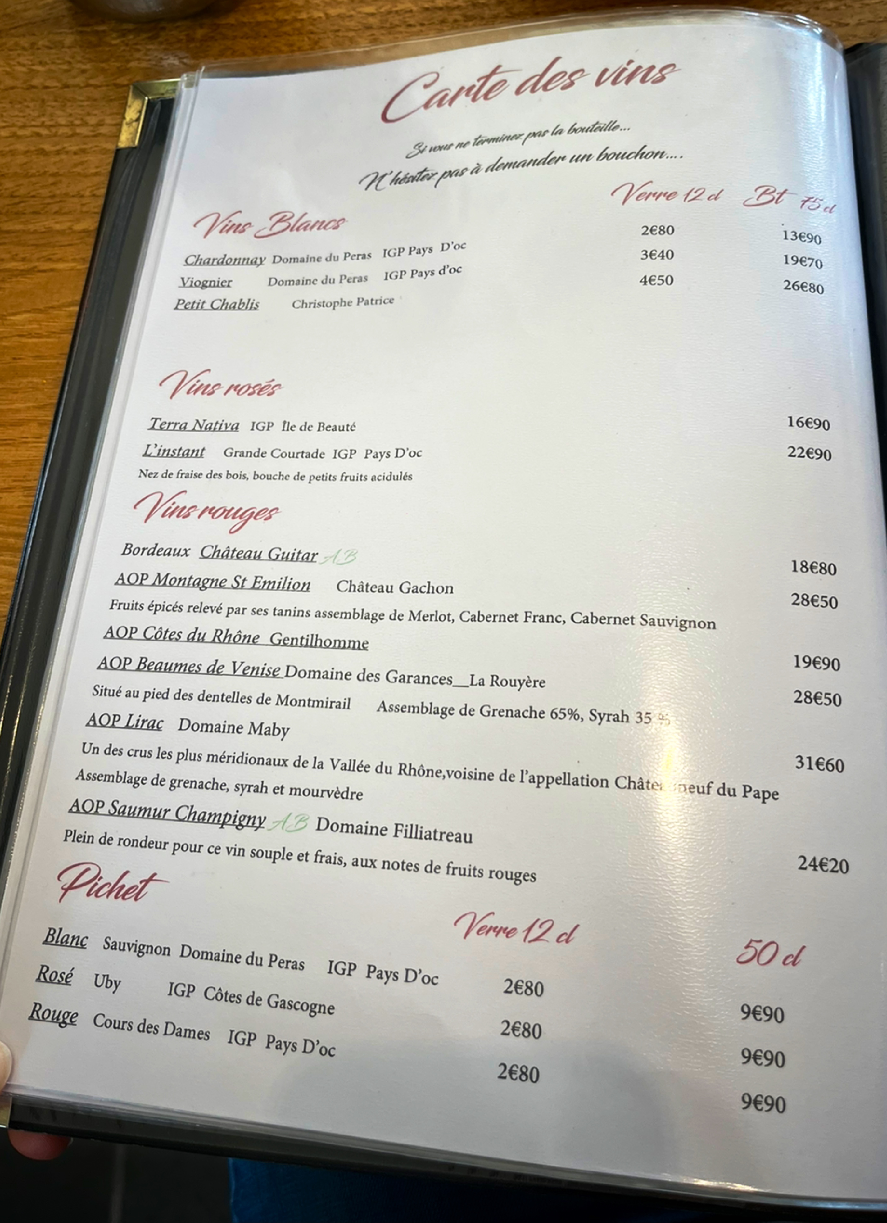 Possible de manger après les horaires communément admis du déjeuner en France. Super accueil. Terrasse au soleil ou à l'ombre.
