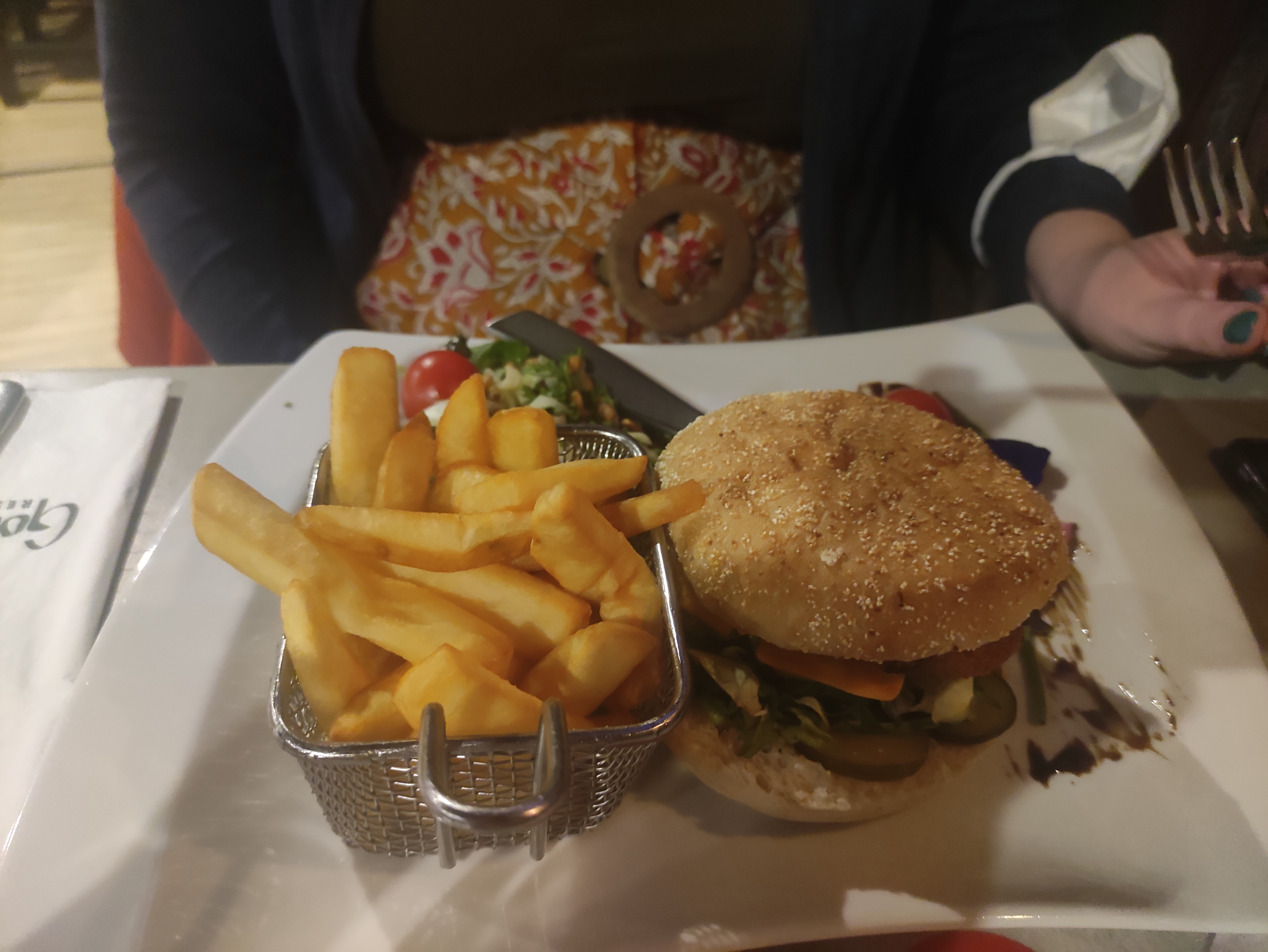 Je commence par le négatif, j'ai hésité avec trois étoiles mais un détail très sérieux doit être souligné et il concerne le port du masque. Si tous les serveurs ont été irréprochables à ce niveau, le gérant/responsable de salle le portait lui... en dessous du menton. Dans la mesure où c'est lui qui apporte les plats aux clients et les annonce, je trouve cela irresponsable. Personne ne doit se dispenser des mesures sanitaires, encore moins ceux qui sont censés montrer l'exemple et qui servent directement les plats que nous mangeons. Après l'avoir signalé à un serveur, le masque du monsieur a bien été relevé, mais pas jusqu'au nez qui est resté à l'air libre... A titre personnel je préfère que mon plat arrive en retard le temps que monsieur ait pris l'air dehors plutôt que de le voir faire des va-et-vient en salle et sans masque. Rien à redire sur mon plat, sur mon dessert ou sur l'ensemble des serveurs . J'apprécie particulièrement le fait que tous les burgers soient disponibles en veggie et ce sans modification du prix.