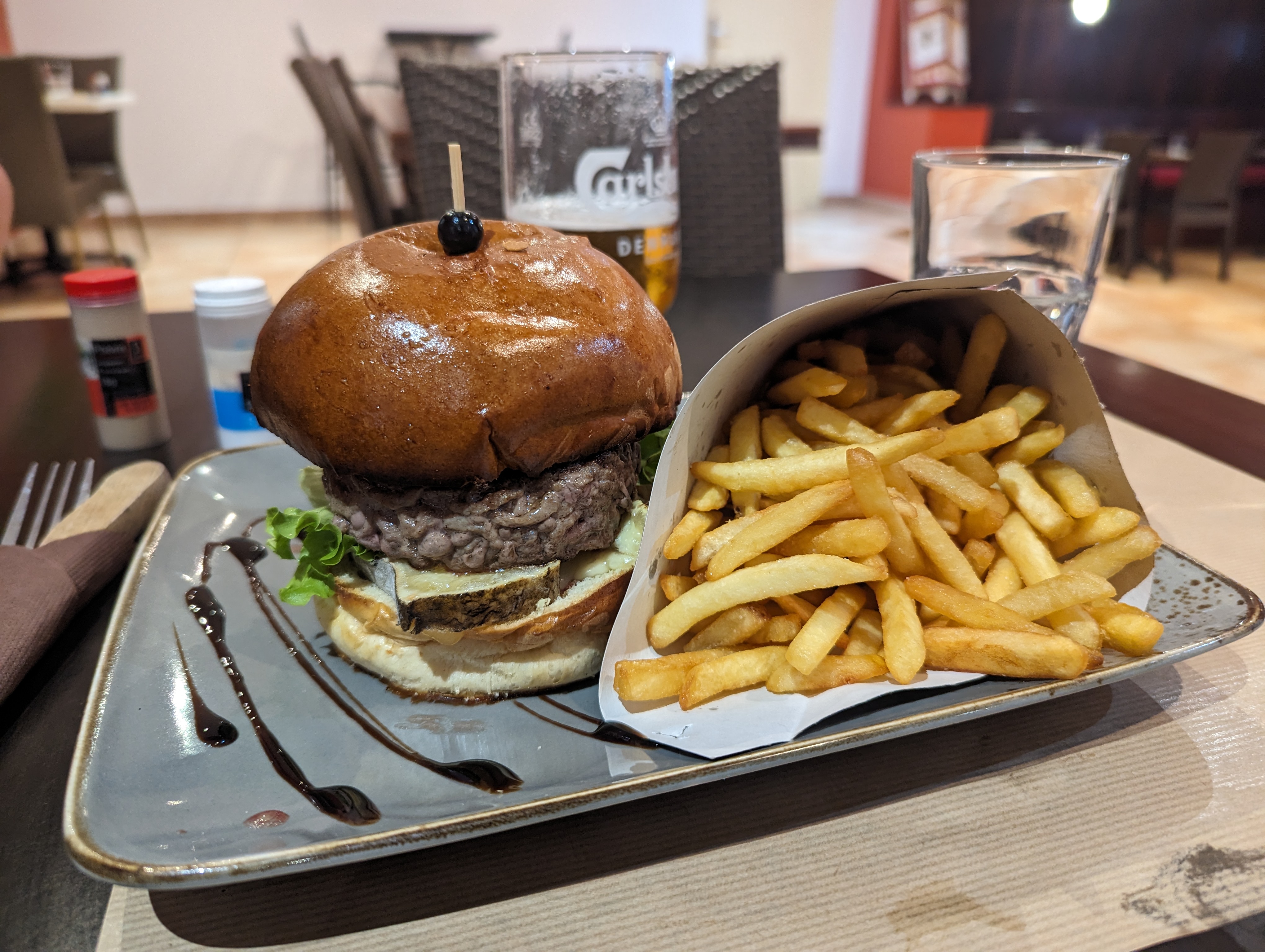 J'ai rendu visite à des amis là-bas l'année dernière. Le service laissait beaucoup à désirer, même s'il n'y avait que quelques invités. La nourriture était un désastre. Le burger est encore cru et sans amour à l'intérieur. La viande que vous avez commandée était probablement à moitié dans la poêle (brûlée) et l'autre moitié à l'extérieur (crue) - vous devez d'abord vous en occuper. Les prix étaient déraisonnables pour cela. Aucune recommandation !