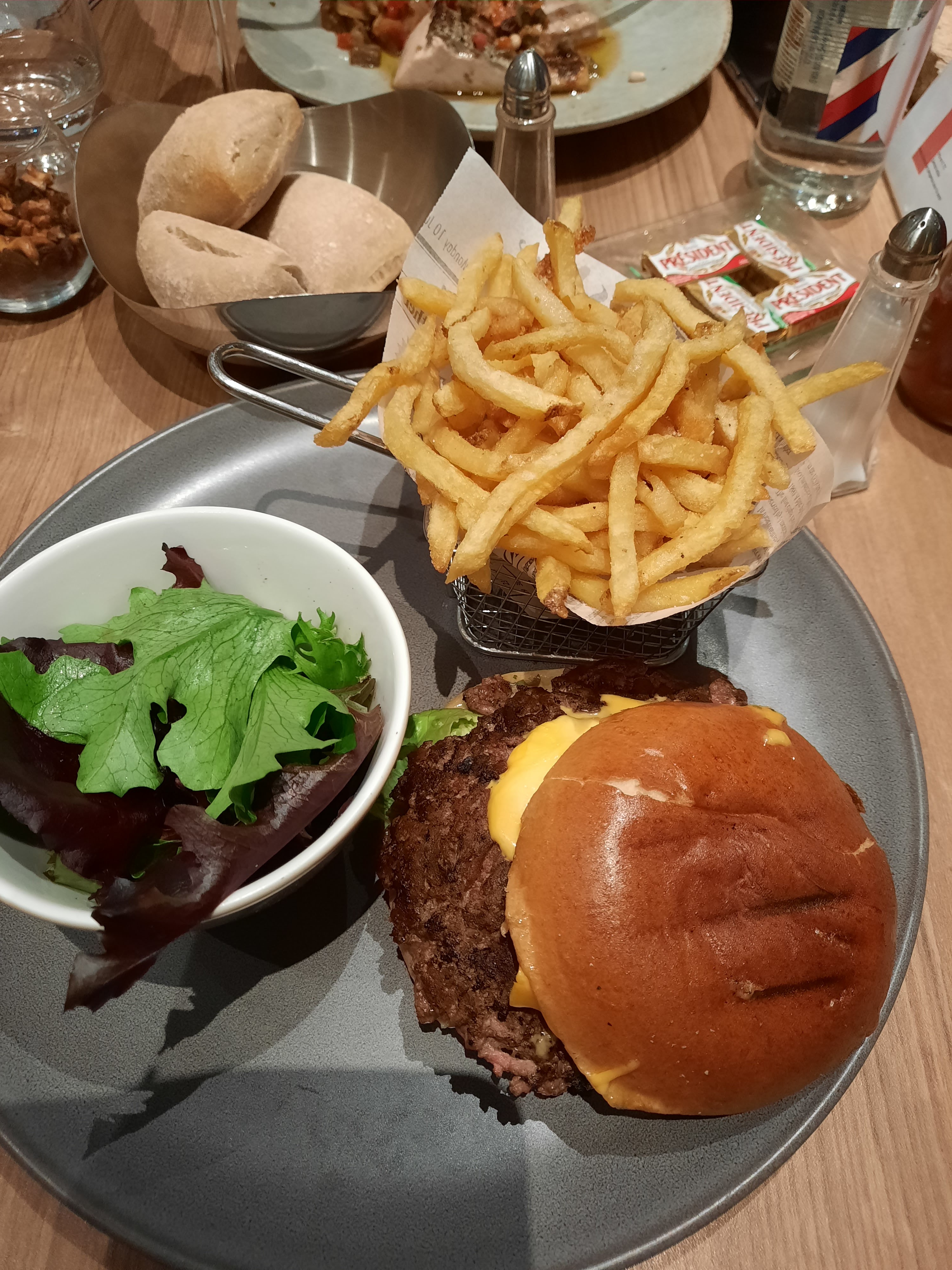 Très très bien servi et accueilli, serveurs et serveuses au top. Le burger vegan n’est pas super top, mais le classique est très bien. Les frites sont appétissantes.