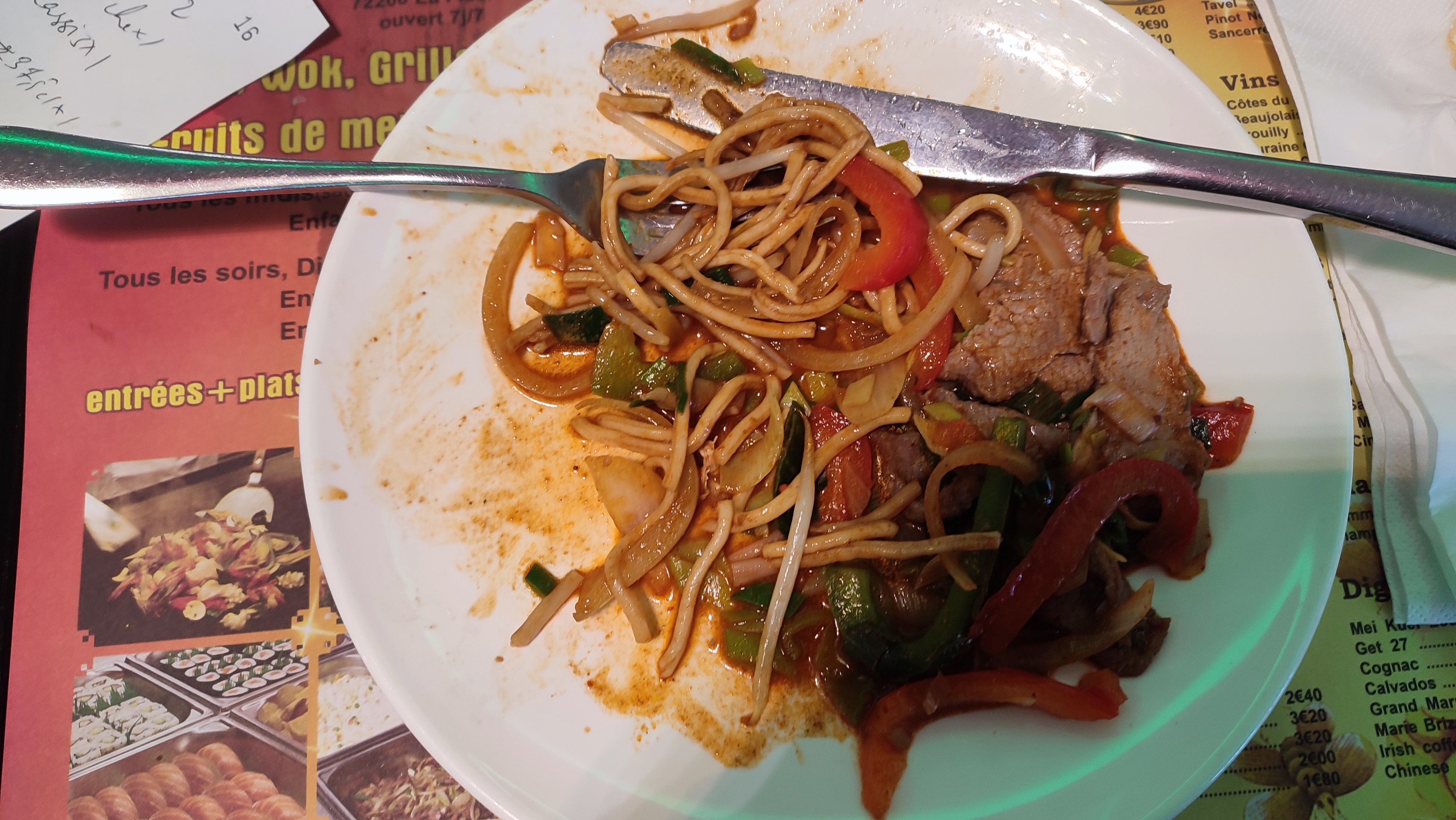 Je suis juste entré dans l’espace sanitaire et en voyant une cuvette abîmée, un sol gras et des portes plus que degueulasse , je n’ai pas osé manger dans leur assiettes…. Je n’imagine même pas l’état de la cuisine . Plus rien à manger des 20h …. Un wok très mal cuisiné avec des produits surgelés. Je ne recommande surtout pas le chinois route du Mans mais plutôt le resto asiatique rue pape Carpentier.