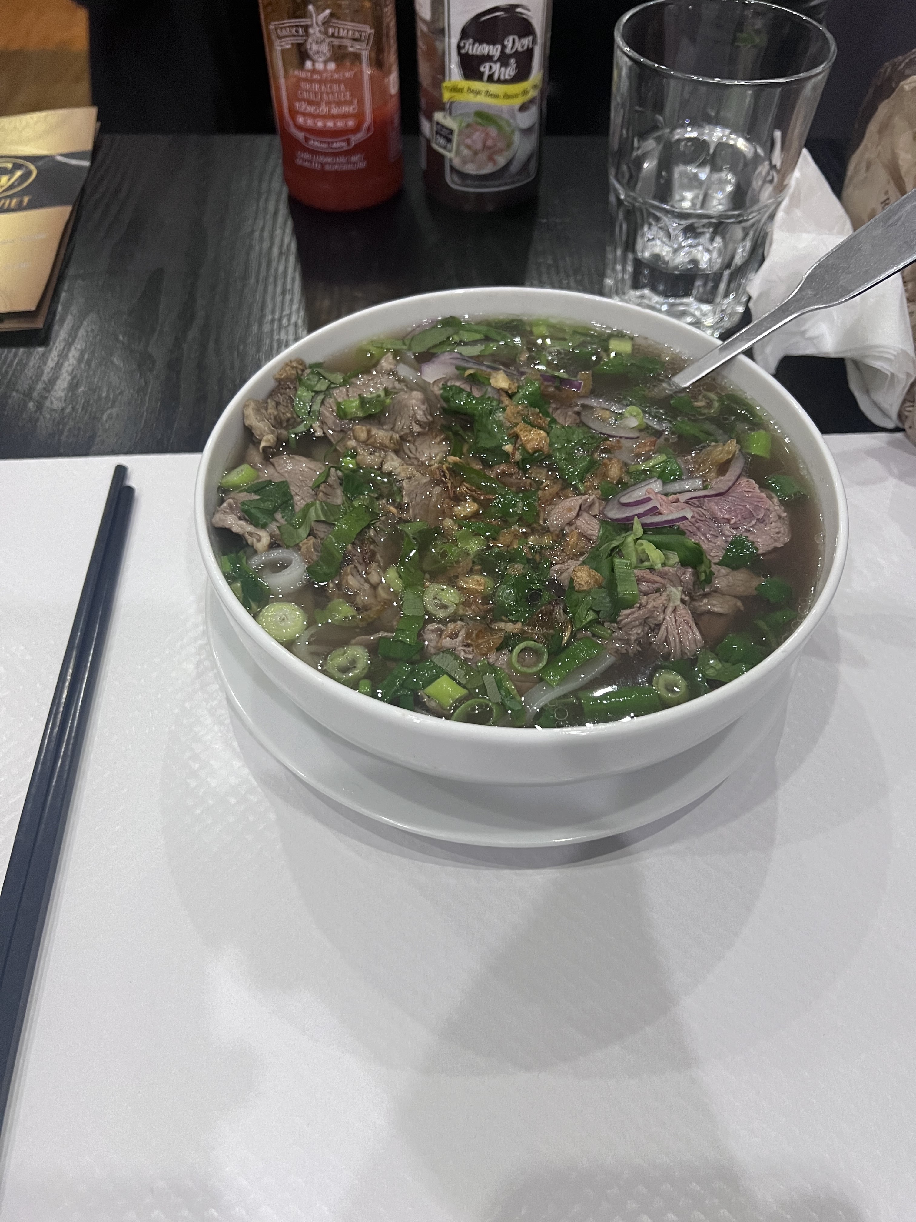 Mouais, pas de soupe pho au boeuf car pas trop demandée apparemment. pâtes de riz sautées au boeuf :le boeuf était bon, pas mal de condiments coriandre, oignons mais plat un peu fade dans l'ensemble, ça manque de sauce, de yummy quoi. Serveuse agréable et gentille