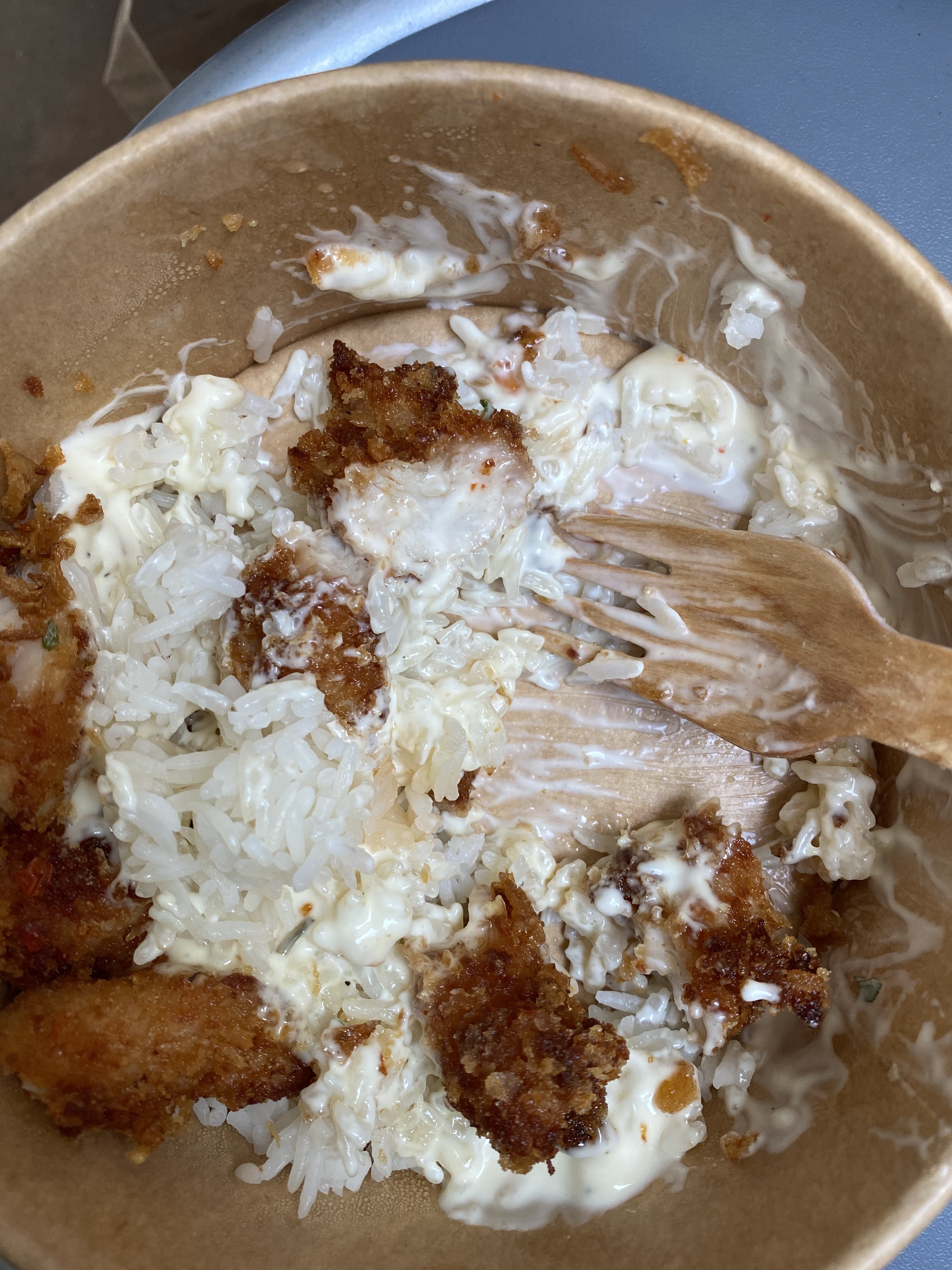 La nourriture aurait été bonne mais était recouverte d'une sauce blanche épaisse. On dirait de la mayonnaise ? Le poulet qui n’en était pas recouvert était délicieux. C'était un total de deux bouchées. Tout le reste, y compris le riz… les déchets.