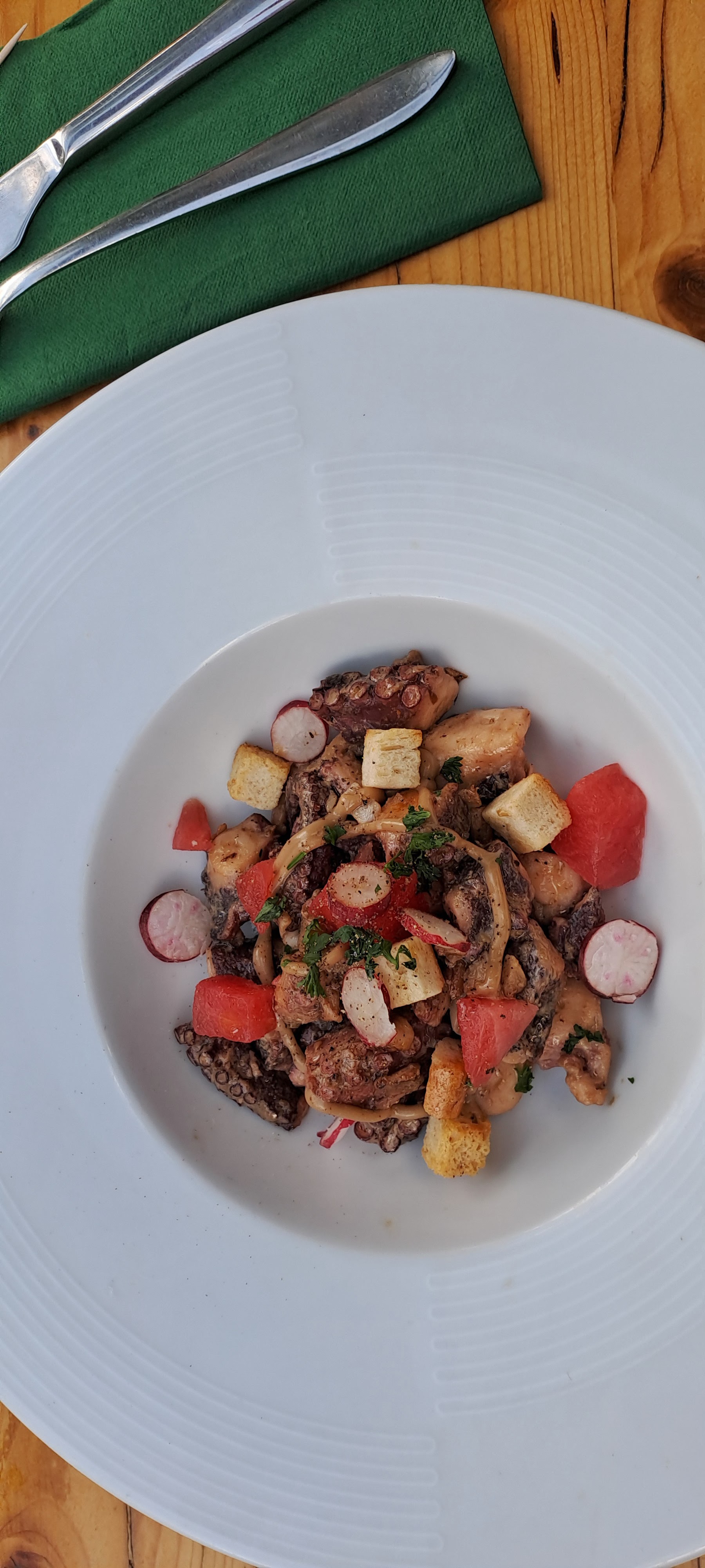 La terrasse arrière offre un cadre agréable. Le service est moyen, très amateur pour tout dire. La nourriture médiocre. En entrée une salade de poulpe accompagnée de petits morceaux de pastèque et croûton de pain dur (croûton de pain?? Bon, pourquoi pas) et une sauce qui gâche totalement le goût du poulpe. En plat, un hamburger de canard. Là aussi avec une sauce qui ressemble à du viandox mais que le chef a expliqué comme étant faite à base de mayonnaise et vinaigre balsamique. Dommage le goût de la viande de canard disparaît sous cette sauce un peu écoeurante. Les légumes d’accompagnement sont froids, les frites froides et pas cuites a cœur. Il n’y avait plus le dessert souhaité (ça arrive!) Une note positive ; le vin « enfant terrible » est à découvrir.