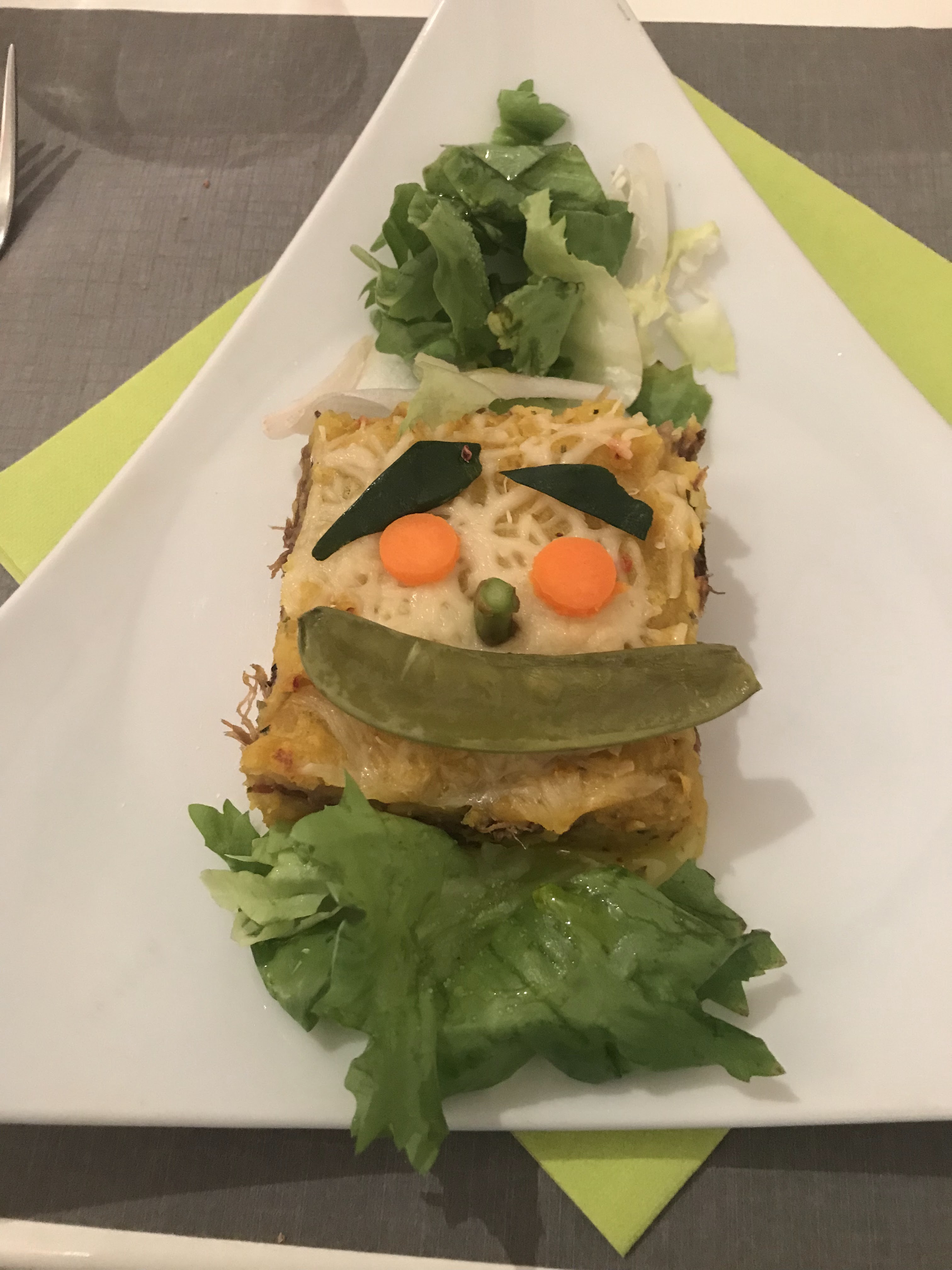 Personnel sympathique, ambiance chaleureuse! Des plats artistiques ! Cette image représente un visage souriant composé de curry, de légumes et de canard. :)