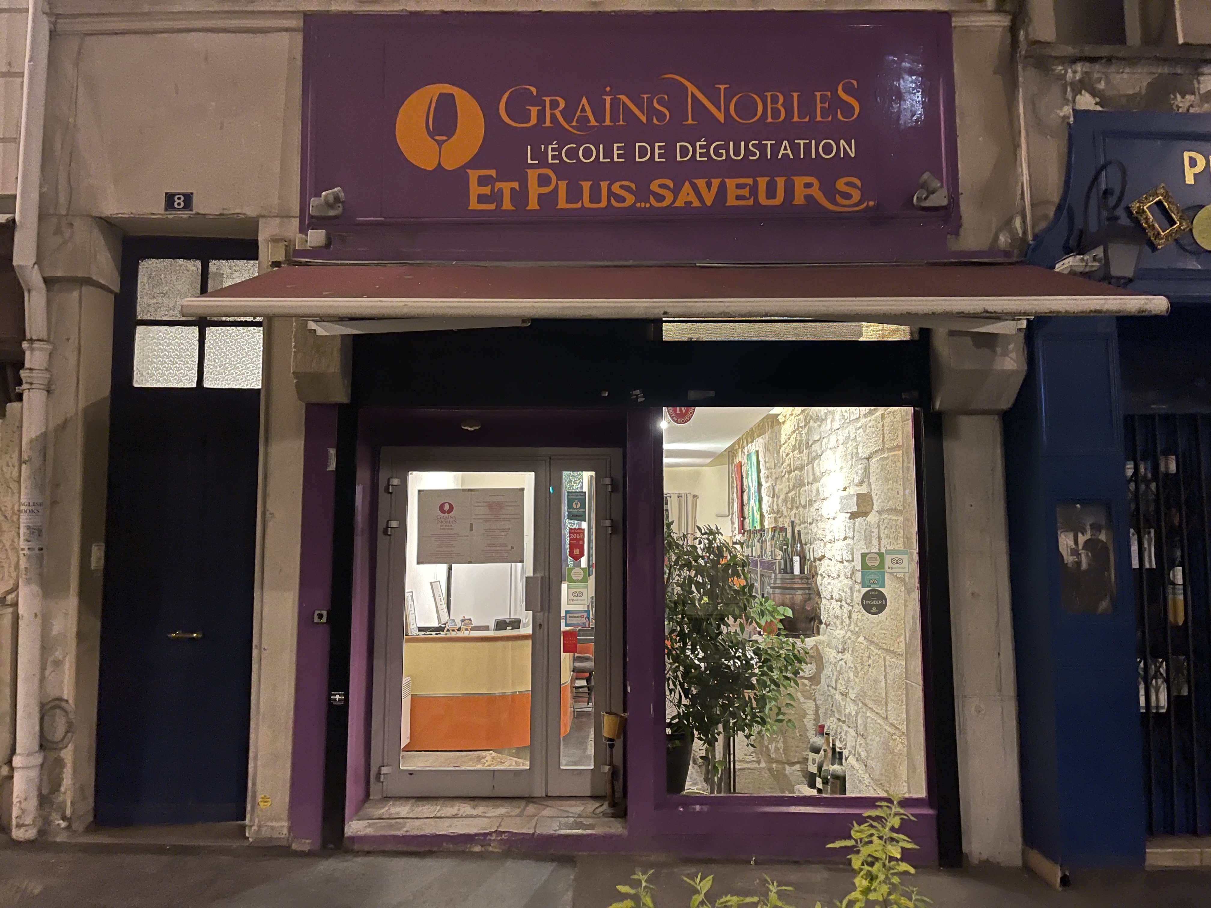 Grains Nobles qui est situé au cœur du quartier latin mais dans une rue calme, propose à la fois une école de dégustation de vins une des meilleures de Paris, et aussi un espace de restauration avec une belle sélection de vins. L'école de vin fait plutôt dans le haut de gamme avec des sélections de vins de tout premier ordre et des vieux millésimes, ce qui est rare. Elle présente aussi les vins de domaines prestigieux à travers le monde. La partie restauration propose des tartares de saumon préparés minute, des assiettes de fromages et de charcuterie ainsi que des formules de jour, le tout à des prix très raisonnables.