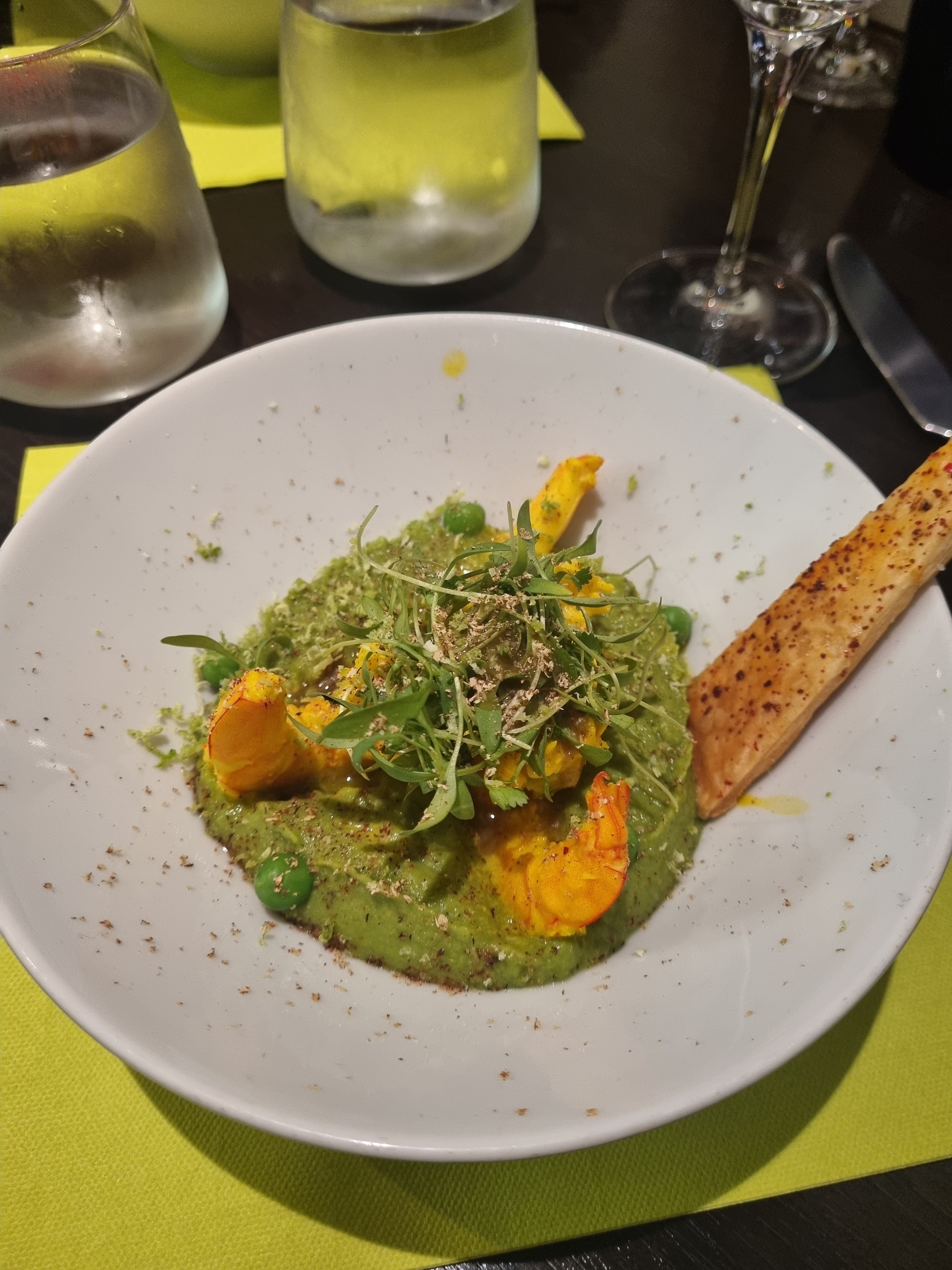 La particularité de ce restaurant est qu'il n'y a pas de menu. Ou mieux encore, il y en a un mais c'est une surprise ! Des questions vous sont posées avant la sortie des plats, par exemple si vous mangez de la viande/du poisson et si vous avez des allergies. Les plats sont sortis assez rapidement et tous étaient délicieux ! Notre entrée était composée de crevettes au citron et au safran dans de la purée de pois, le plat principal était du canard rôti, puis nous avons eu un plateau de fromages français. Le dessert était un pudding à la vanille avec une purée de fruit de la passion et des fruits. Vous obtenez 4 cours pour seulement 39 €, ce qui est un très bon prix. Cet endroit est absolument recommandé !!
