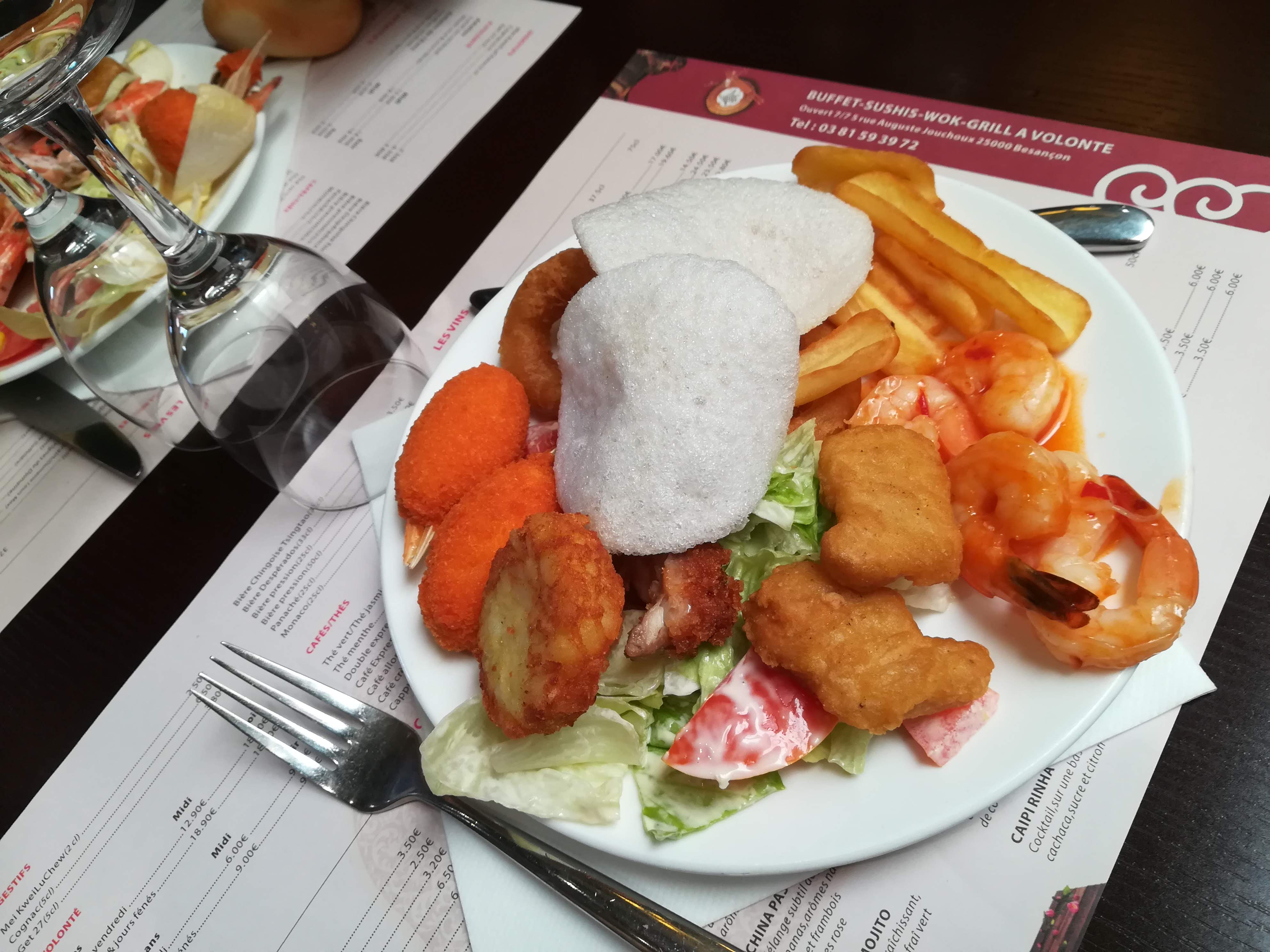 Une nourriture certes à volonté mais d'une qualité médiocre. On connaissait la cuisine chinoise qui se mélange aux sushis japonais et aux plats d'influence du Cambodge ou Viet nam. Cette fois, encore plus fort, on trouve des röstis et des frites. Pour le dépaysement, c'est raté. Vivement la version quiche lorraine. Pas impossible qu'ils y aient pensé. Arriver en fin de service signifie racler les fonds de plats tièdes. Quasi toute la nourriture est grasse, on pense deviner l'huile de palme un peu partout. Les plats de cru à faire griller sont tout sauf appétissant, et avec un niveau de frais relatif a l'air de la salle. La viande dans les garde-au-chaud fait vite regretter la vie du poulet de batterie sacrifié pour ce truc en sauce. Le personnel (les pauvres...) n'est visiblement pas payé a la qualité du moment passé par les clients. La priorité est clairement a faire tourner le service, relève des assiettes et nettoyage permanent , qui laisse dans l'air une odeur de produits d'entretien, mélangée à celle des plats frits et bouillis. Le rêve. Mais, bon, c'est pas cher, pour manger des kilos de... Qu'est ce que c'est, déjà?