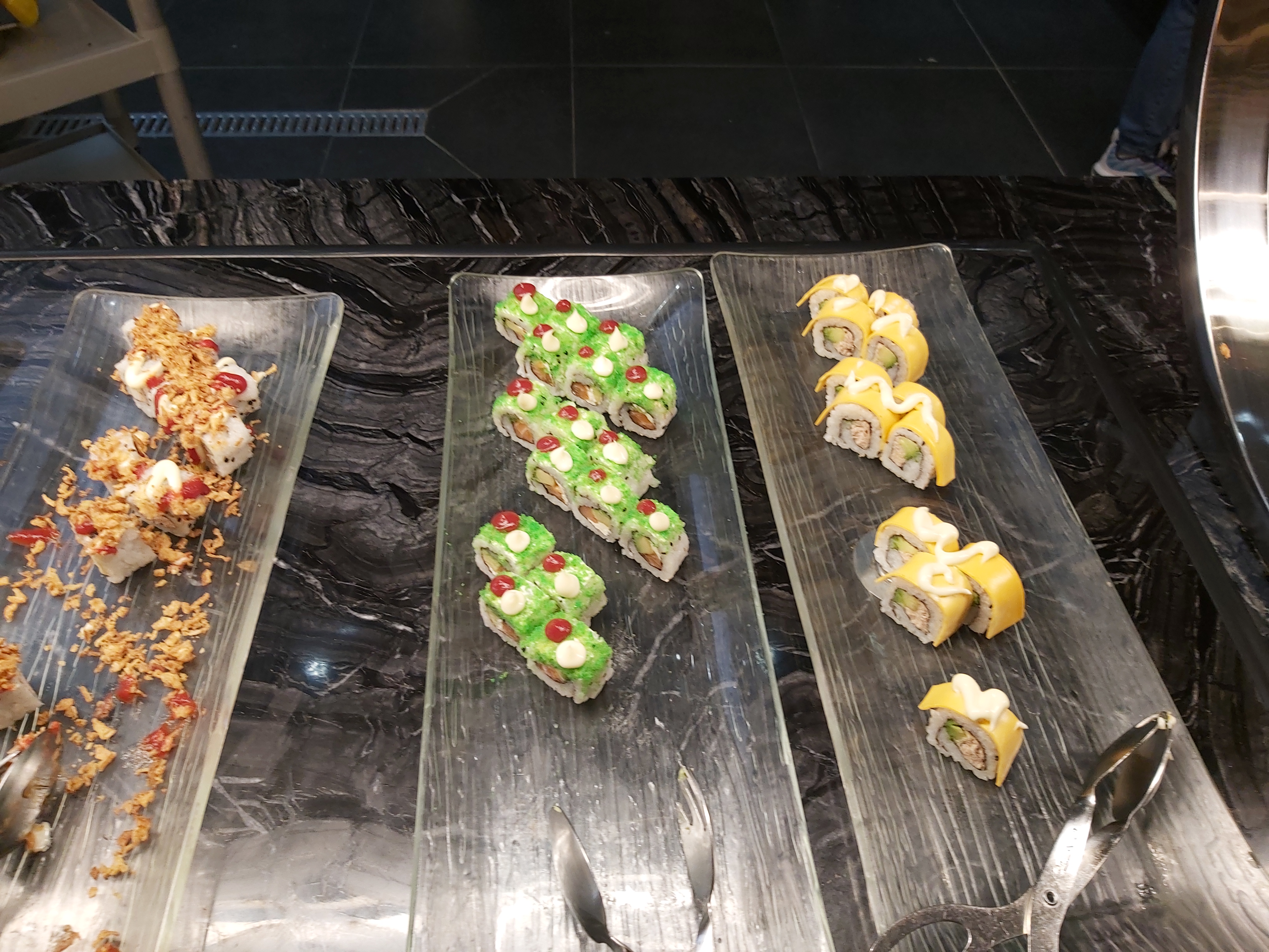 Repas froid, peu de variétés asiatiques malgré son affiche. Buffet décevants, aliments peut être pas frais, salle peu moderne et pas chaleureuse. Gamme de sushis pitoyable et desserts surgelés à éviter.