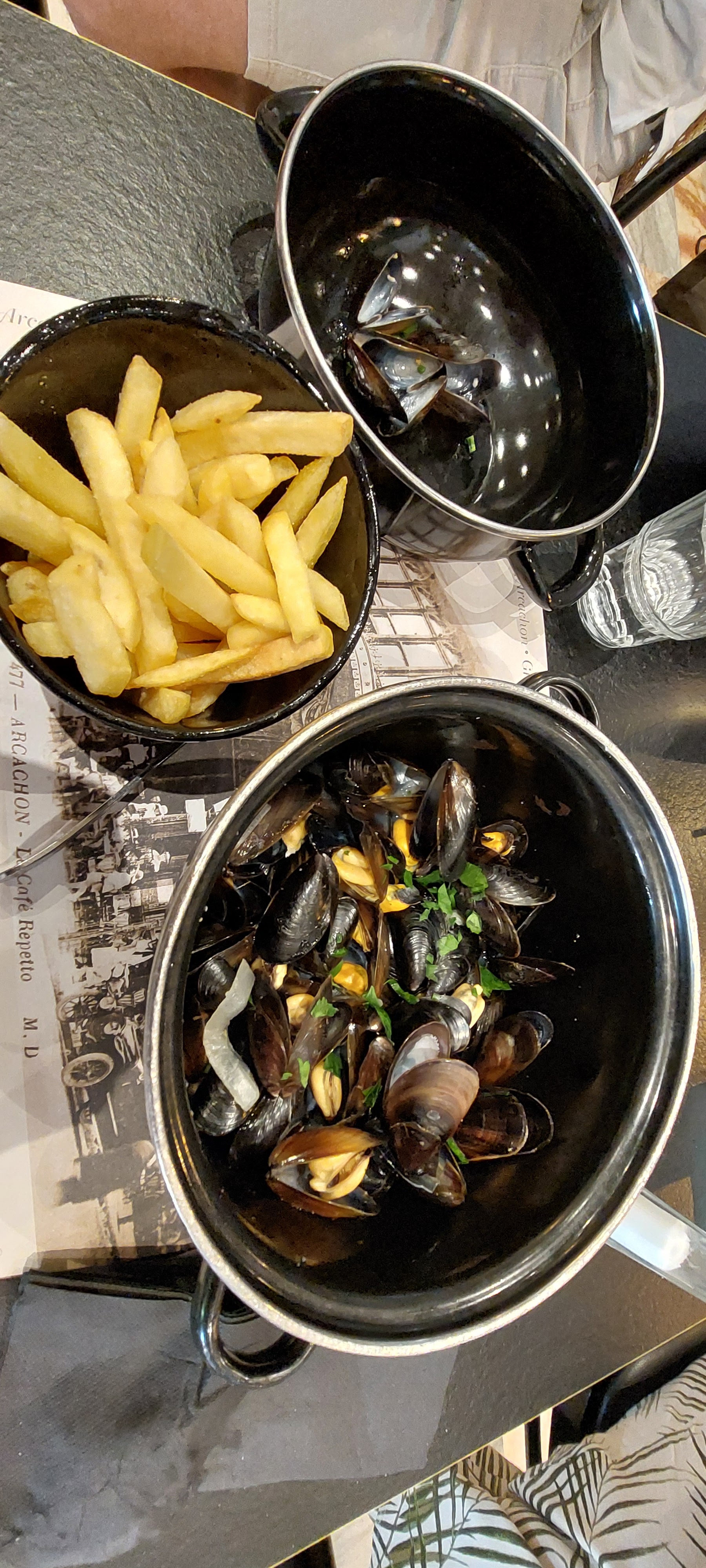 Ce restaurant situé au bord du bassin est parfait pour déguster de bonnes moules - frites à un prix abordable. La salle est grand et bien aménagée. Dommage pour l'équipe qui était un peu pressée, mais en pleine période touristique, cela reste comprehensible. Un petit peu d'attente cependant pour l'arrivée des plats.