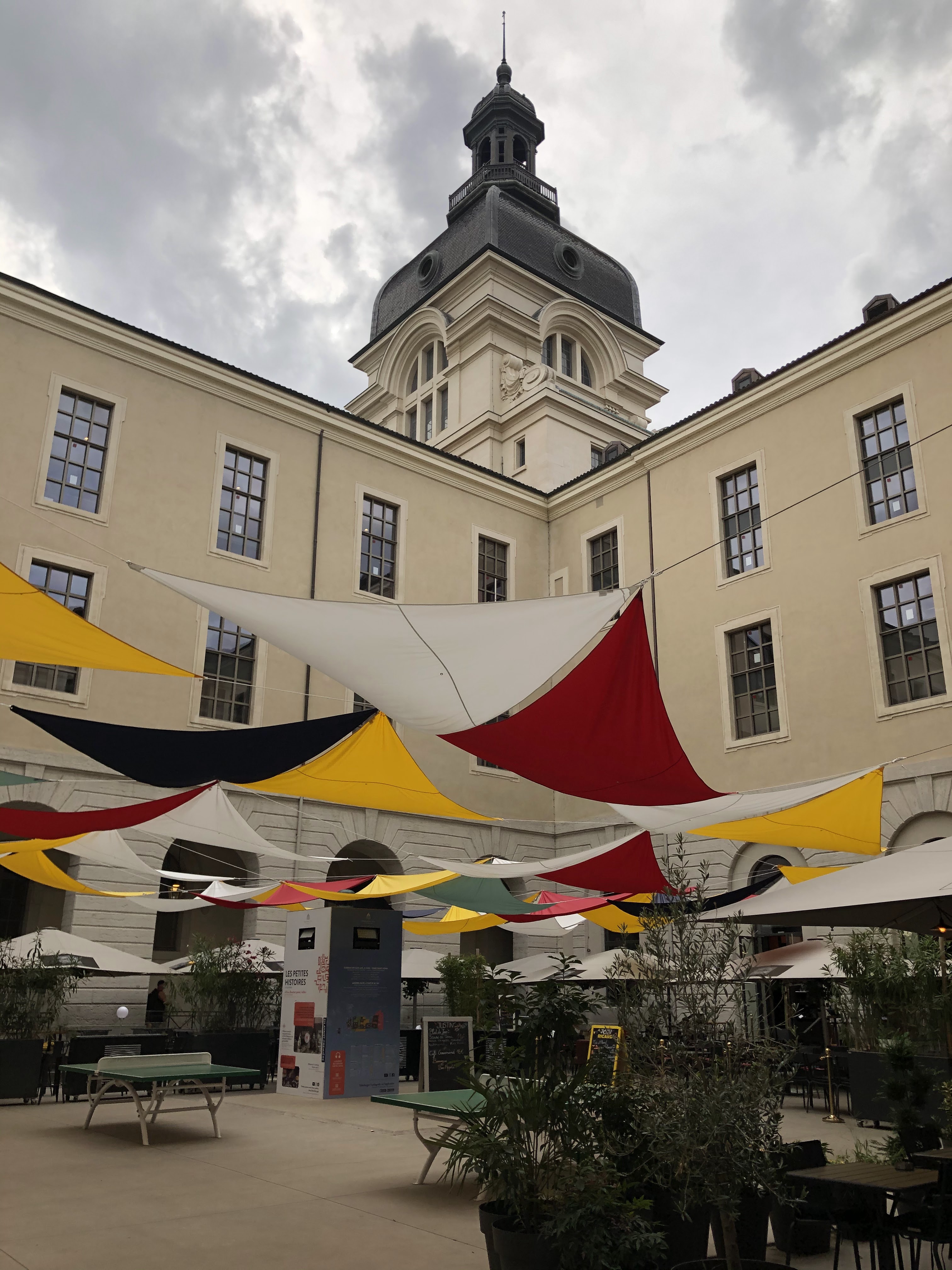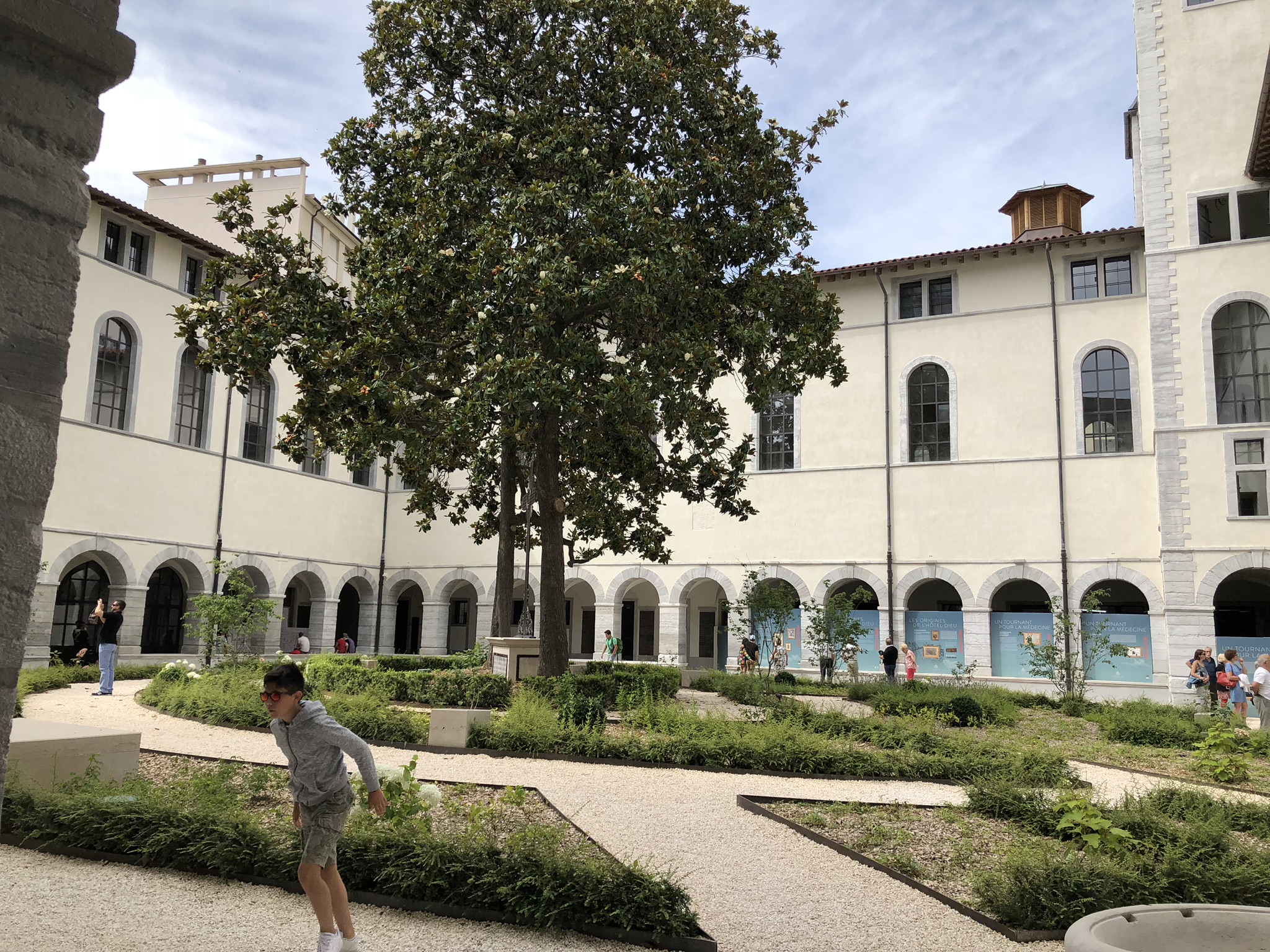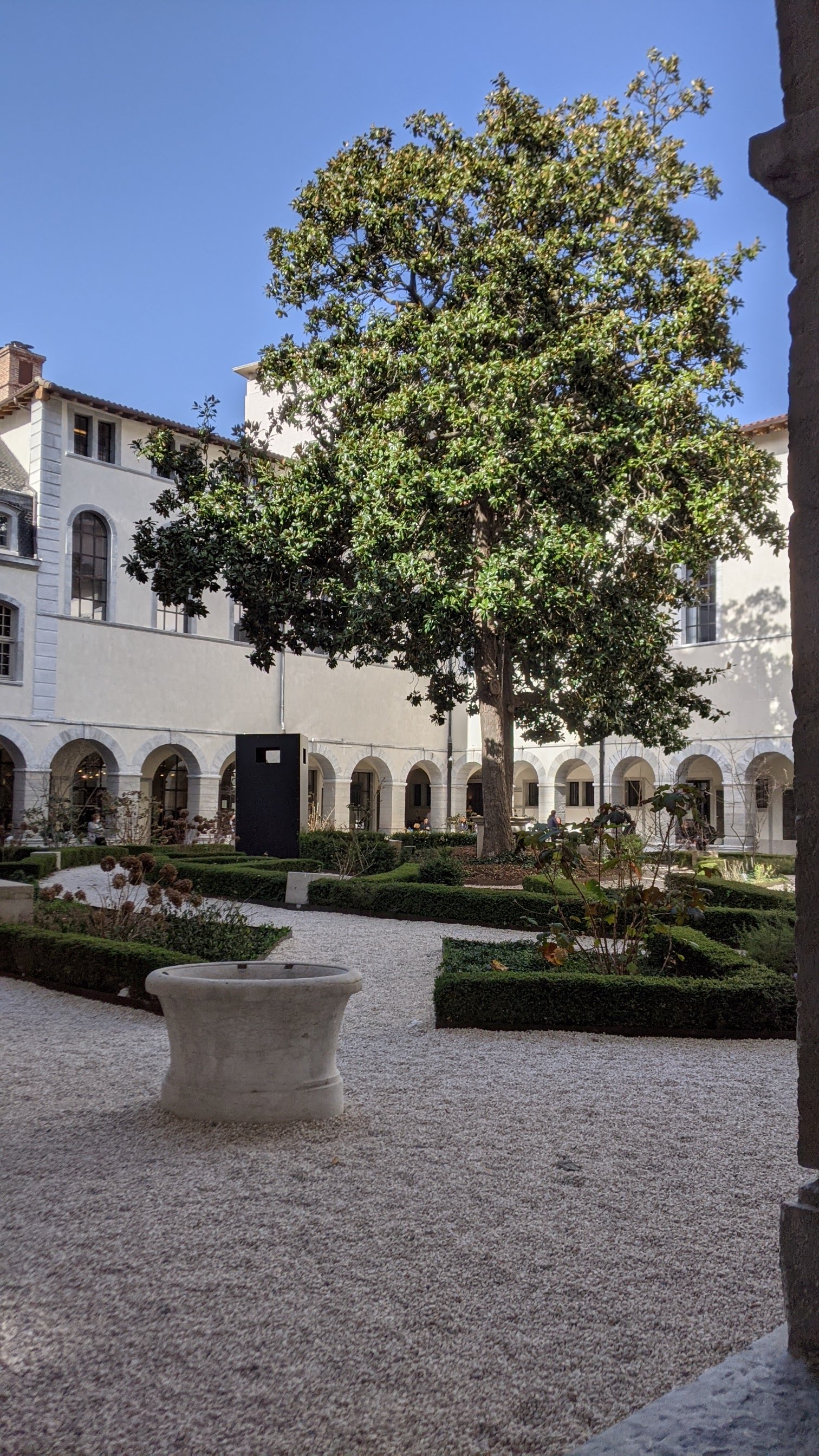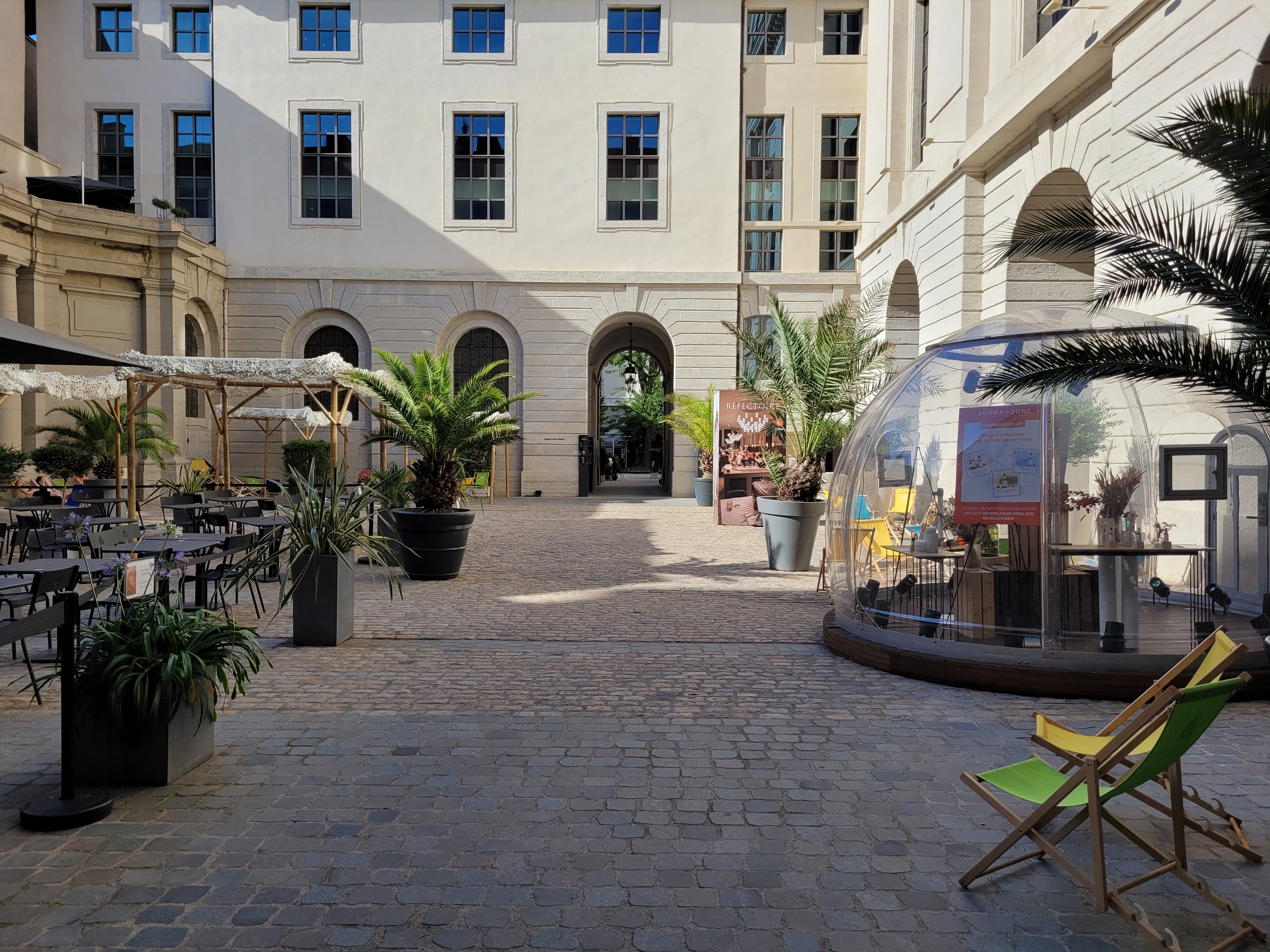 Lieu très agréable où il est possible de simplement venir se reposer seul ou entre amis. Des transats et fauteuils disposés dans les différentes cours s'y prêtent. Le tout est délicieusement ombragé et végétalisé. Vous pouvez aussi visiter la chapelle de l'Hôtel-Dieu. Et bien sûr faire du shopping ou vous restaurer. Sans oublier l'actuelle exposition sur le microbiote intestinal (jusqu'au 30 juin 2024)