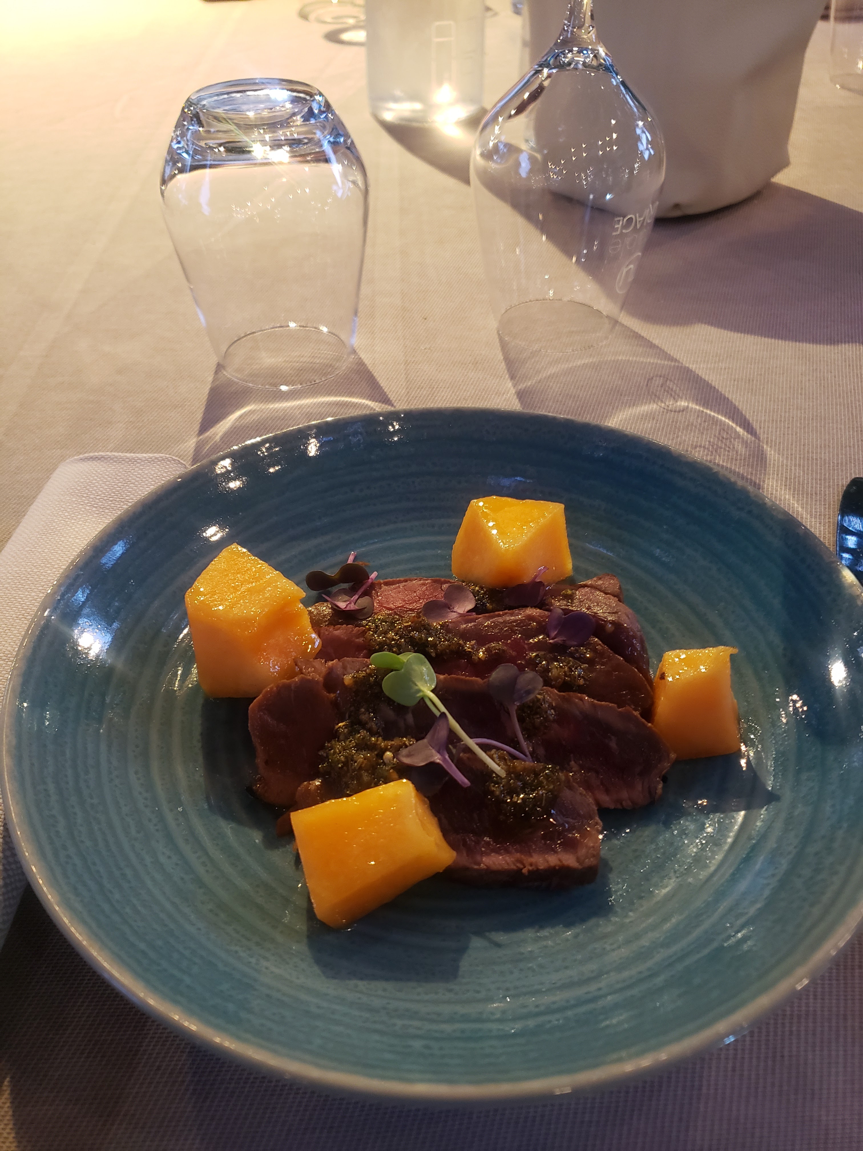 Nous avons mangé au restaurant, les plats, les cocktails et le dessert étaient vraiment succulents, les mets étaient raffinés c’était vraiment bon
