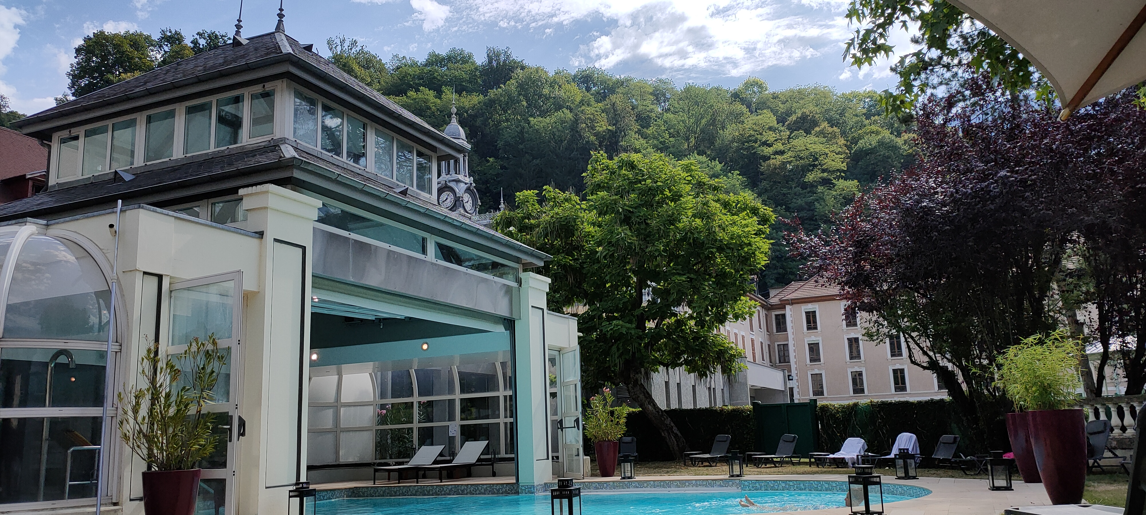 L'endroit est magnifique nous avons été très bien reçu dans une très belle chambre avec une terrasse immense avec la vue sur le parc. L'hôtel a toute une histoire très intéressante et n'est en aucun cas vieillot comme on peut le voir sur un commentaire. La chambre est libérale le lendemain à midi ce qui est un plus. Concernant le spa vous pouvez profitez d'une eau thermal très bon pour la peau et en plus à 33 degrés. Concernant le repas nous avons été très surpris par les mariages de saveur. Le petit déjeuner était un régal. Nous reviendrons avec plaisir je conseille surtout niveau qualité-prix