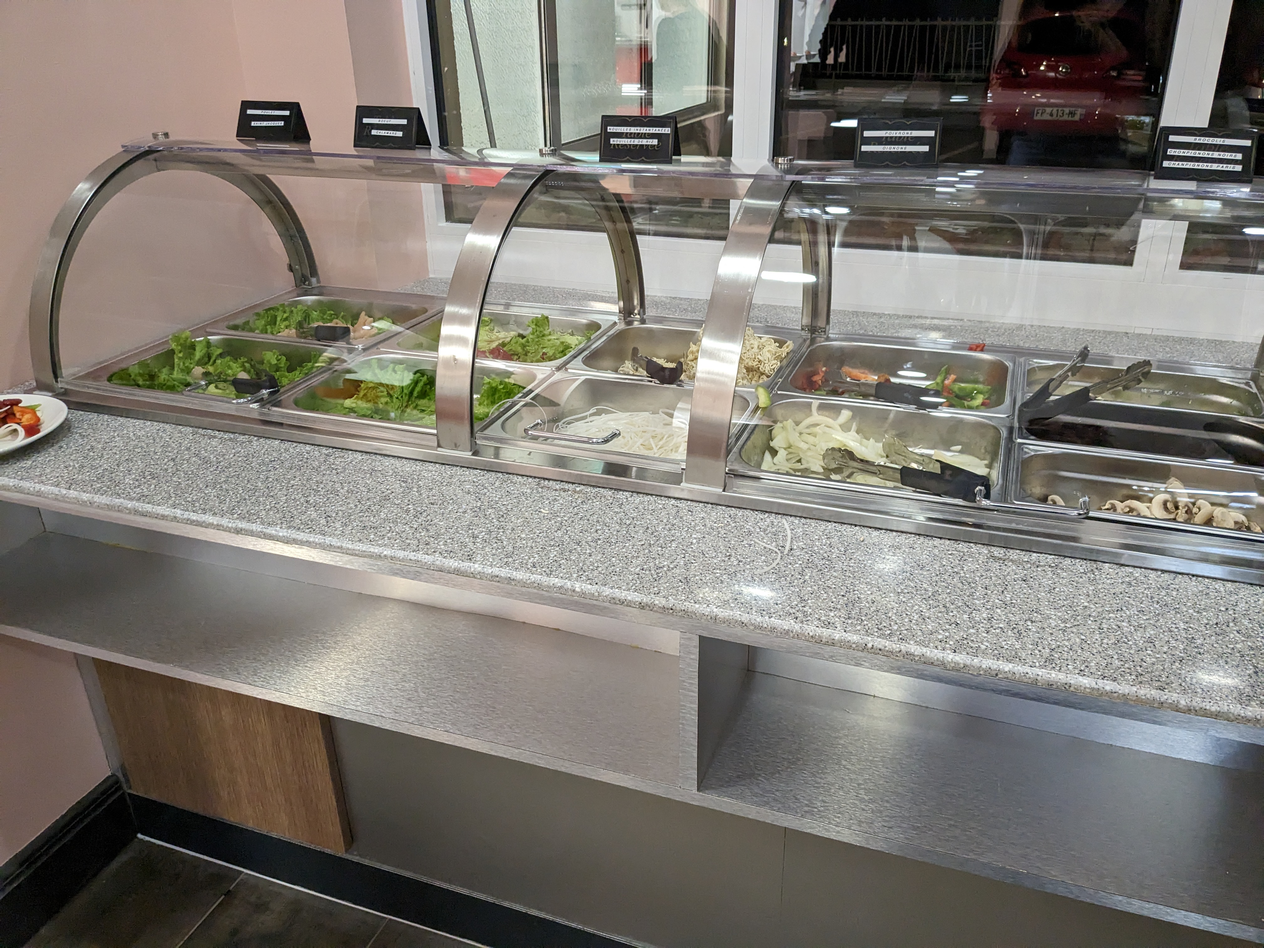 Les Plats chauds sortent des choix habituels. Dommage que le présentoir du wok soit mal indiqué. Les bulots, bigorneaux,couteaux sont cuits à la vapeur,donc très fades. Nems et samoussas très bons. Personnel accueillant et attentionné. Je ne pense pas y revenir.