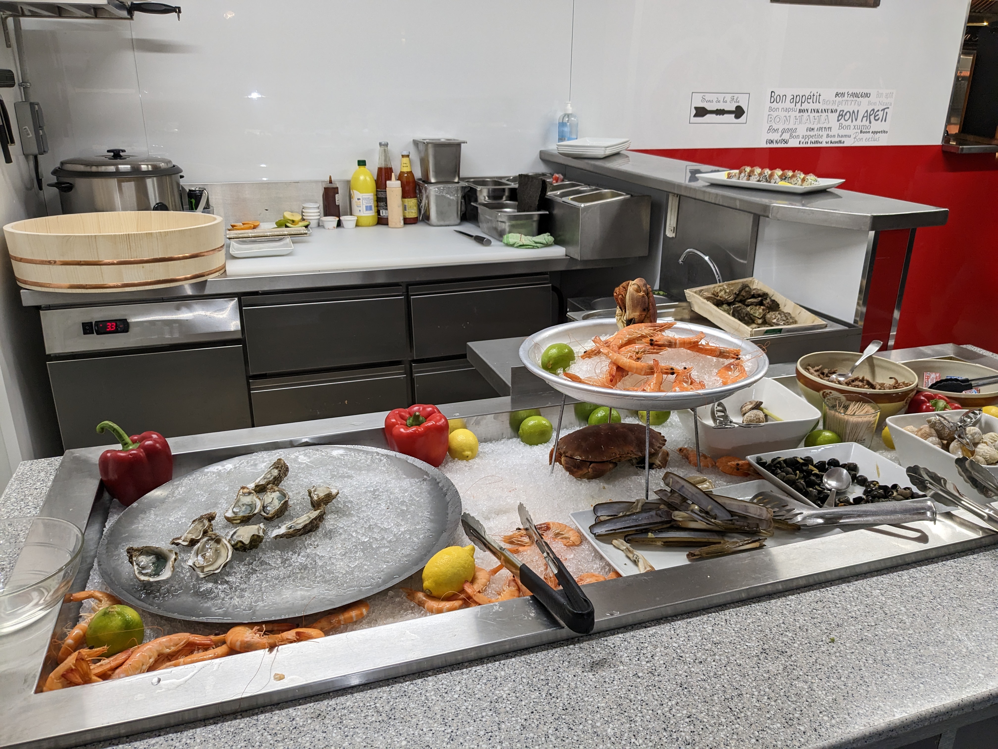 Restaurant sous forme de buffet à volonté. Très grand choix de plats asiatiques mais aussi fruits de mer, charcuterie, des grillades et une rôtisserie (gigot d'agneau et cochon de lait). Bon choix de desserts. Produits d'excellente qualité. Prix attractif, 16,90€. Je recommande.