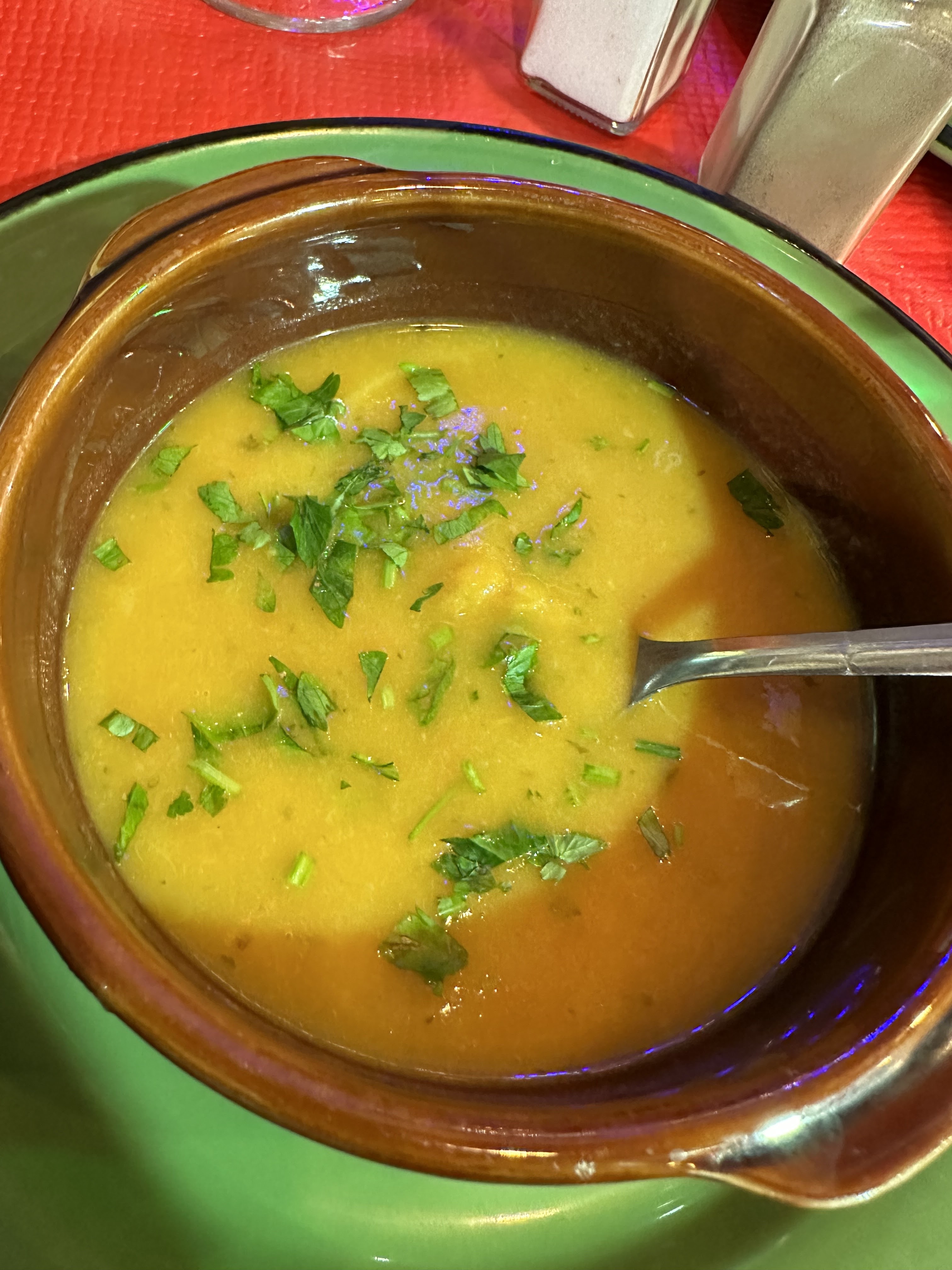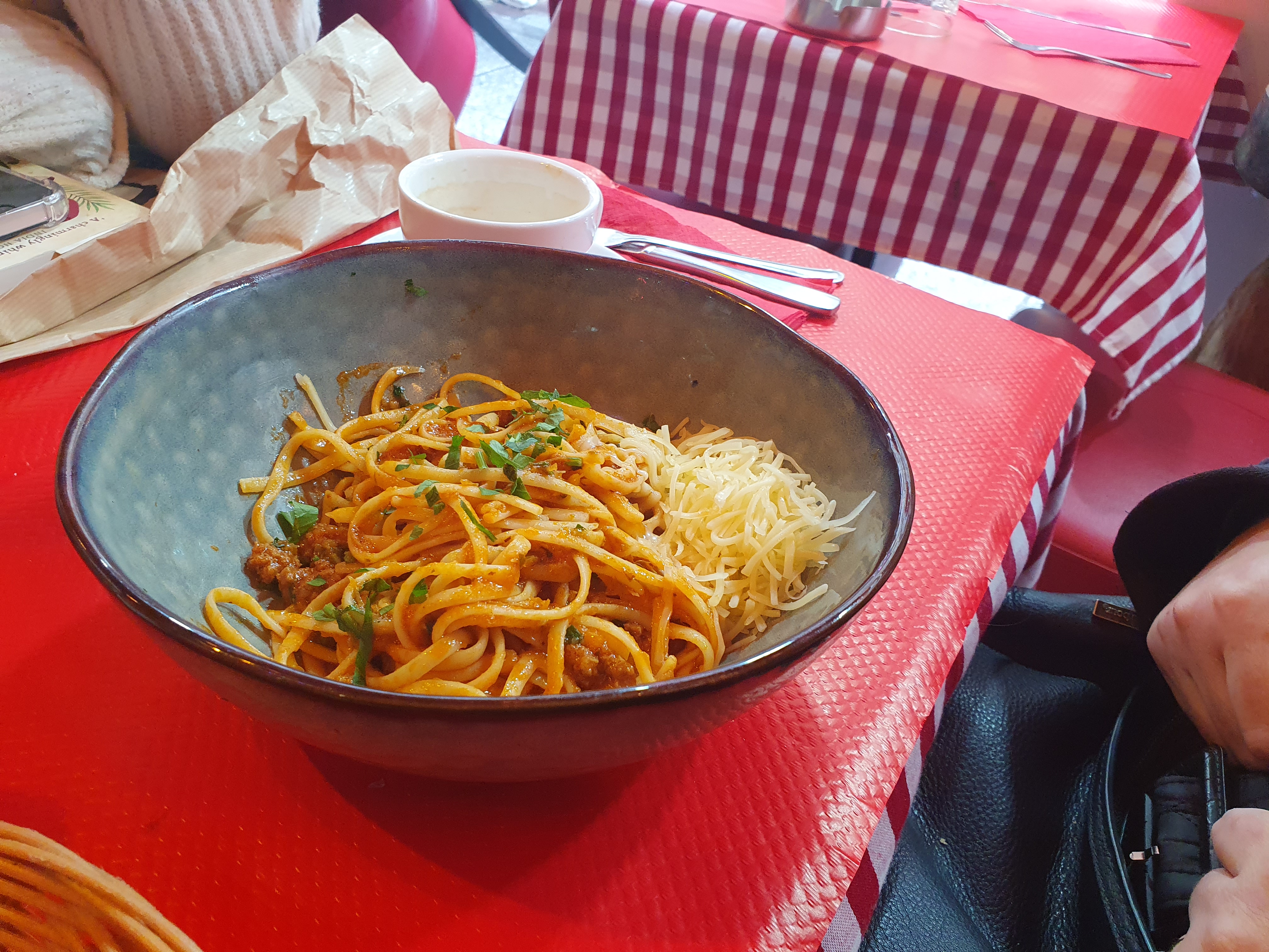 La nourriture était excellente, l'ambiance était géniale, le personnel était sympathique et dans l'ensemble, nous avons vraiment apprécié notre expérience ☺️ Le service était très lent, donc si vous manquez de patience, cela peut être un problème - ma mère et moi nous sommes rappelés que c'est la façon française d'apprécier le moment et détendez-vous. Je le recommanderais. (Nous avons pris le menu à 12,70 € et essayé la soupe de légumes, le poulet, les spaghettis bolognaises, la mousse au chocolat et la crème brûlée) Merci pour cette excellente première soirée à Paris !