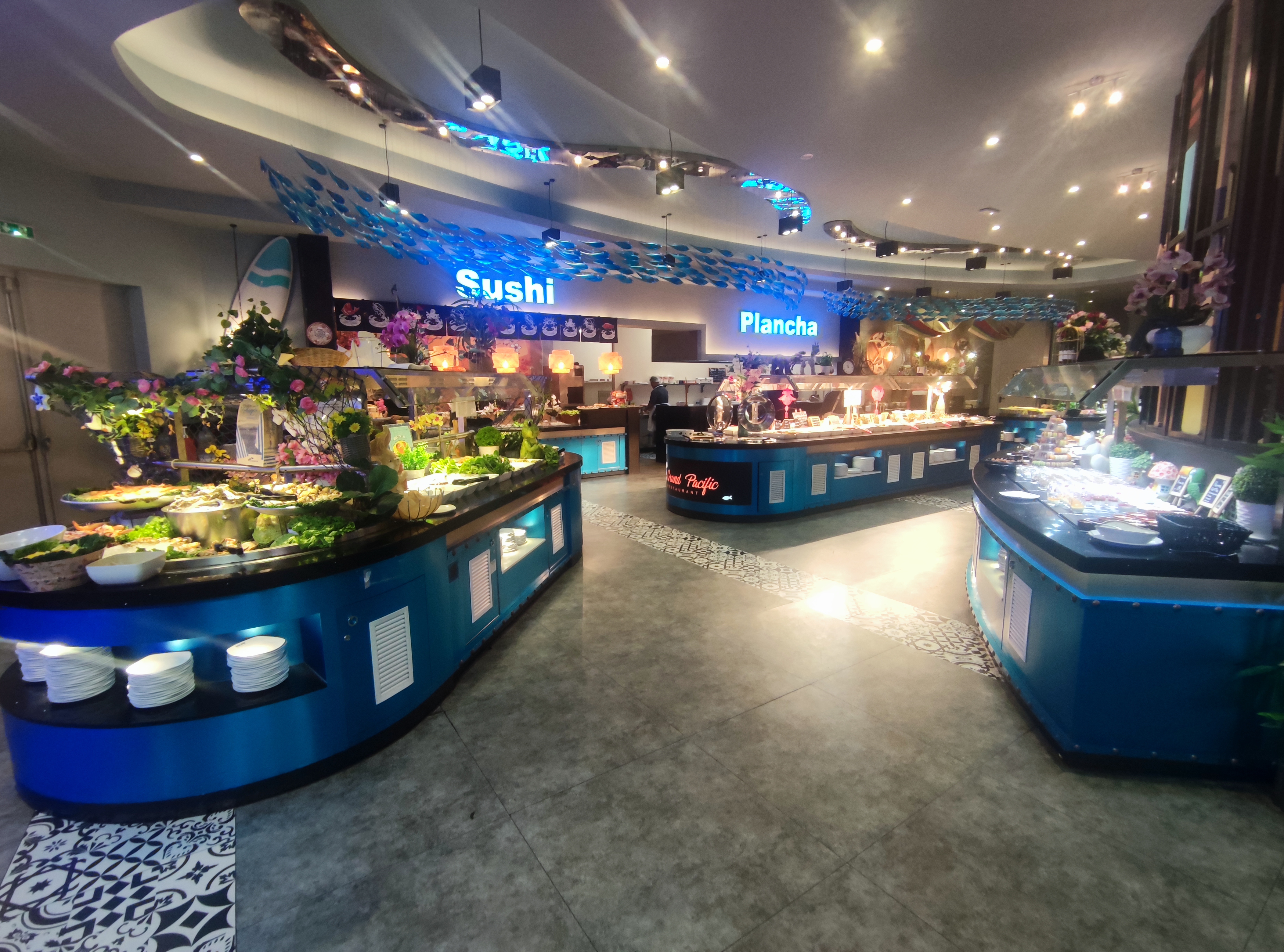 Je ne connaissais pas du tout la chaîne grand pacific, c est un buffet à volonté plutôt asiatique pour celui ci, le choix est extrêmement large, opulence de nourriture ! On y trouve des sushi, un coin grillade à faire à la minute, des entrées, du bœuf/poulet à toutes les sauces et un coin dessert immense. Le resto est sympa mais fait quand même cantine ! J y suis allé un lundi midi et à moitié plein c était déjà bien bruyant. Le service est correct sans plus, la majorité se fait en autonomie. Pour ma part je n'y retournerai pas