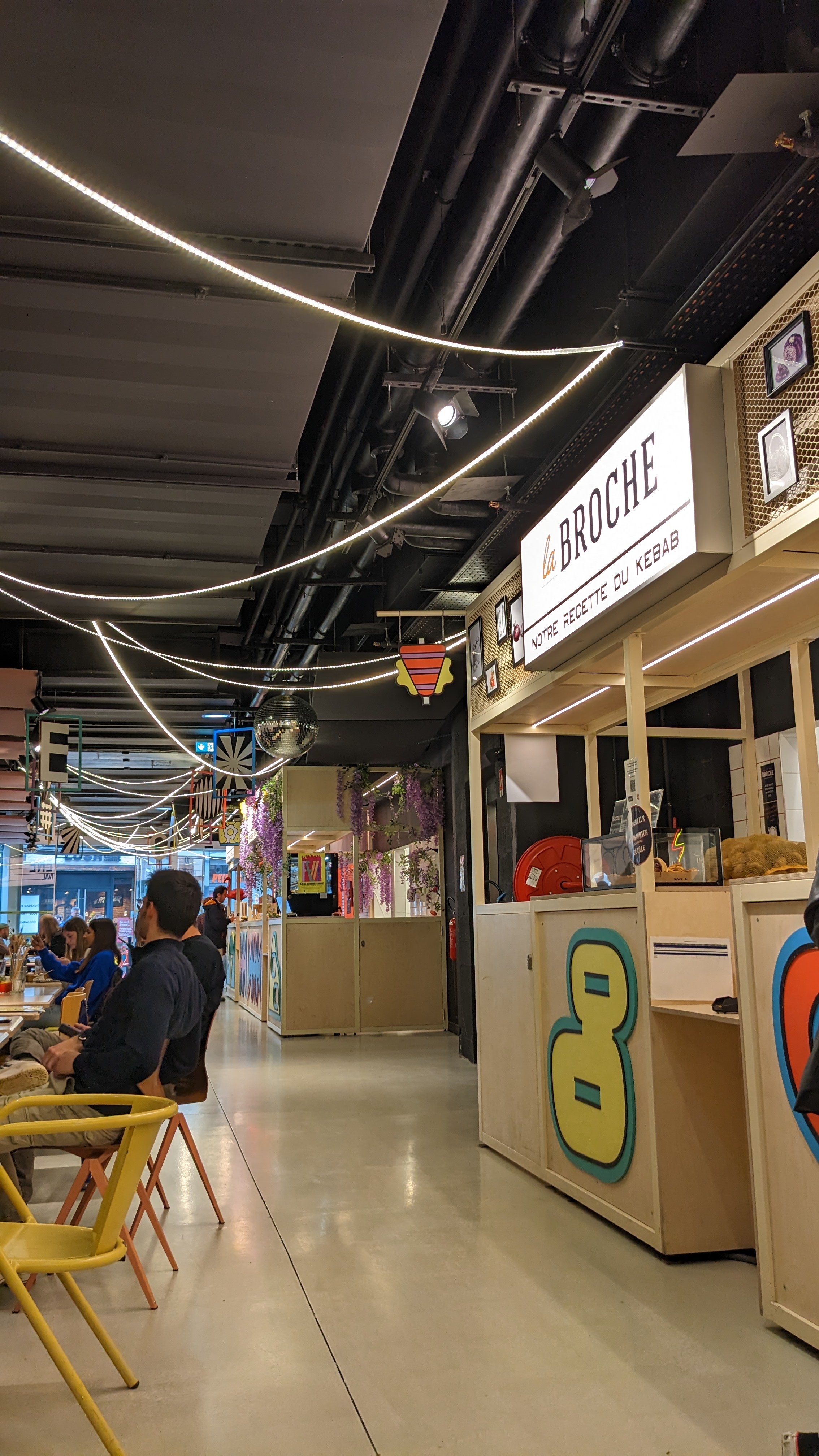 Chacun prend son repas dans le stand/univers qui lui convient et retrouve ses convives à table. C'est le principe de la foire alimentaire / good court des centres commerciaux américains. Bonne ambiance jeune et urbaine.