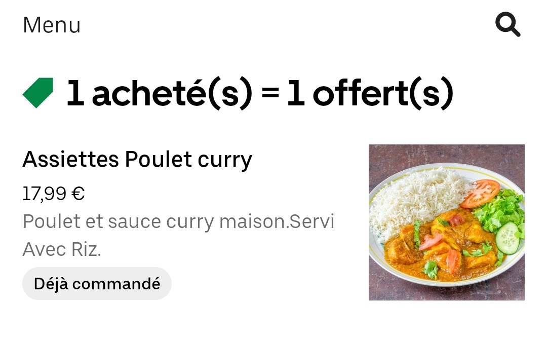 On nous prend un peu pour des cons avec le 1 acheté=1 offert sur Ubereats, le menu est à 13€50 avec accompagnement et boisson, et l'assiette seul est à 18€ ??! Pub mensongère malheureusement...