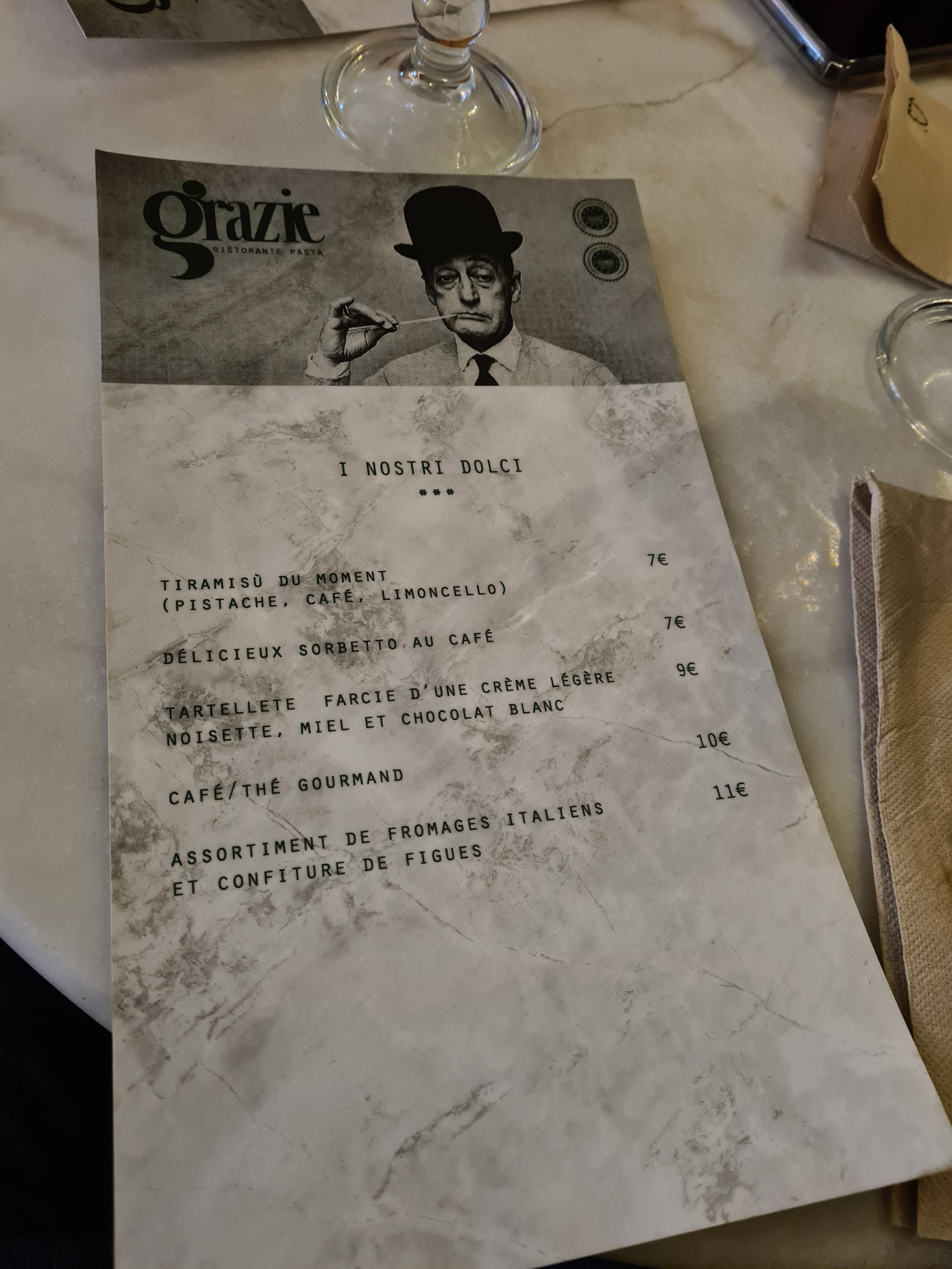 Deuxième fois chez Grazie Pasta, très peu de choix mais tout le monde est unanime c’est un délice ! En revanche nous étions vraiment très déçus du déroulement du service : nous réservons pour 20h nous somme servis très vite mais nous comprenons pourquoi… à peine le dessert avalé la jeune femme nous demande « vous voulez autre chose? Non? On vous ramène l’addition alors parce que le deuxième service doit commencer » en nous montrant les clientes qui attendaient. Il était alors 21h15. Un samedi soir … pas très agréable d’être mis à la porte aussi rapidement. Si le but était de manger vite fait nous serions allés dans un fast food ! La moindre des choses aurait été de prévenir lors de la réservation. En revanche le jeune homme qui nous servait était très gentil.