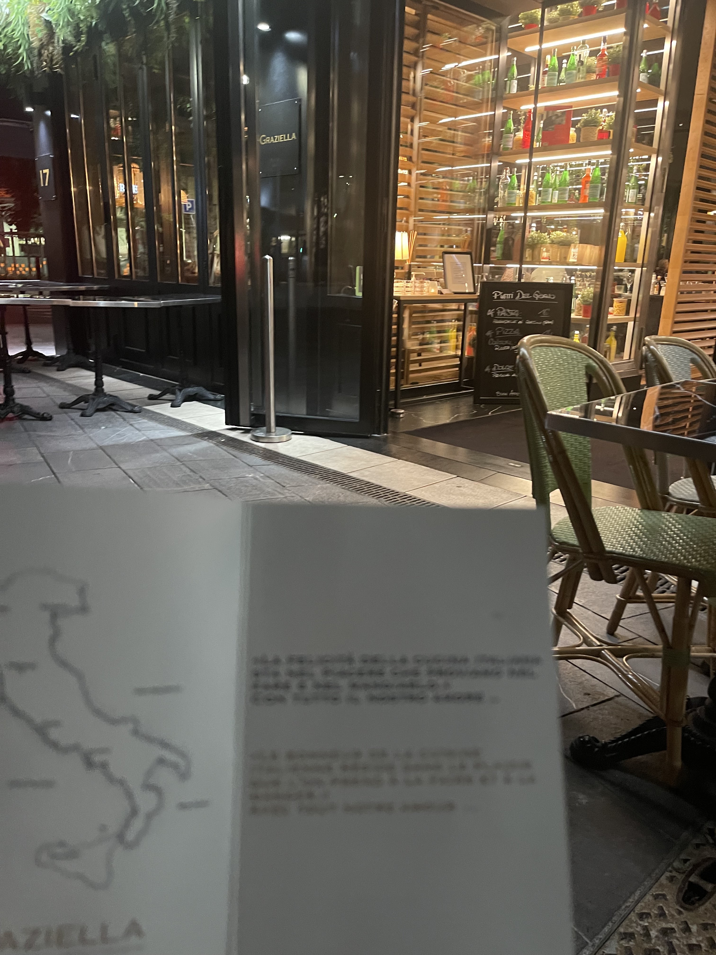 Ce soir, j'ai eu le plaisir de dîner avec mon chéri dans un merveilleux restaurant italien qui nous a enchantés. Dès que nous avons vu la carte, avec ses noms de plats en italien, nous avons été transportés dans une atmosphère romantique unique. La décoration sobre, alliant des nuances noires et des touches boisées, confère au lieu une élégance raffinée et chic.Le service était impeccable : les serveurs étaient efficaces, agréables et toujours prêts à nous aider avec le sourire. Quant aux plats, ils étaient tout simplement succulents, un véritable régal pour nos papilles. Je recommande vivement ce restaurant à tout le monde, que ce soit pour une occasion spéciale ou simplement pour savourer une délicieuse cuisine italienne dans une ambiance charmante.