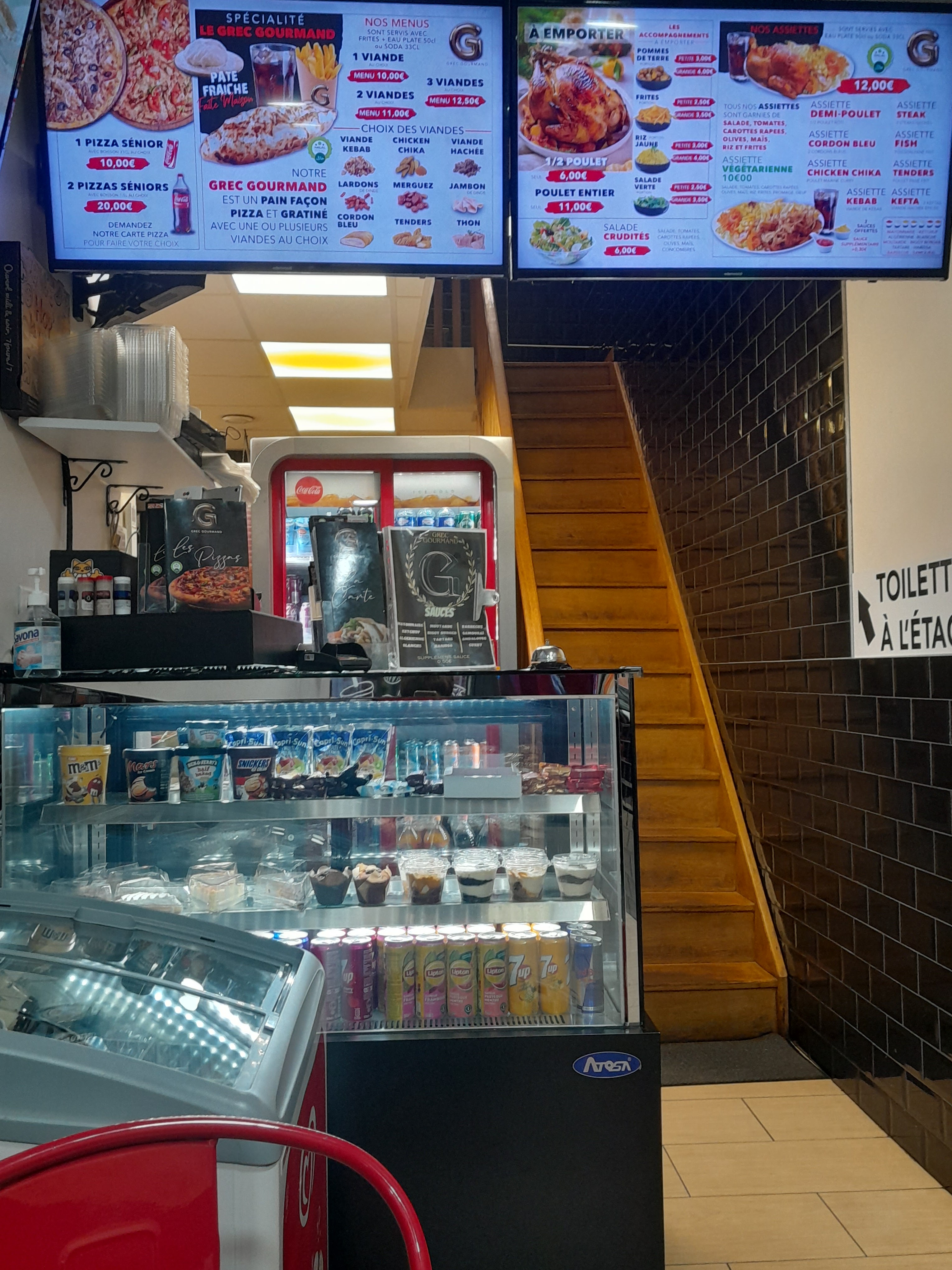 Ok ok accueil vraiment très sympas et nous avons été très bien reçu. Je suis venue avec le collègue et on a graille un grec au poulet, je dit OUI. On peut remarquer une carte très garnie. Je reconnais effectivement un léger parfum de regret qui chatouille mes narines du fait de ne pas avoir pu prendre des pizzas. Si vous aller dans ce grec vraiment prenez des pizzas elle sont faites par de vrais artisans qui aime leur métiers. De plus si je doit ajouter un atout majeur ici il y'a des boisson qu'on ne trouve pas partout. Exemple : fanta fraise kiwi. (Un régale pour les papilles. J'ajouterais un dernier mot pour dire que le personnel est très agréable.