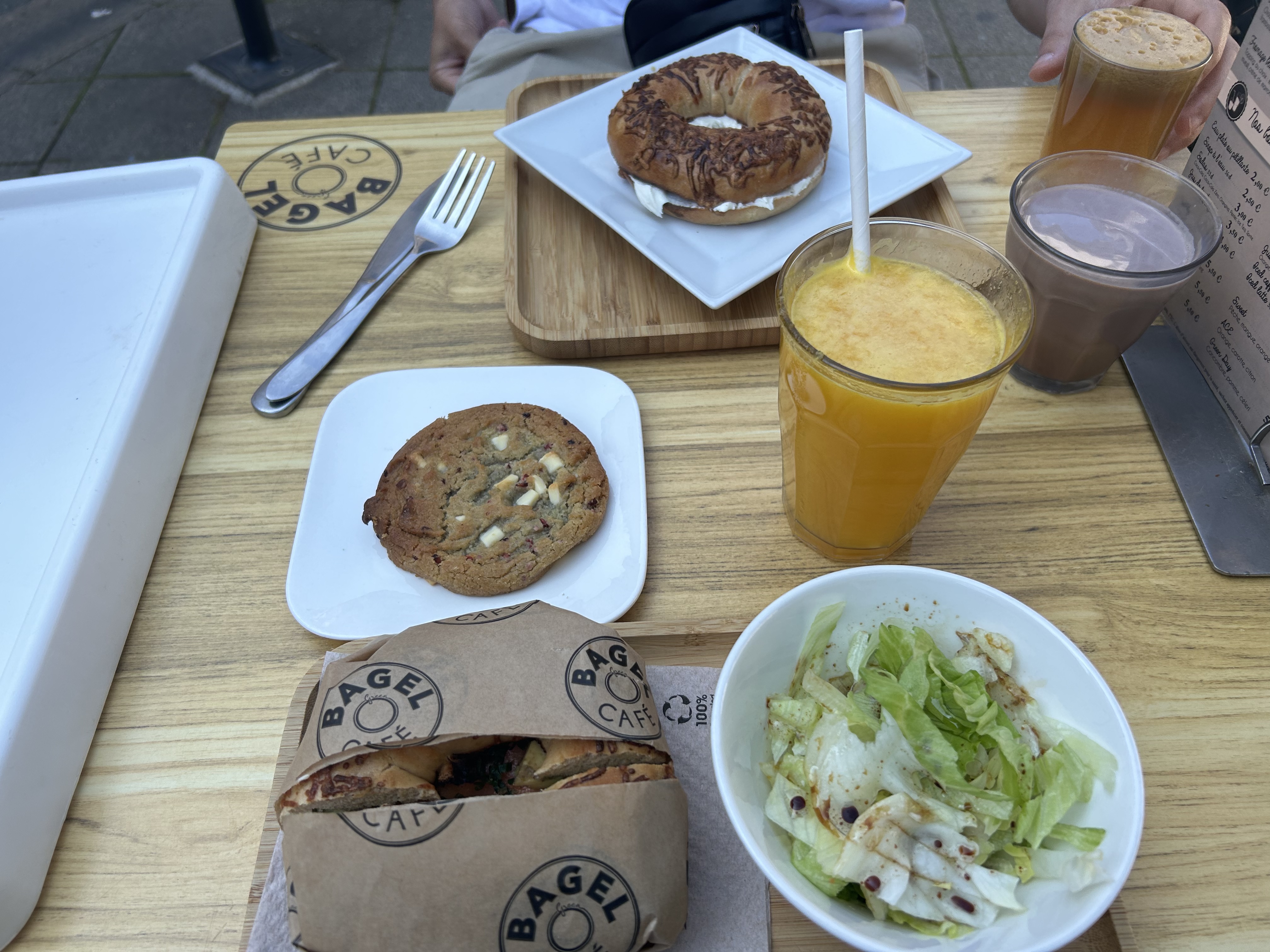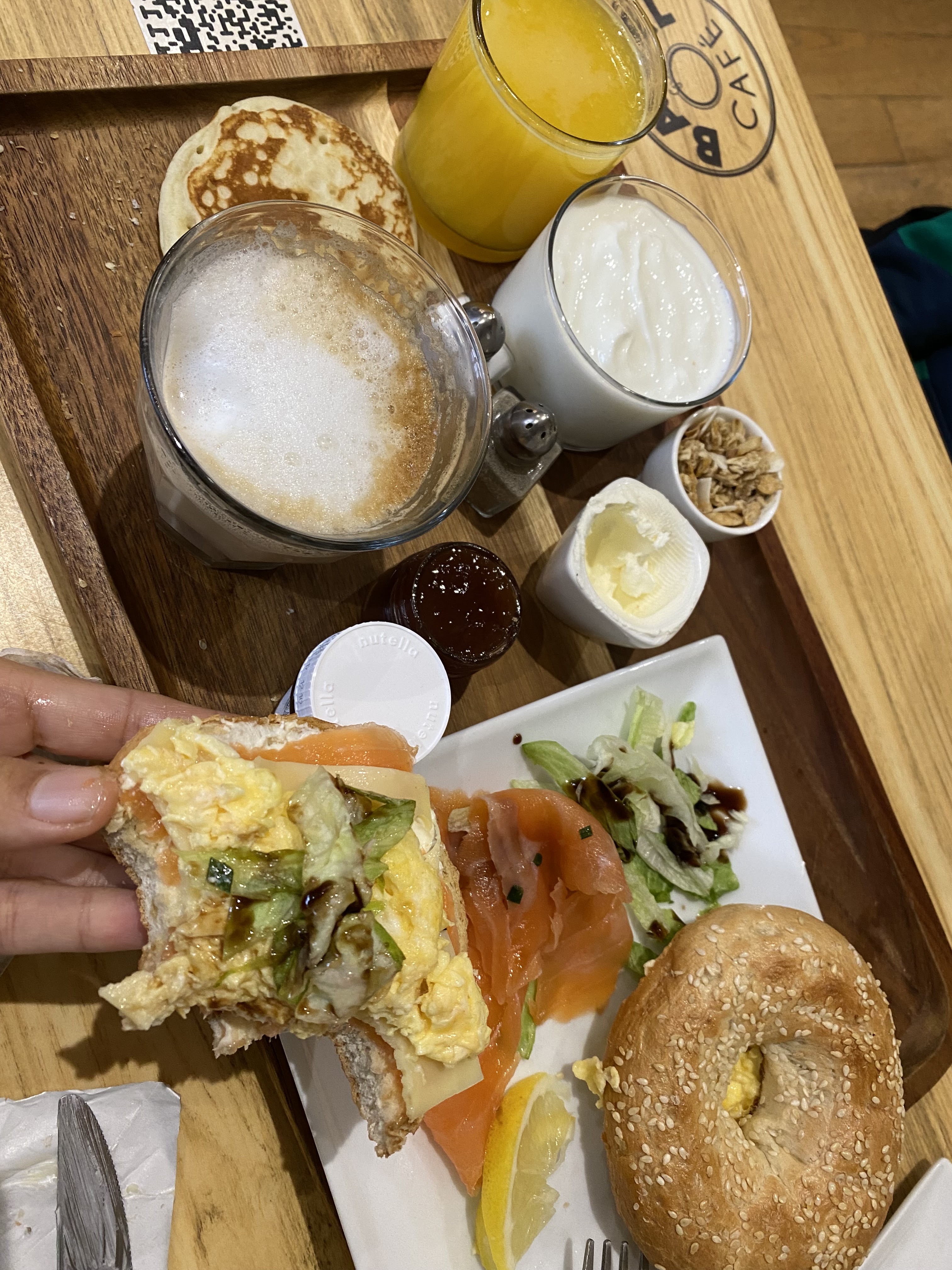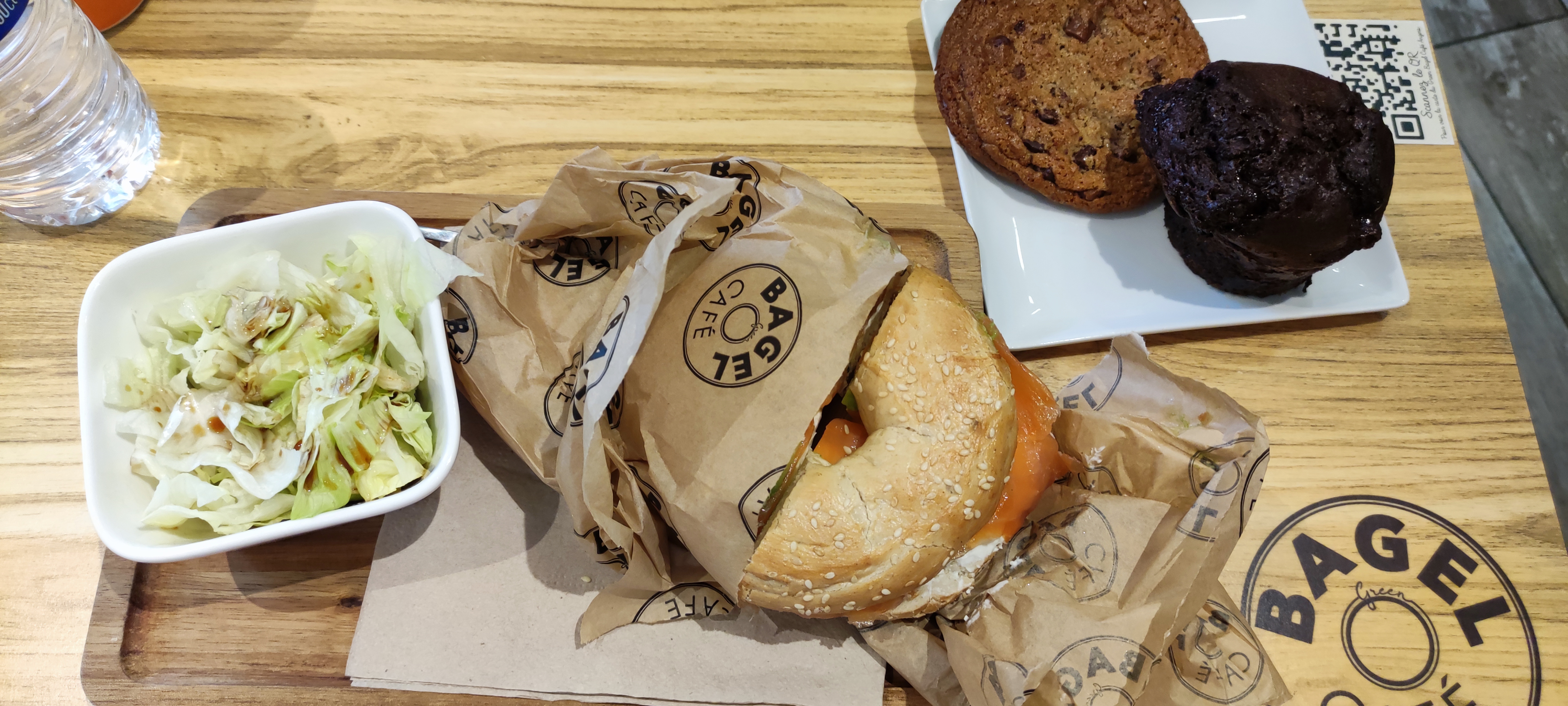 Nous avons petit déjeuner chez Green Bagel Café. Le service était bon. Néanmoins, le pain utilisé pour le bage était un peu sec. J’aurai préféré un bagel moelleux. Sinon, les boissons étaient fraîches et bonnes !