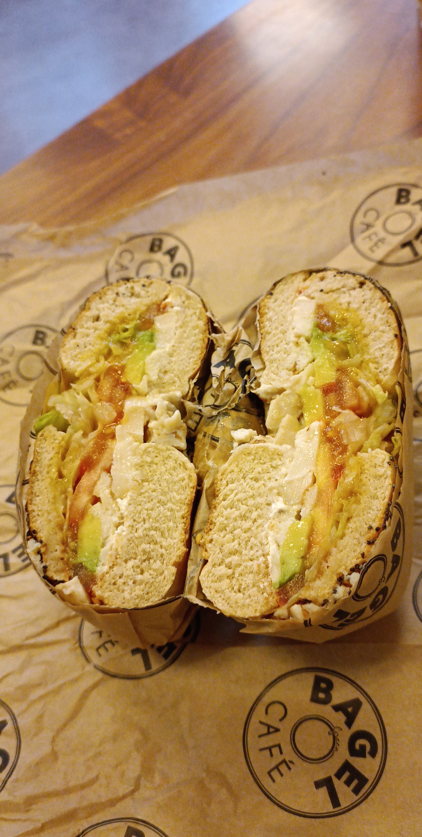 Un peu déçus car les bagels végés ne sont pas inclus dans les formules donc servis sans accompagnement ce qui est totalement incompréhensible. De plus, lors de la commande nous avons demandé une formule avec un bagel végé et le serveur ne nous a pas dit que ce n'était pas possible, ce n'est qu'au moment de servir que nous nous sommes posé la question. Le concept est bon, l'endroit un peu petit donc malheureusement bruyant mais tout de même agréable. Seulement le côté végé à retravailler car malheureusement trop pauvre. Nous étions 3 et 2 d'entre nous ont trouvé que la formule avec la boisson et le dessert n'était pas suffisante niveau portion. Les muffins sont industriels et celui au Nutella n'en contient qu'une toute petite noisette.