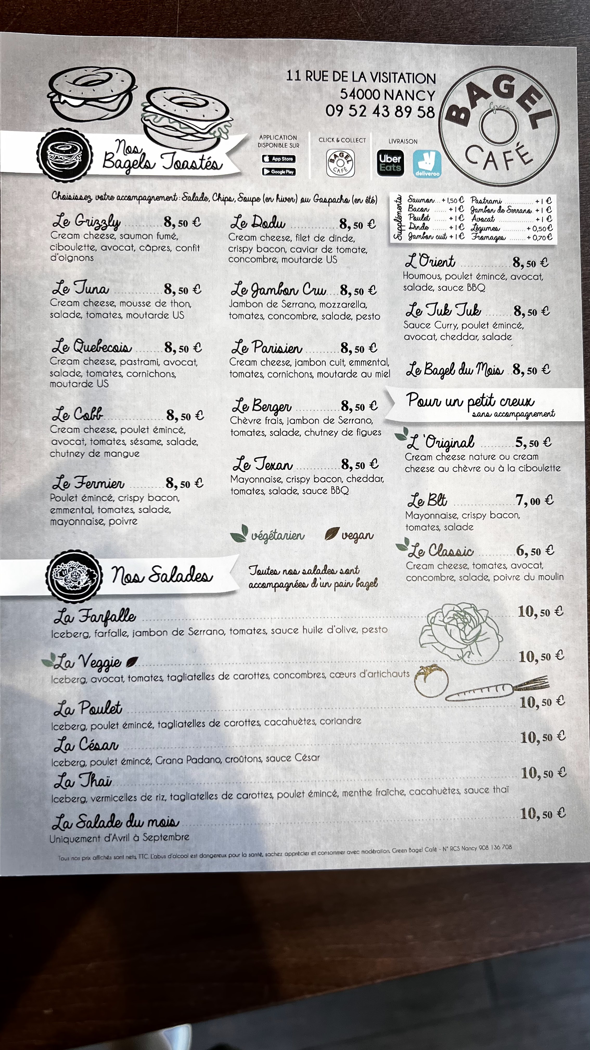 Le personnel souriant et aux petits soins vous accueille dans ce cadre cosy : la terrasse à l’arrière nous a beaucoup fait envie ! Les bagels sont délicieux et je recommande le moccachino. Mon amie vegan a trouvé son bonheur dans les généreuses salades du menu : il ne manque à cet établissement que le cream cheese végétal pour être parfait ! 🍃 En attendant c’est le rapport qualité prix qui lui permet de décrocher ses 5 étoiles, bien méritées 💕