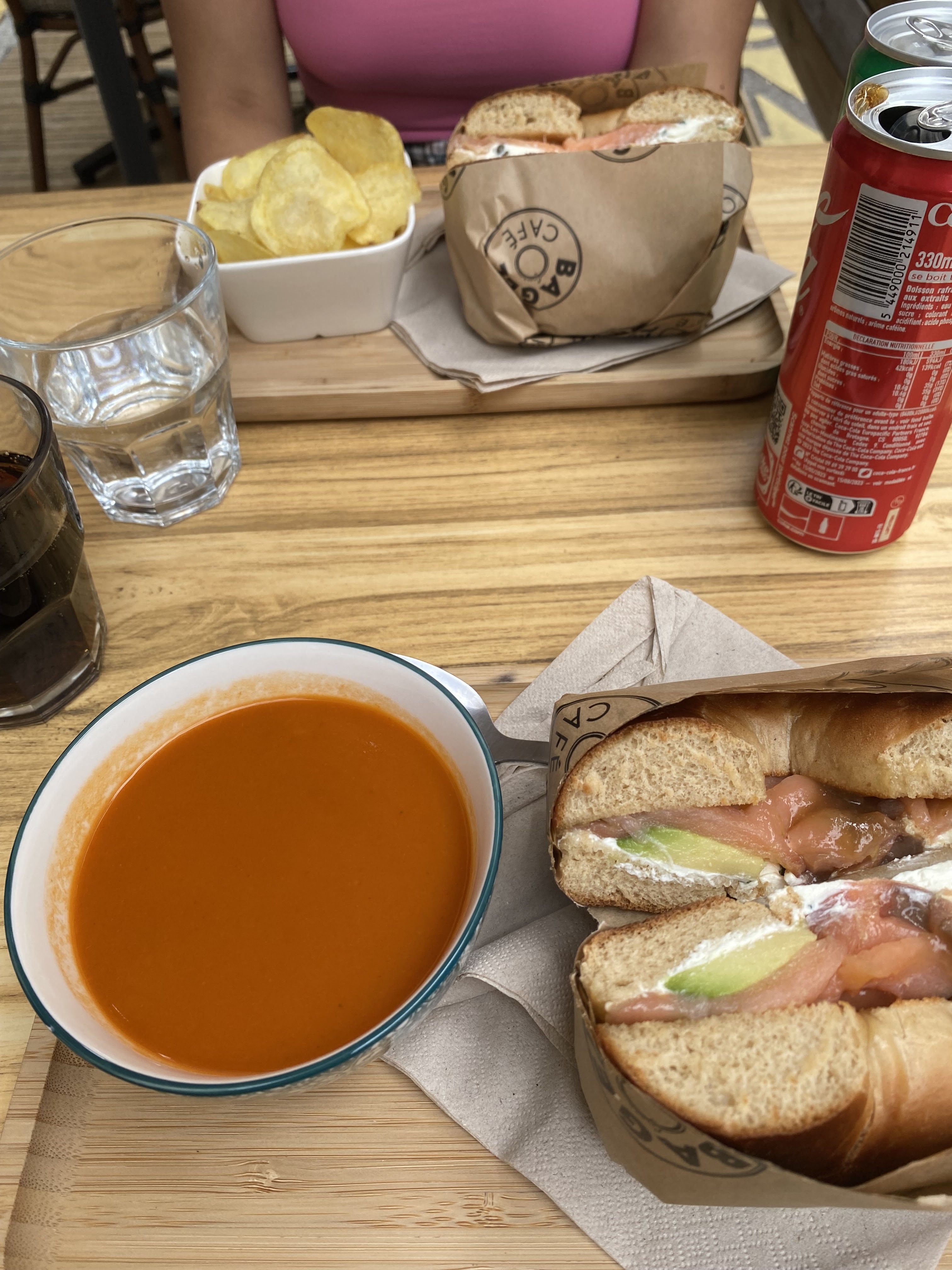 Un joli endroit, des employés très souriants, notamment Solène qui nous a servi :) assez simples et rapides au niveau du service, le gaspacho était délicieux, malheureusement les bagels manquaient un petit peu de saveurs