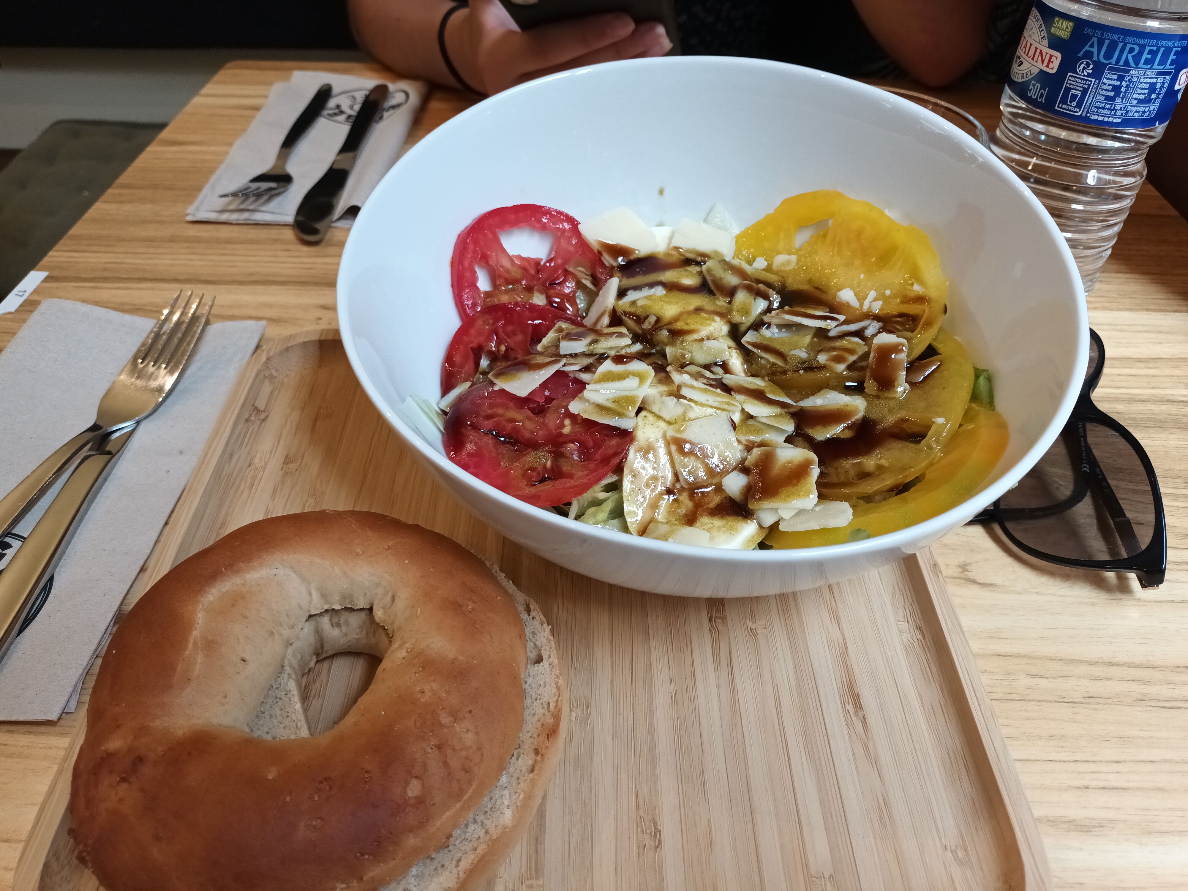 Accueilli par Solène, installé en terrasse dans l'arrière du restaurant, au calme, bagel délicieux et l'accompagnement d'un gaspacho à la tomate bien fraîche. C'est un sans faute. Je recommande et nous reviendrons