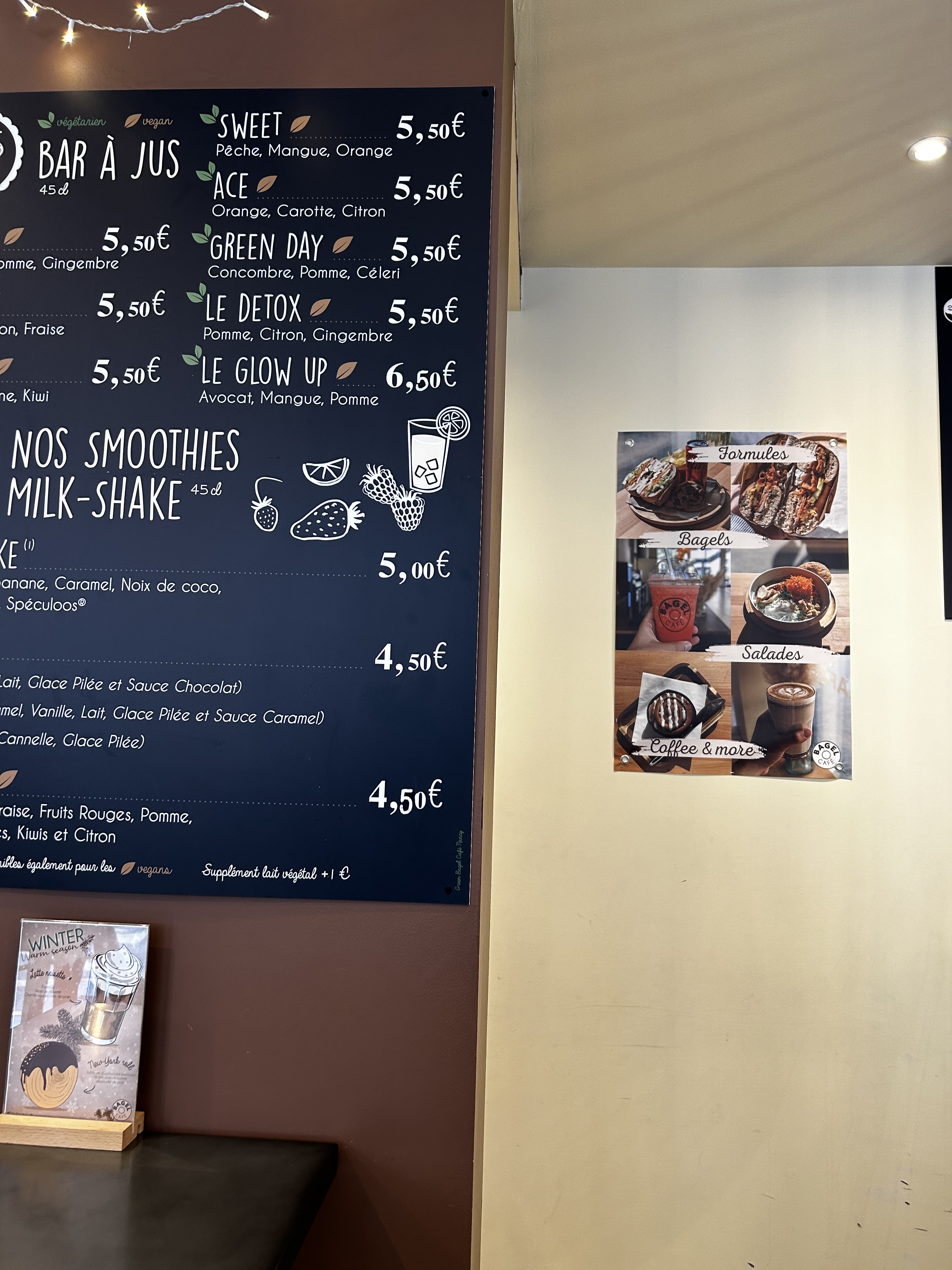 Service aimable, carte sympa, terrasse côté rue qui reste agréable même si la rue n'est plus piétonne à ce niveau. Le service est rapide, on est bien dans un fast food. Les bagels sont faits à la commande donc pas de problème en cas de changement d'ingrédients, ils sont assez souples là dessus. Par contre, on ne vous proposera pas de carafe, l'accompagnent du bagel n'est vraiment pas indispensable : chips (classique hein) ou salade (un petit bol, rien de fou) ou, en été, gaspacho (pas testé mais c'est peut-être le seul accompagnement maison). Le bagel en lui même est très bon mais, vu l'accompagnement, il ne faut pas avoir trop faim. J'ai testé le muffin spéculoos qui était original et très bon mais d'une taille plutôt modeste. La vitrine de pâtisserie est bien fournie et appétissante. Les parts de gâteau sont à 3,50€. Tous les bagels + accompagnement sont à 7,50. J'avais pris un menu avec boisson et petite pâtisserie pour 11,50€ mais je trouve ça plutôt cher pour la quantité. A part le prix et les accompagnements ridicules, tout le reste est plutôt sympa! Edit : en prenant un menu petite faim avec le dessert au lieu de la boisson et la soupe chaude en accompagnement, j'ai trouvé que c'était assez copieux (et bon) pour 9,50. Et ils ont des carafes d'eau... même si absolument personne n'en prend. Edit mars 2023 : les prix ont augmenté de 1€, comme à peu près partout, mais il y a une carte de fidélité. Je suis devenu un habitué car c'est bien adapté pour mes enfants. J'ai testé un petit déjeuner c'est très sympa et ça ouvre dès 8h! On peut facilement y rester pour travailler, des prises sont disponibles un peu partout.